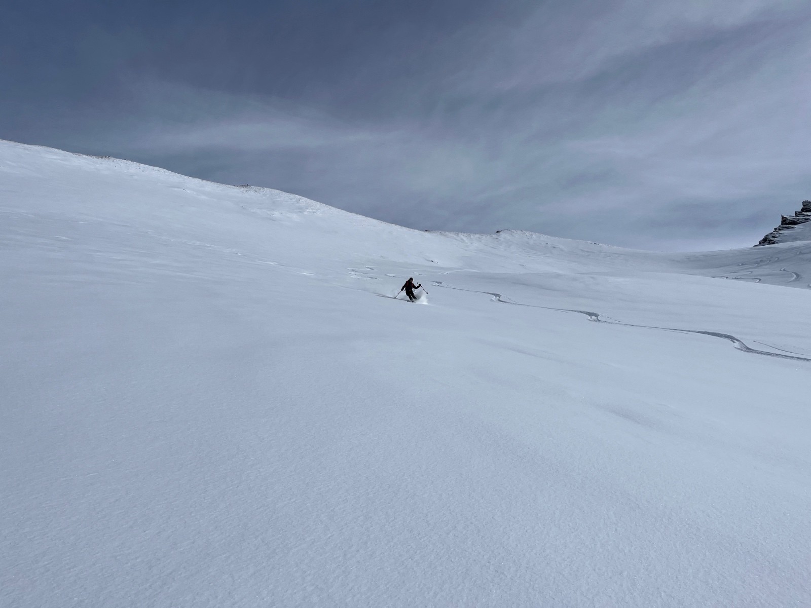 Conditions pour le ski : bonne surprise ! La neige n’a pas du tout pris le vent dans la combe NW qui mène au bivouac Matteo Corradini. Nous avons skié donc 15 à 20 cm de poudreuse très légère (perte de cohésion en cours) sur fond dur ou portant (neige humide en dessous ?), un régal.