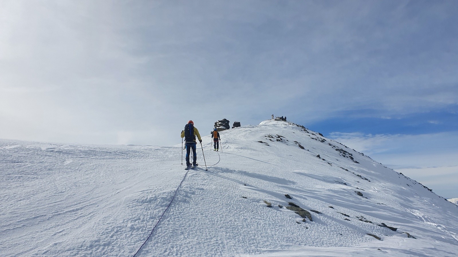 Deuxième jour avec comme objectif la Testa del Rutor en montant par le glacier du Grand et on ne sait pas trop dans quel vallon descendre : ça sera en aller-retour comme le vallon de l'Invernet est plus raide donc qui garde moins la neige froide. Montée efficace jusqu'au glacier du Rutor puis vue magnifique qui fait oublier la longueur de l'itinéraire jusqu'au sommet !