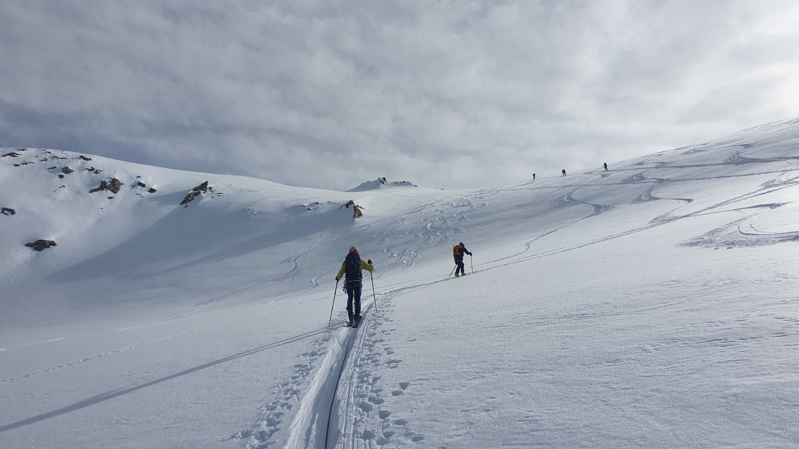 Petite montée (bien au Soleil...) jusqu'à un col sans nom à côté des Oeillasses en suivant les traces des propriétaires du refuge : belle descente dans un beau vallon !