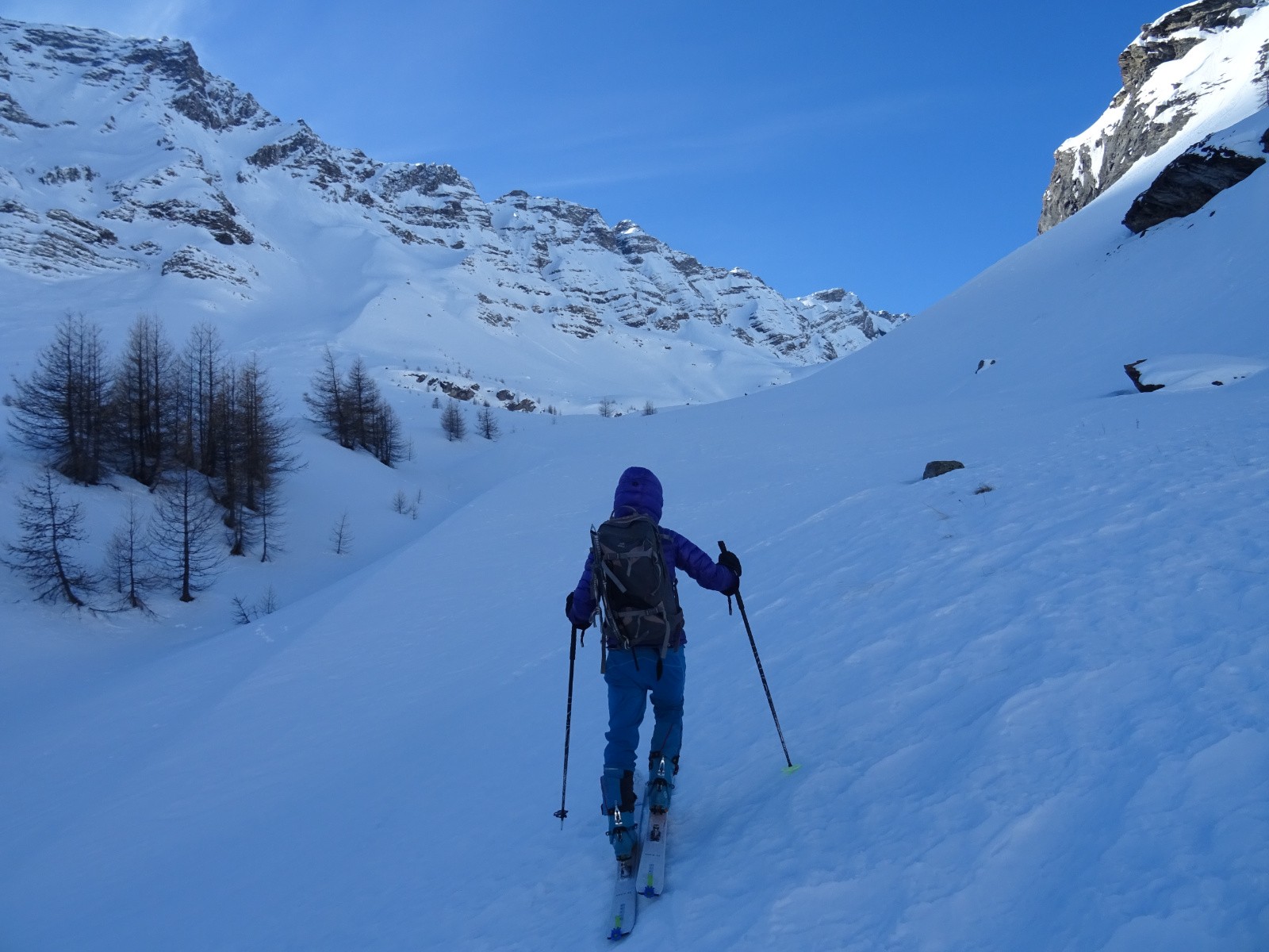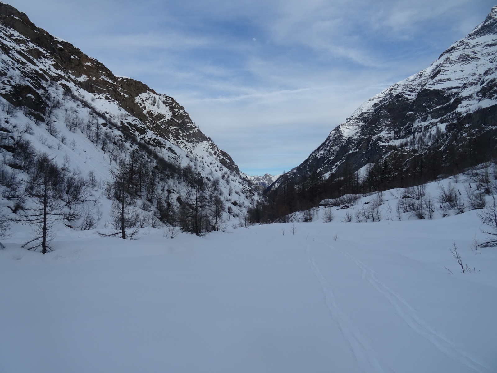 En zonant sur les topos des Écrins Est on s'accorde sur la Tête des Bertrands. Le vallon a l'air grandiose, l'approche un peu longuette, mais sur le papier ça ne nous fait pas peur. On est contents d'arriver à monter la voiture à 1350m. On part tot, un peu avant 7h, en prévision d'une longue approche. On démarre sur la route déneigée, et bien verglacée, il ferait jour qu'on s'y verrait dedans! Le GR enneigé en continu aurait été une meilleure option, ce sera celle du retour. Passé le parking d'été de l'Ourmande on croyait en avoir fini de l'approche mais c'est encore un long vallon plat qui s'étend devant nous. Quelques traces de skis qui montent vers la crête de Dormillouse, nous poursuivons nous poursuivons notre longue remontée du vallon. Enfin on atteint le verrou après 2h30 de plat, on espère que la suite sera chouette parce que quand même fallait se motiver pour arriver là ! Ça monte direct assez raide pour passer le verrou, une ou 2 ravins en cours de route, puis finalement on rejoint le vallon supérieur par une petite couloir qu'on remonte à pied. C'est un nouveau décor grandiose qui s'offre à nous! Nous voilà rassuré pour quant à la skiabilité du secteur. Un peu de soleil en prime, c'est pas de refus.