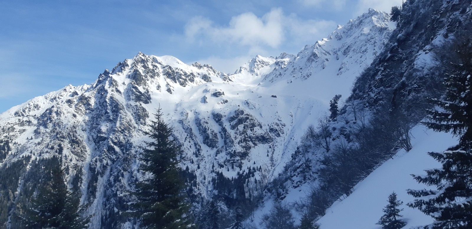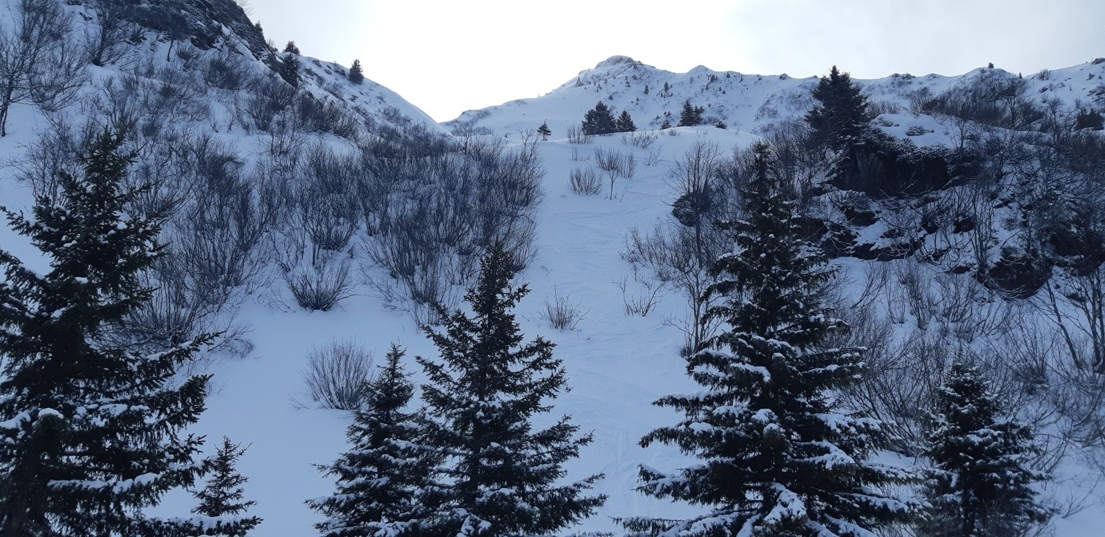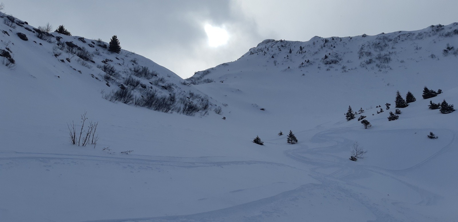 Conditions pour le ski : Faible enneigement sous le refuge du Mollard, puis poudre sur fond dur dans les pentes NW du Mt St Mury. Neige irrégulière en pentes N.