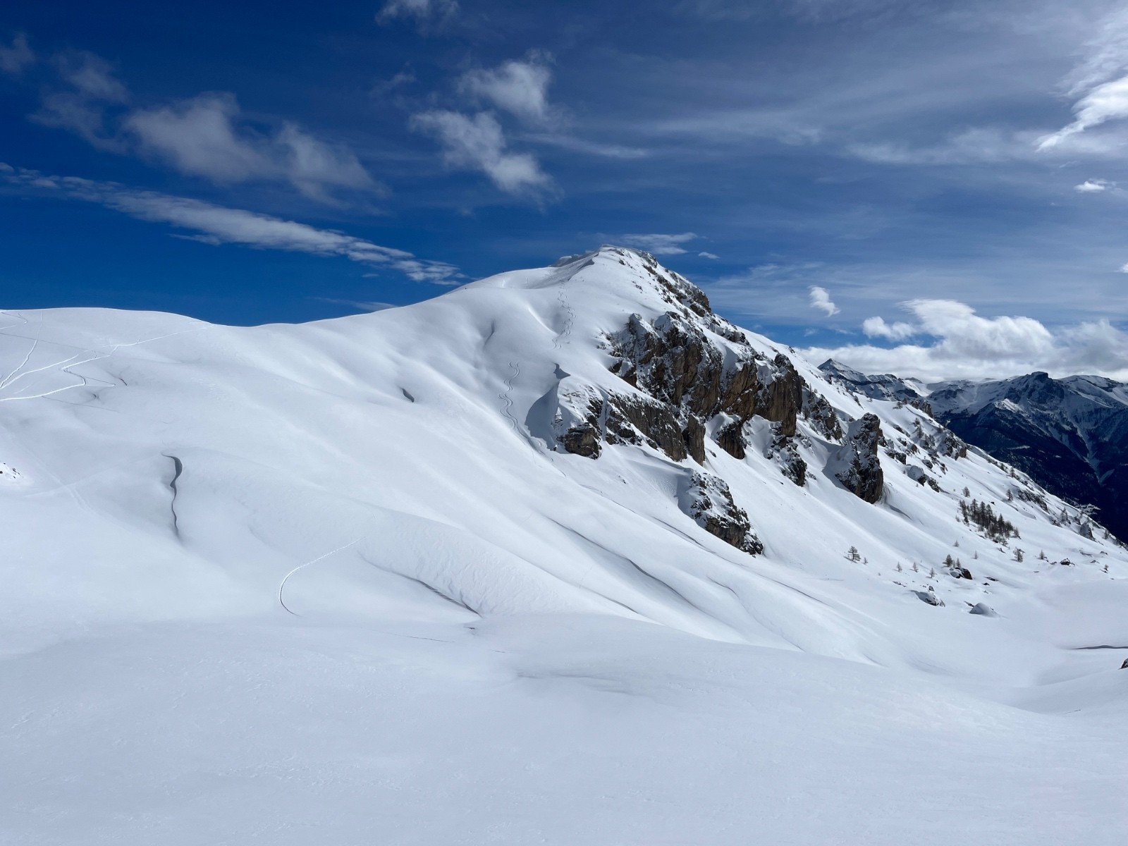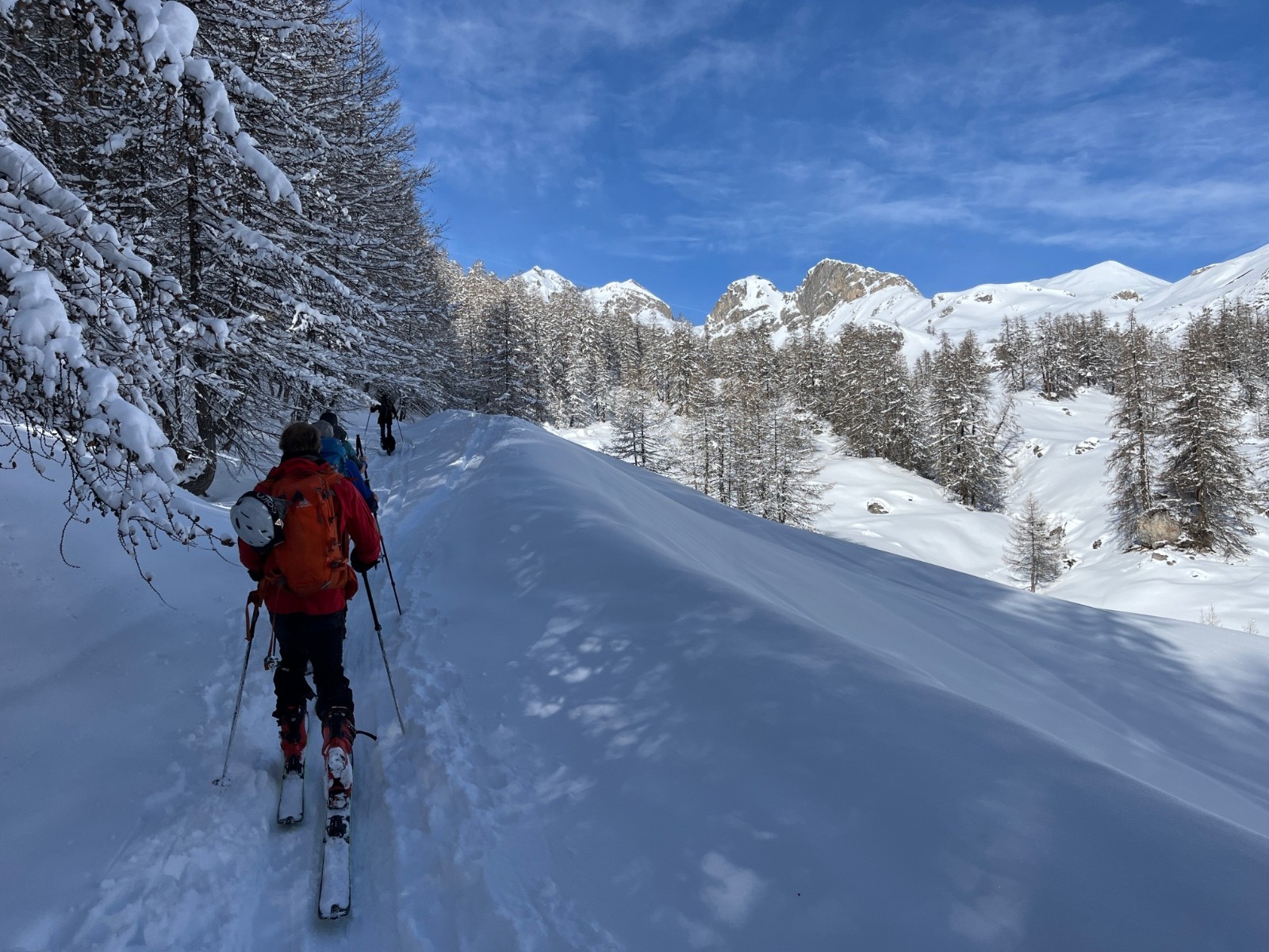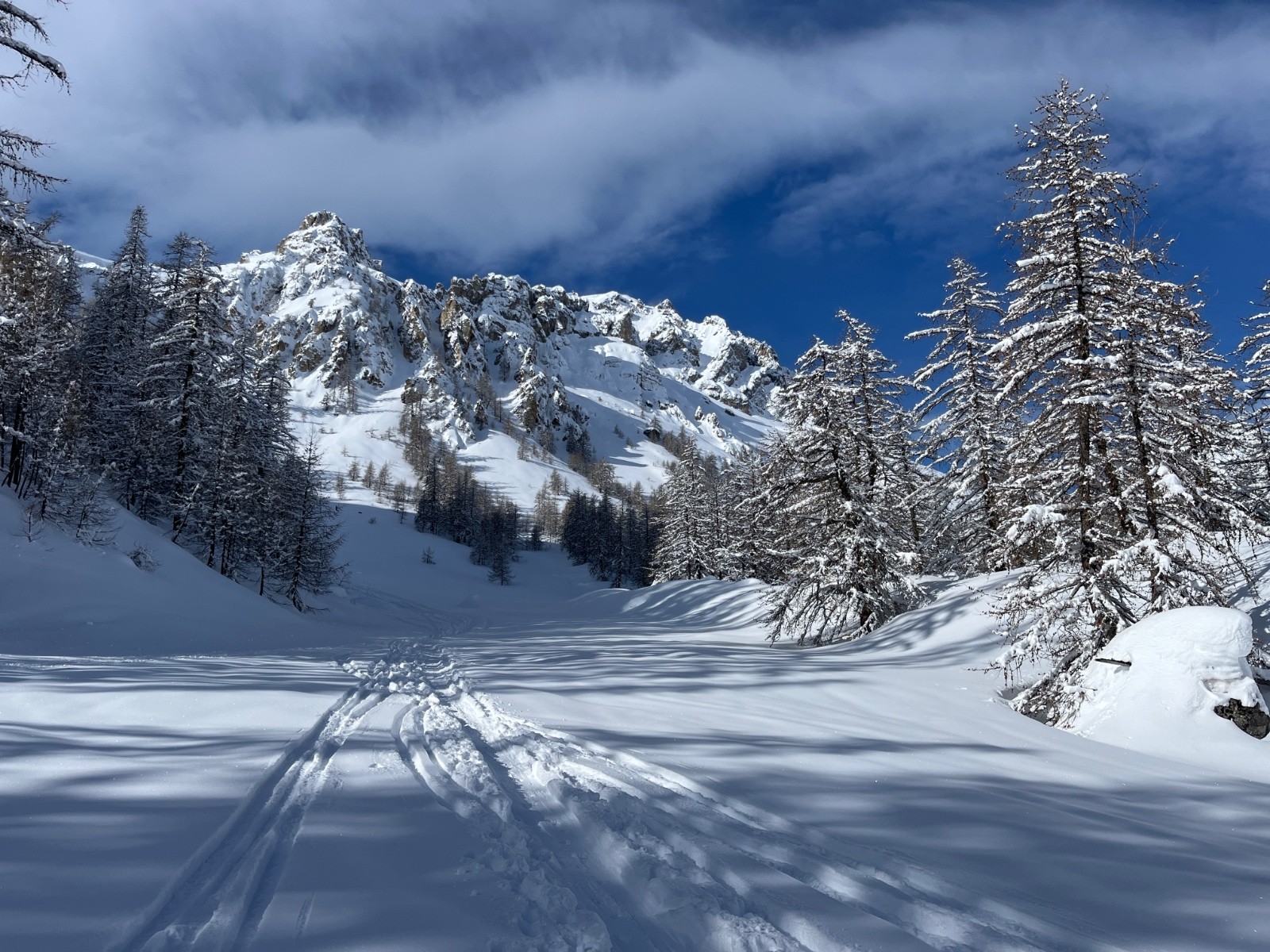 - Première descente, depuis le sommet de la Croix d'Aquila, par le ravin du Jeu de la Paume : 30-40 cm de poudreuse avec rebond parfait sur les 2/3 de la descente, fantastique. Sur le 1/3 inférieur, on est resté dans le mélezin, en rive droite du ravin, en bordure immédiate de celui-ci : le fond dur est ici présent. A noter que le ravin ne semble pas très praticable sur cette partie basse. Ne pas s'enfoncer plus dans le Bois d'Aval car il s'agit d'une zone d'hivernage du tétras-lyre.