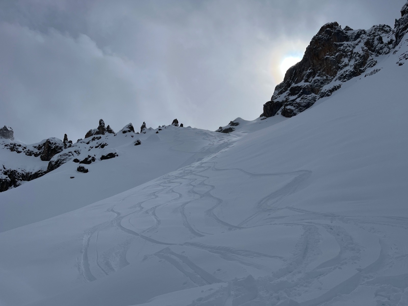 - Seconde descente, depuis la Crête de la Bressière, vers les Partias : pareil, 30-40 cm de poudreuse, peu densifiée par le vent, avec rebond parfait car couche de neige récente en cours de tassement. Un régal ici aussi, malgré le jour blanc qui pointe son nez. Sous les Partias, avec les fortes rafales de l'après-midi, la neige de surface commence à cartonner.