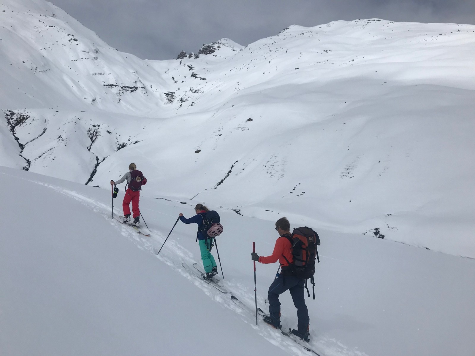 Le lendemain, le col des Aiguilles d’Arves nous tente bien, les filles sont super motivées il y a 900m de deniv et Florian nous a indiqué un passage sympa pour la descente qui permet de visiter un peu le pays… Évidemment les 3 groupes qui partent en même temps que nous prennent vite une longueur d’avance mais du coup on est seuls et c’est chouette ! L’arrivée au col est dantesque, nous perdons une quinzaine de degrés et le vent nous réveille ! Descente en poudre non tracée grâce aux conseils de Florian. Les filles sont aux anges et nous aussi…