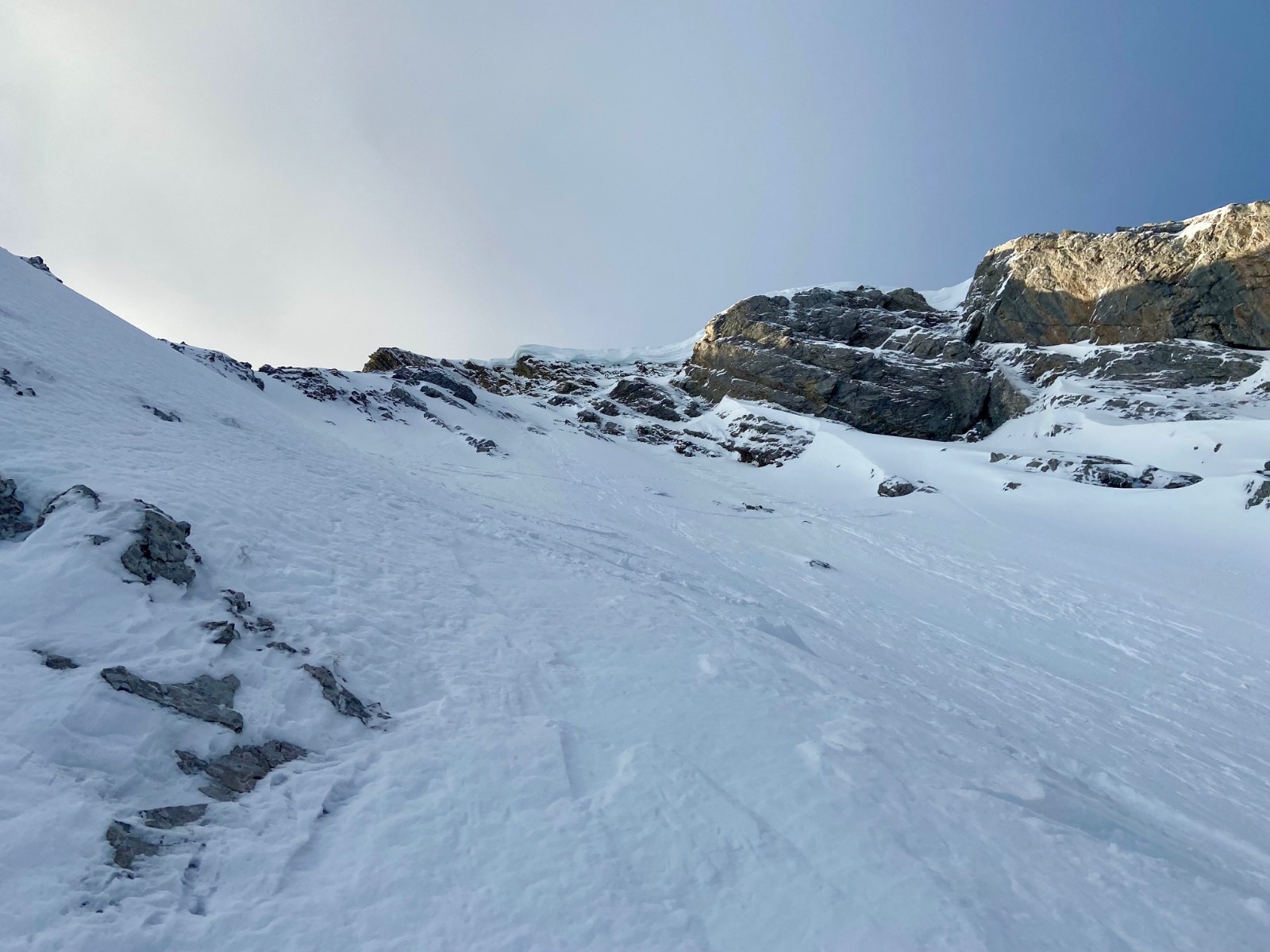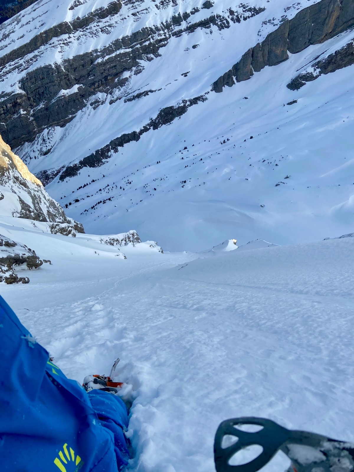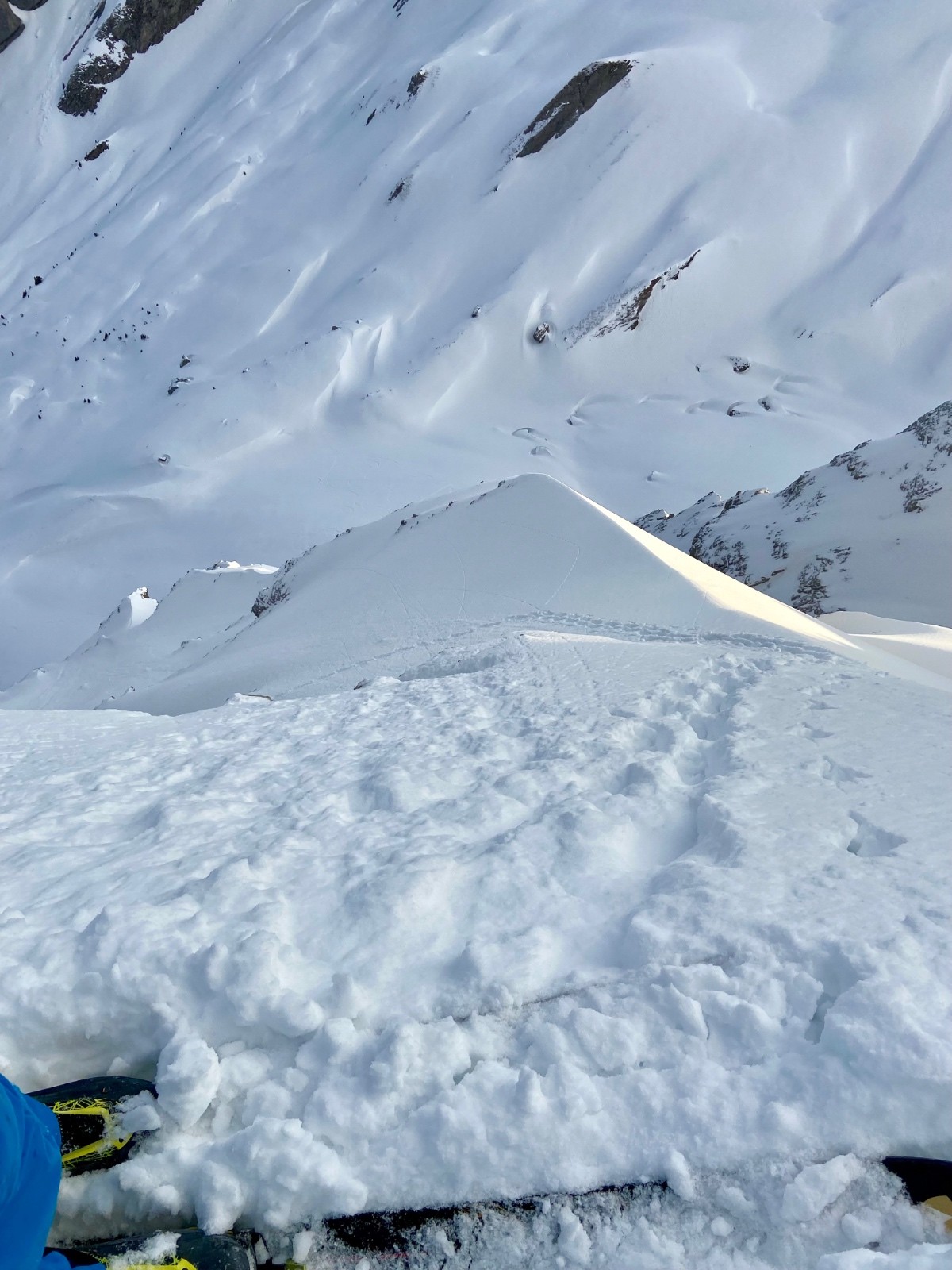 Une sortie de proximité pas très originale, mais qui permet de faire quelques beaux virages dans une pente courte mais soutenue. Comme d'hab, je n'ai pas traversé à droite sous la corniche vraiment gigantesque, mais suis monté au plus haut sur l'éperon final. Les conditions étaient vraiment top, à part deux virages sur fond gelé, il faut rester vigilant dans les pentes à ces altitudes.
