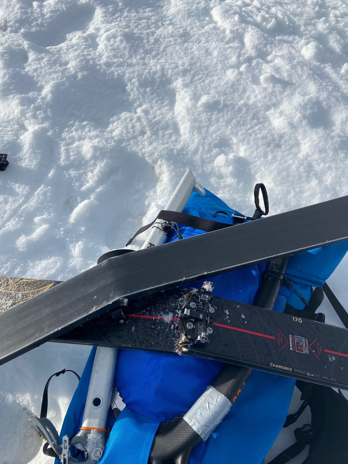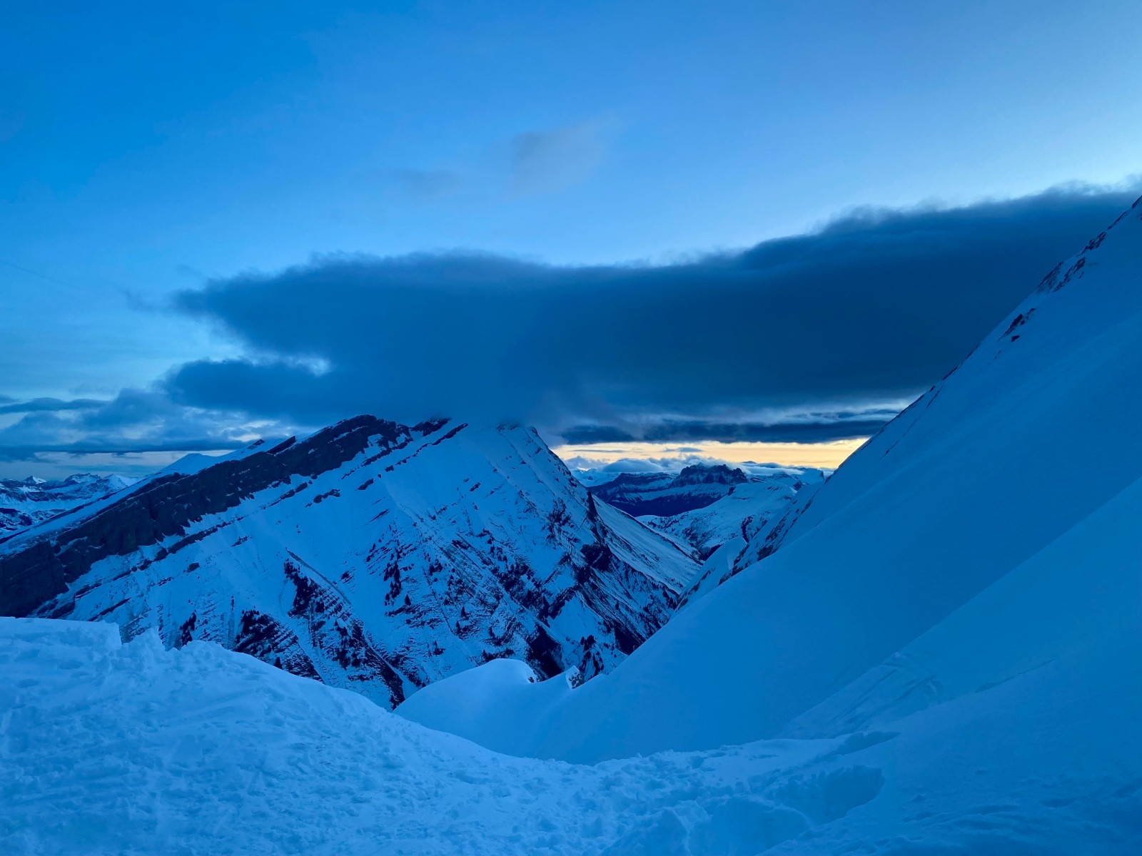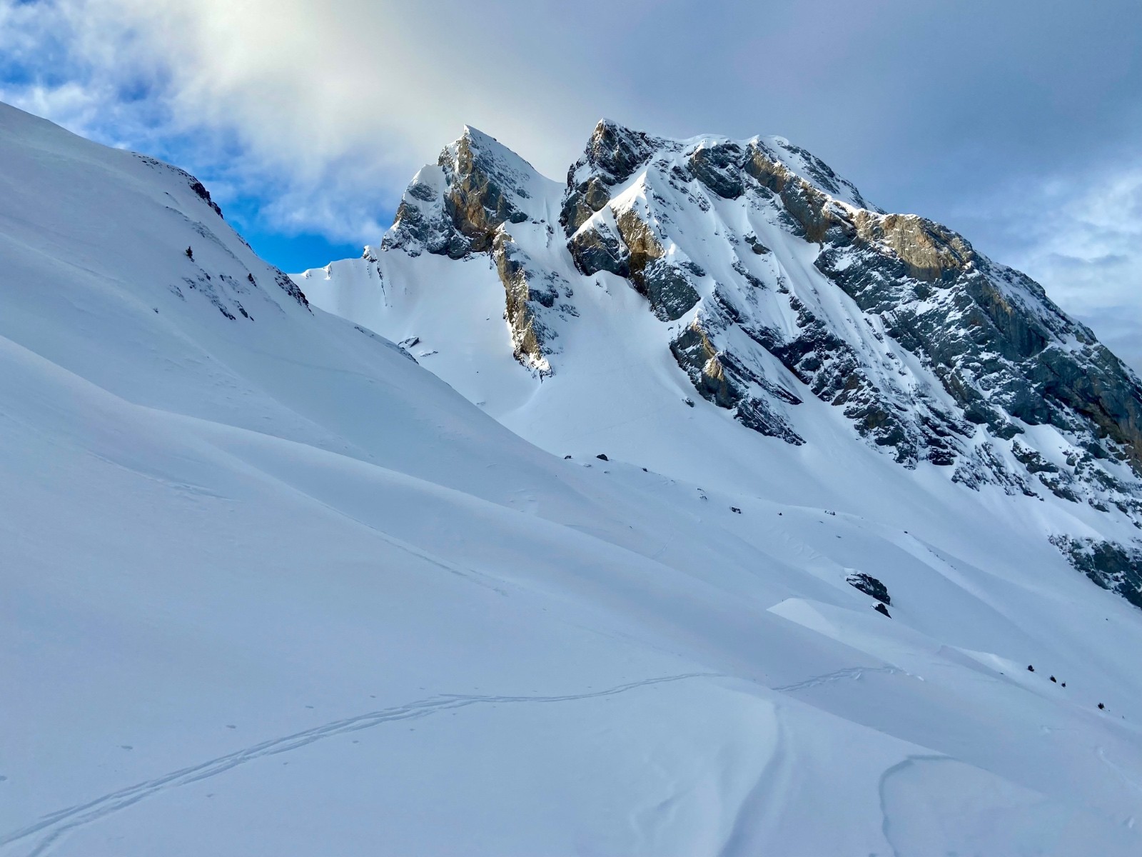 Une sortie de proximité pas très originale, mais qui permet de faire quelques beaux virages dans une pente courte mais soutenue. Comme d'hab, je n'ai pas traversé à droite sous la corniche vraiment gigantesque, mais suis monté au plus haut sur l'éperon final. Les conditions étaient vraiment top, à part deux virages sur fond gelé, il faut rester vigilant dans les pentes à ces altitudes.