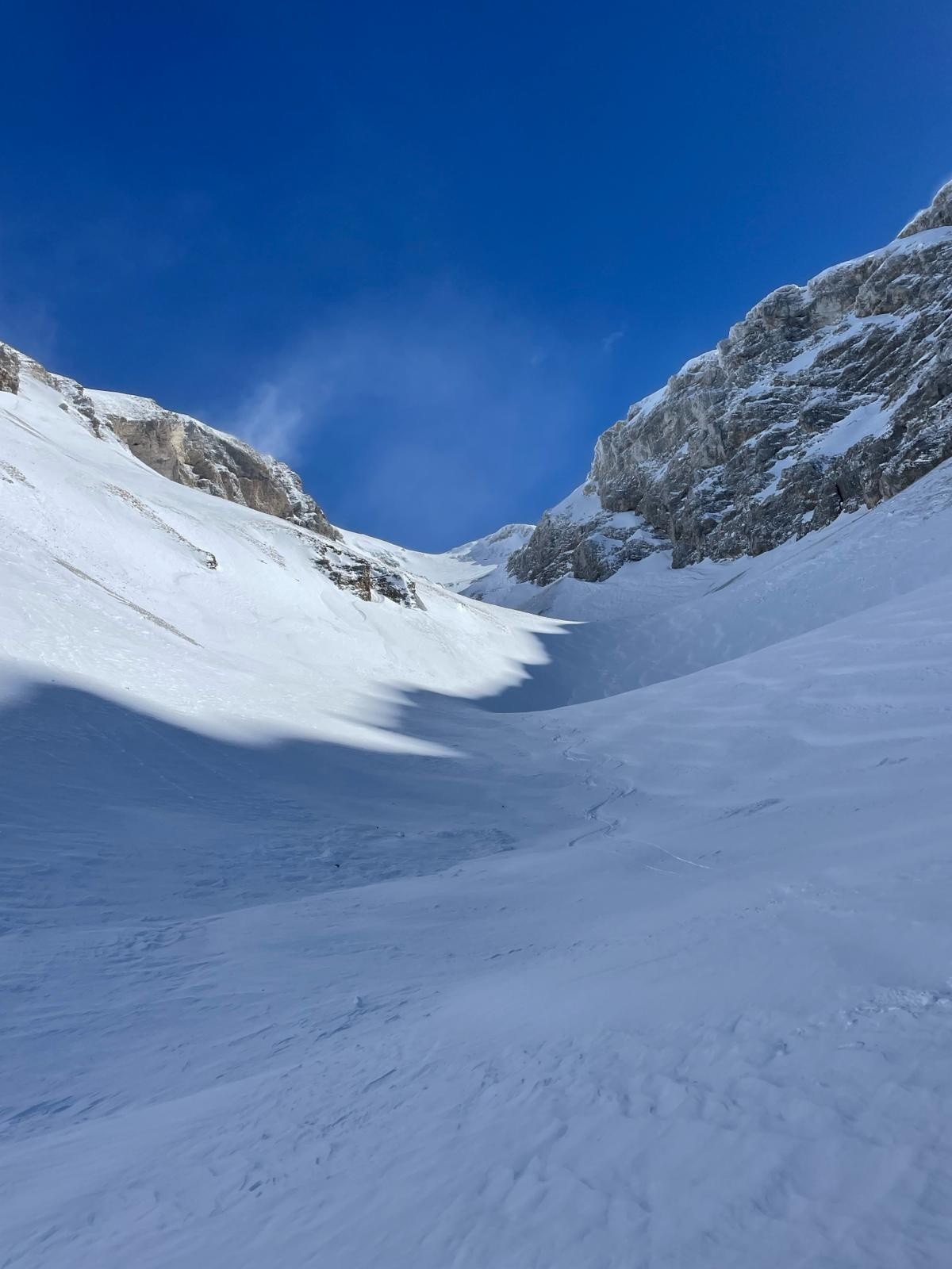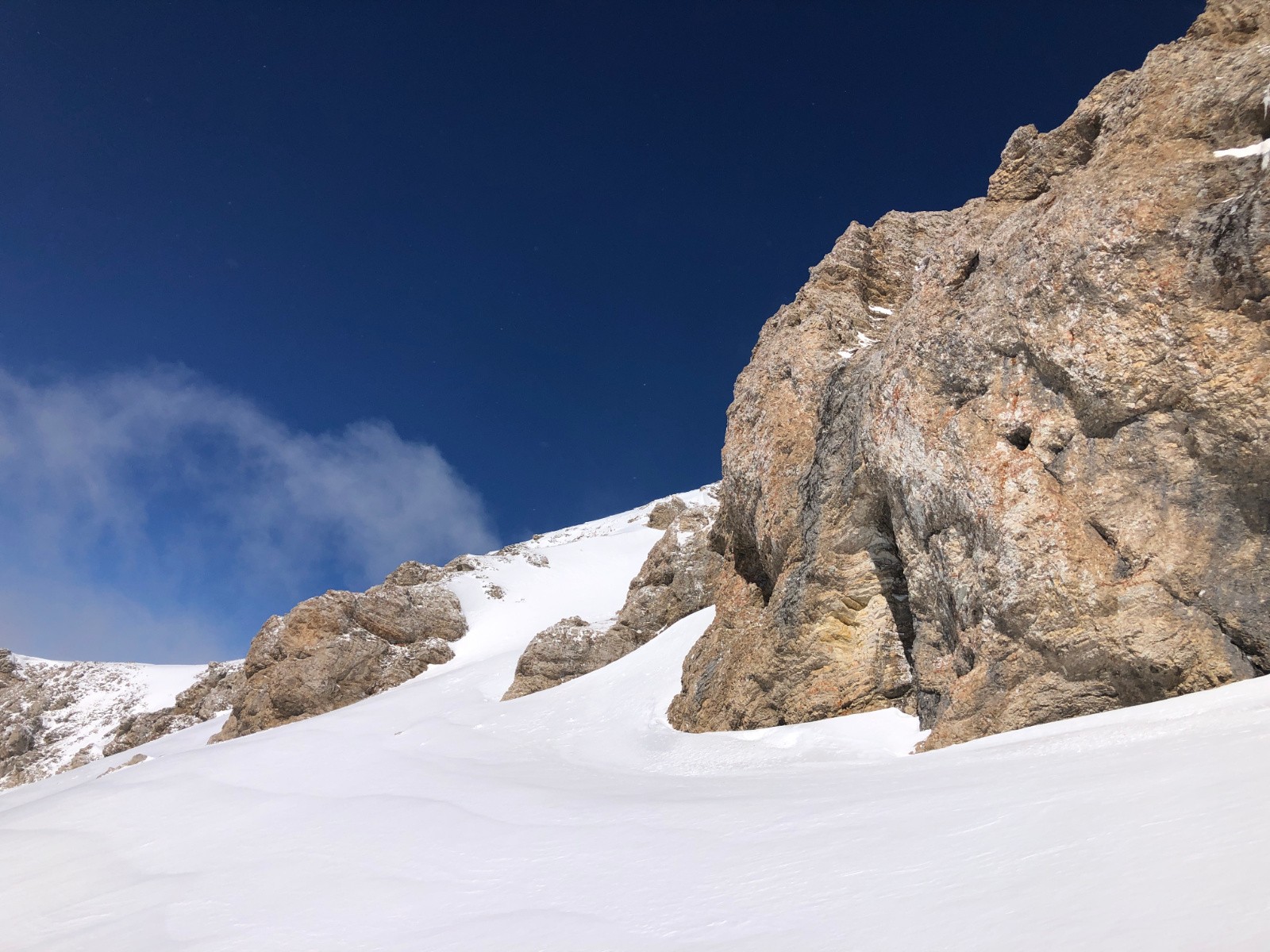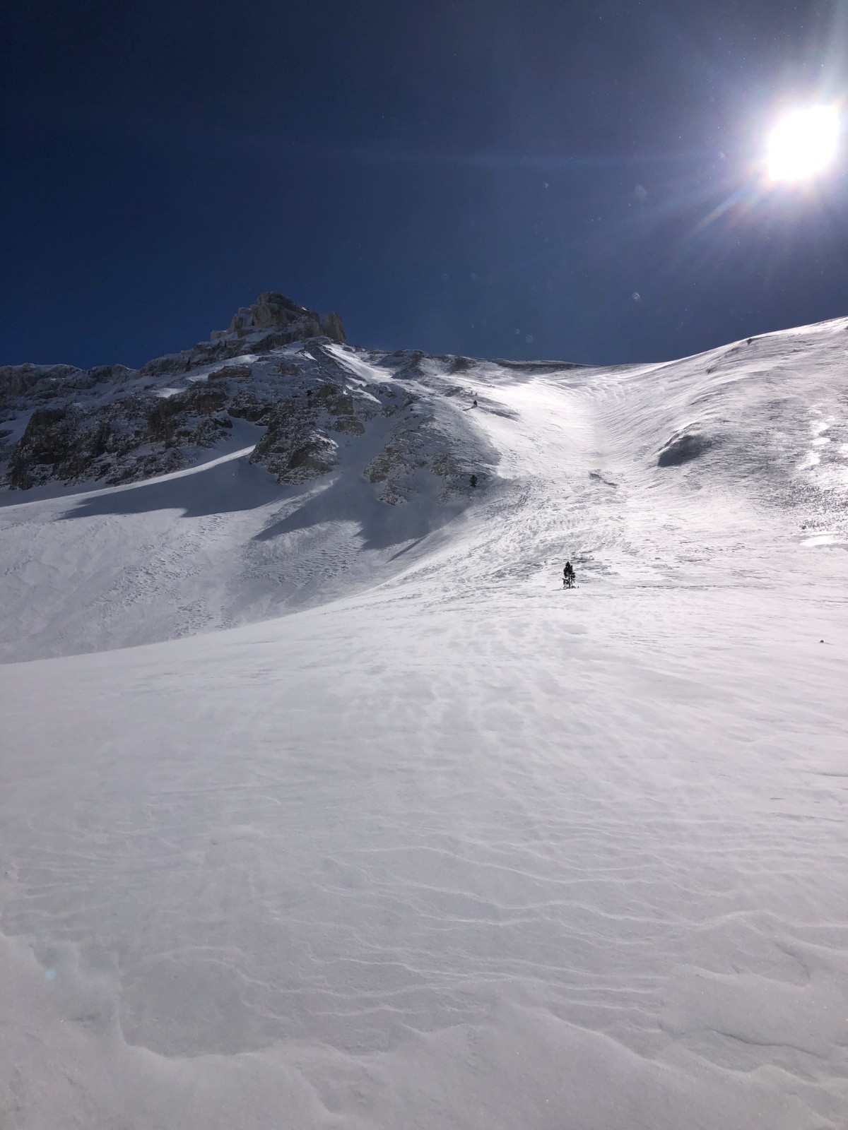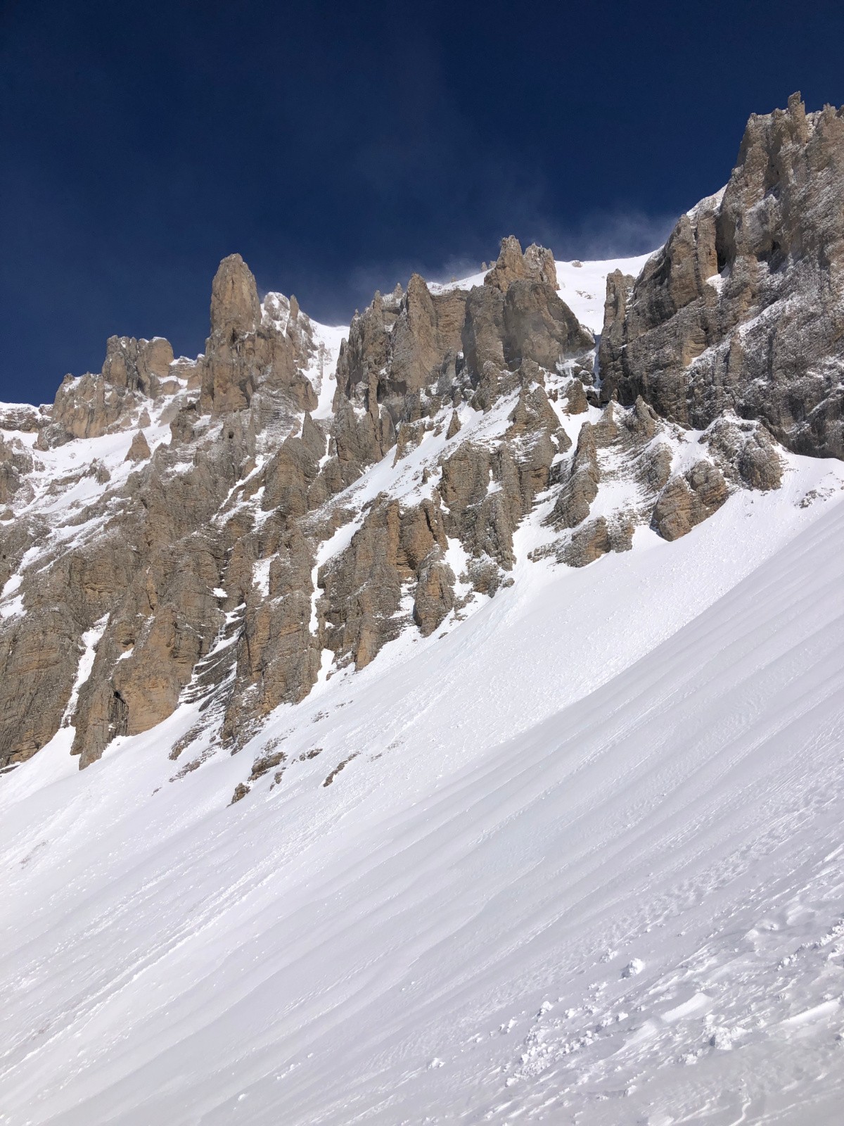 Après on se régale, neige transportée très skiable (on se tient plutôt en rive droite) le décor est magique, le soleil illumine la rive droite avec ses grottes et les belles arêtes de PIEDGROS, tandis que sur la rive gauche les crêtes de la tête d'AUROUZE sont éclairées en contre jour avec des panaches de neige, laissant à imaginer l'effet turbine .. et la combe est privatisée rien que pour nous !!