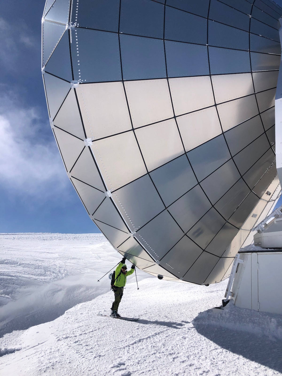 donc on fait confiance à la météo, attaque la montée vers 11h30, dans le brouillard le plus total .. et miracle, la fenêtre se découvre à midi (merci M. METEO) .. montée tout à skis sur la plateau, visite des paraboles,
