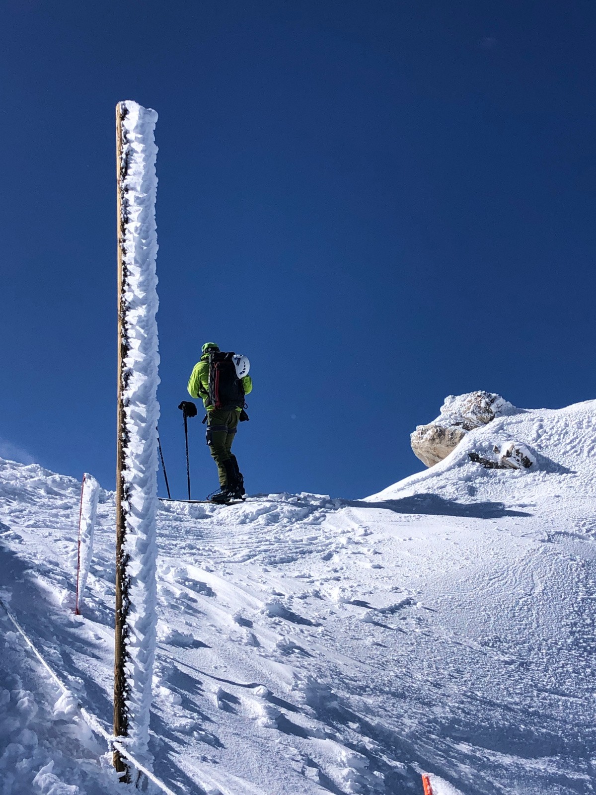 Conditions nivo et activité avalancheuse : BERA annonce risque 3, énormément de vent nuit, vent à décorner les bœufs sur le plateau, grosse accumulation au niveau des 2 ressauts du haut (2500m puis 2350m) beaucoup neige frittée, transportée, alternant avec neige gelée irrégulière, il faut rester sous les zones d'ancrage, les pentes de la tète d'AUROUZE ont été purgées
