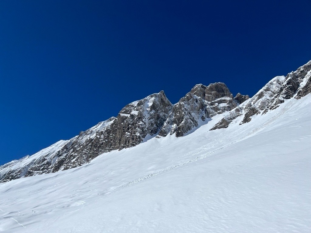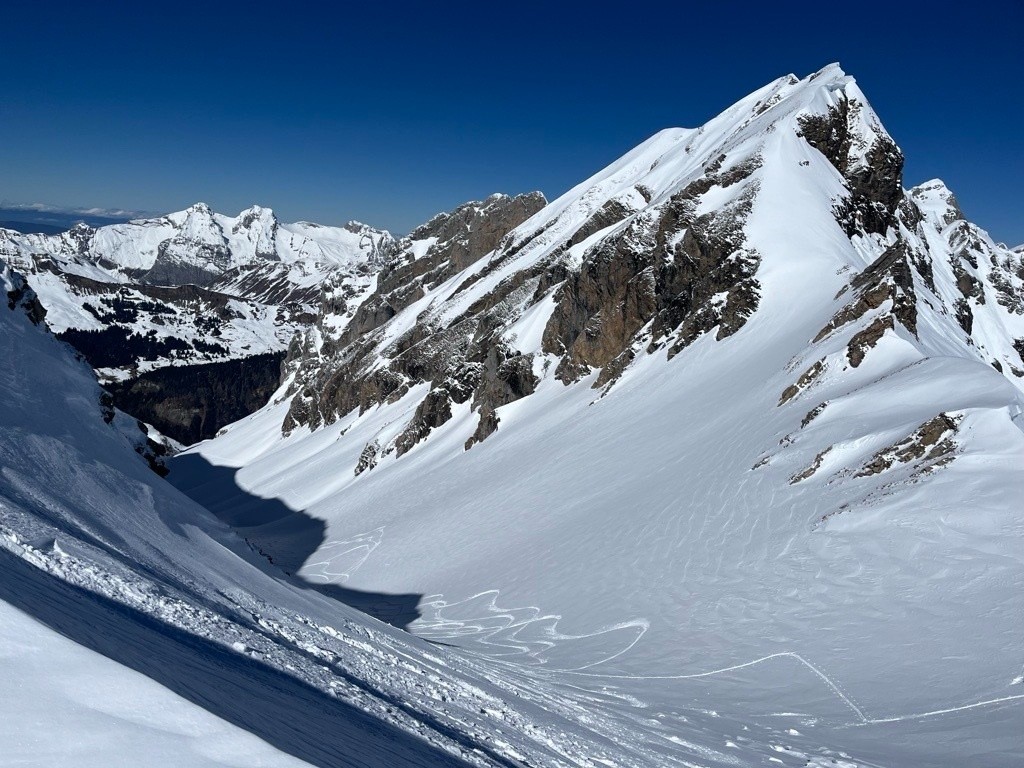 Une journée comme on les aime. Le jour pour faire cette course avec prédominante poudre. A la base on voulait renter par le Passage du Père, mais ça chauffait trop, et ça passait pas encore à l'ombre, escargots, etc. Du coup on s'est rabattu sur Forclaz. Belle boucle. Dans le Chien on s'est arrêté 20-30m dessous de la sortie, y avait des cailloux et ça chauffait forte. On voulait pas etre sous la corniche..