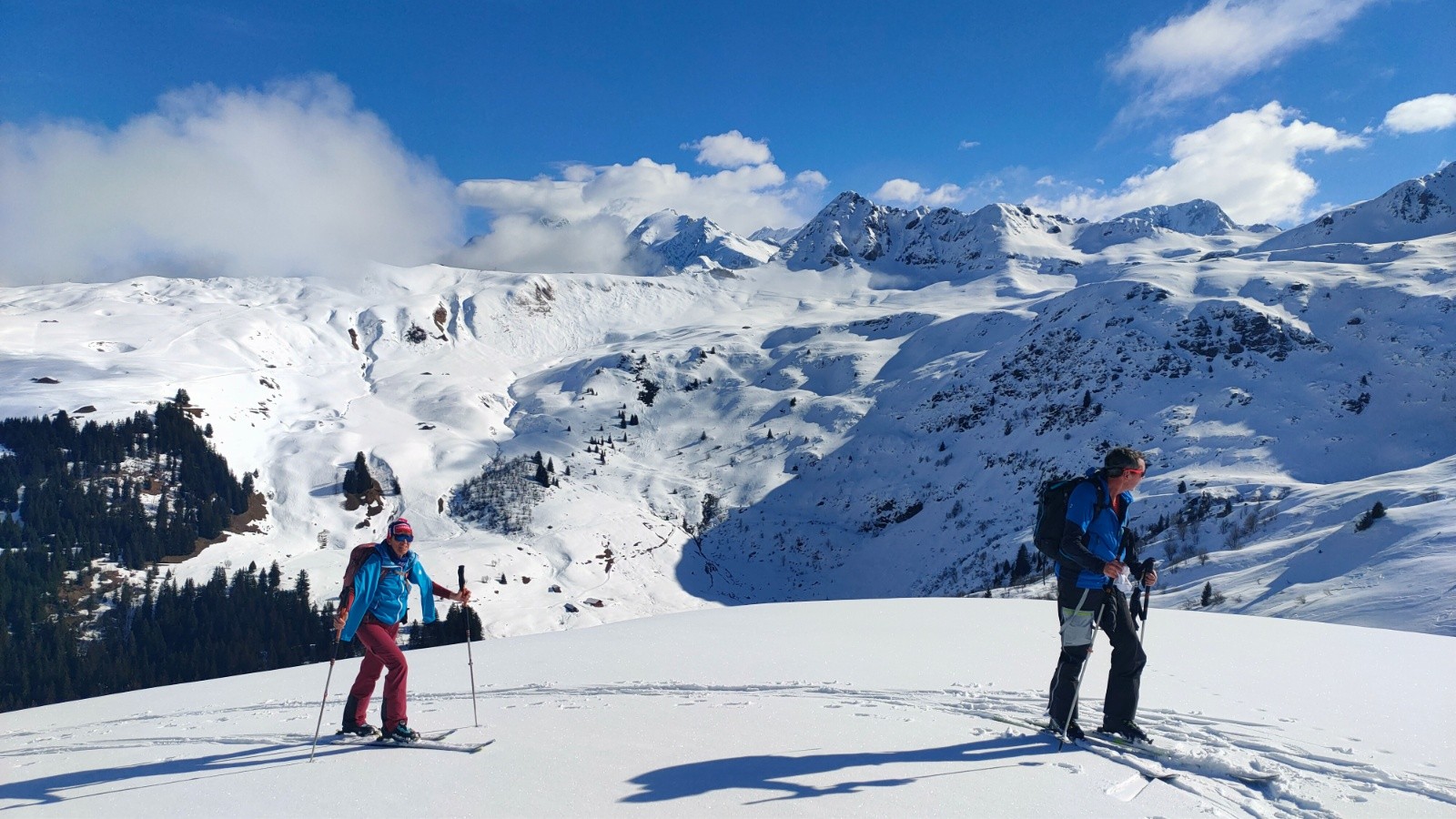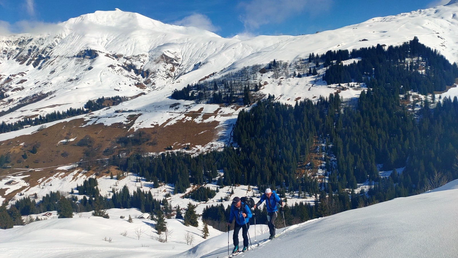 Itinéraire suivi : télécabine de la Ruelle (6.80€), descente sur la Colombe (d-150m), montée classique par le chalet du berger en louvoyant dans les vallonnements et laissant le col de la Gittaz main gauche. Rencontre sympa avec trois Alsaciens qui avaient passé deux nuits au refuge des prés, trois étoiles d'après eux. Descente par le même itinéraire en cherchant les bons coins, il y en avait de partout ☺️. Un petit déchaussage à la Colombe pour rejoindre la piste rouge, encore une belle rencontre avec le propriétaire du chalet de la Colombe qui nous a parlé du bon vieux temps ☺️. Final par la piste rouge pas pire. Encore une bien belle journée en montagne avec les copains et ma Biche 👍 magnifiques panoramas sur le Mont Blanc et le Beaufortain 😍 photos un peu plus tard, ça rame ..