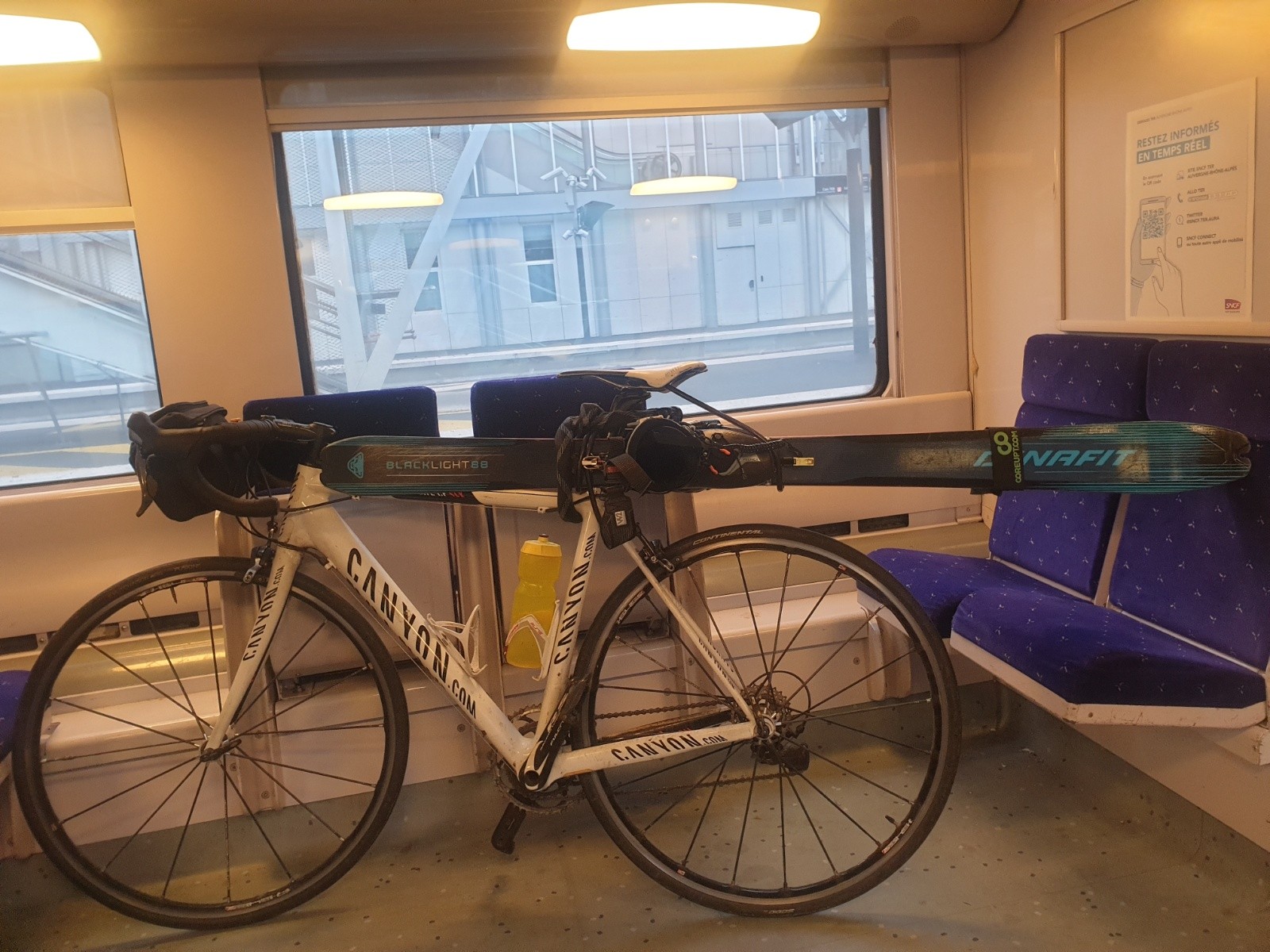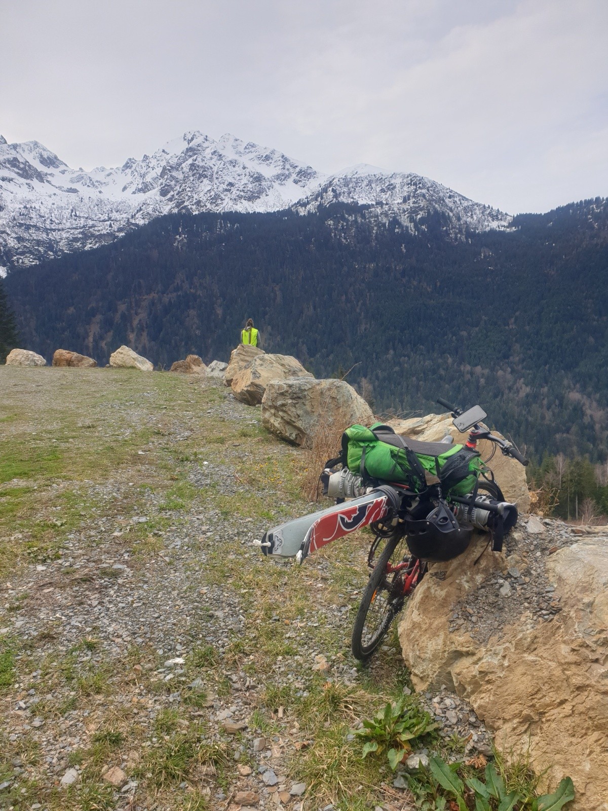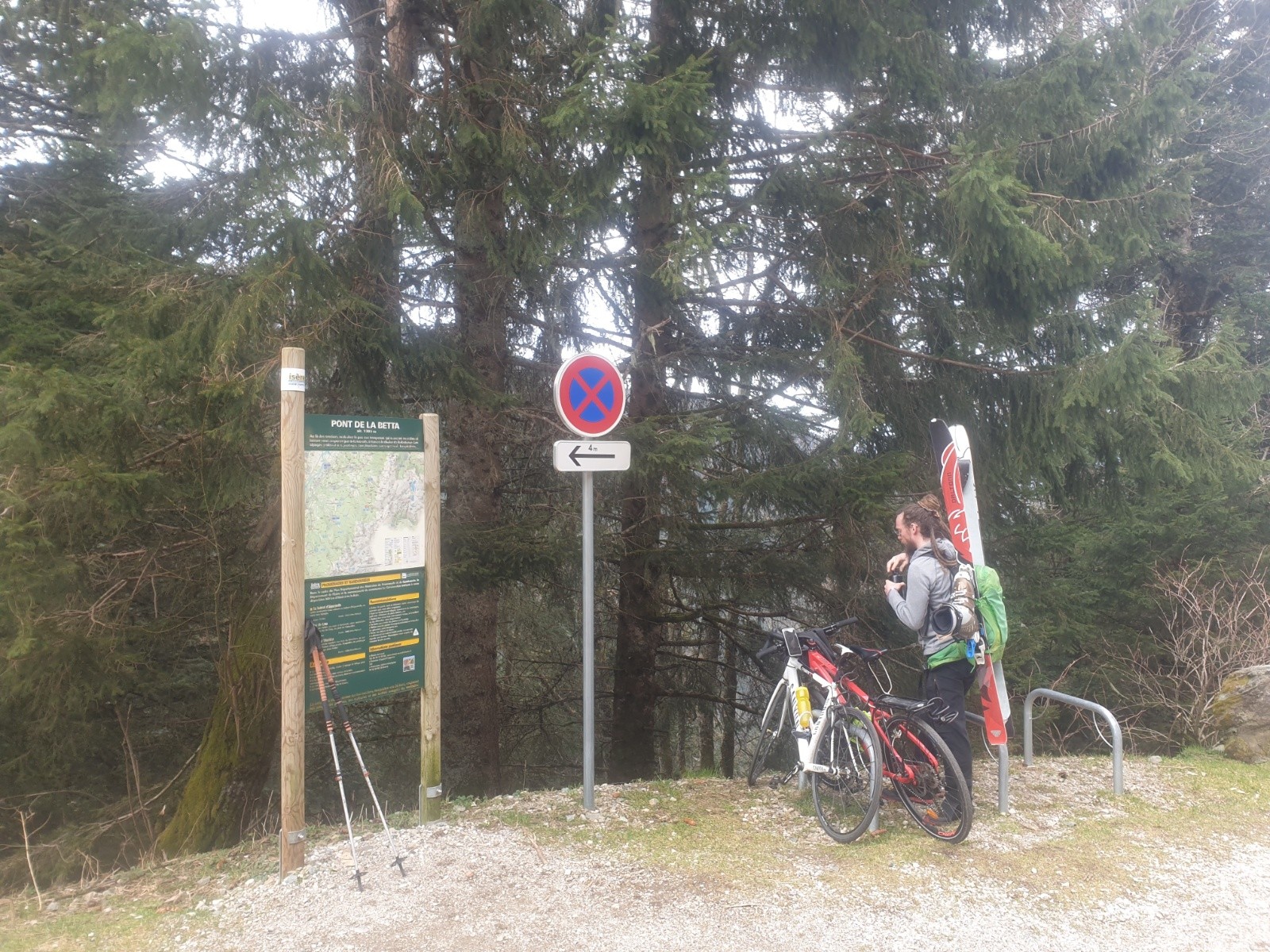 Itinéraire suivi : 1ère sortie vélo ski🤩. début de montée à vélo 8h30 Brignoud, un peu gênée par les skis, rapidement très gênée par mon sac à dos. On s'arrête et je le mets finalement sur les skis et P.E cale mieux mes skis avec une chambre à air. Vitesse moyenne 5km/h, c'est dur quand même...