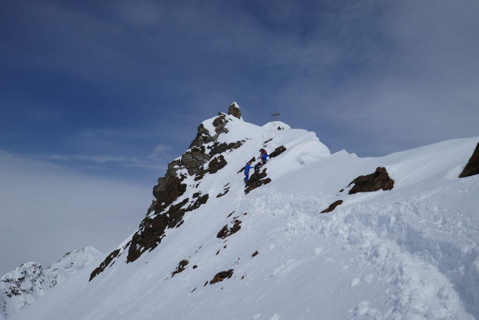Après une petite traversée en neige vers l'ouest, on rejoint l'arête Sud-Ouest qui monte à une antécime puis au sommet.