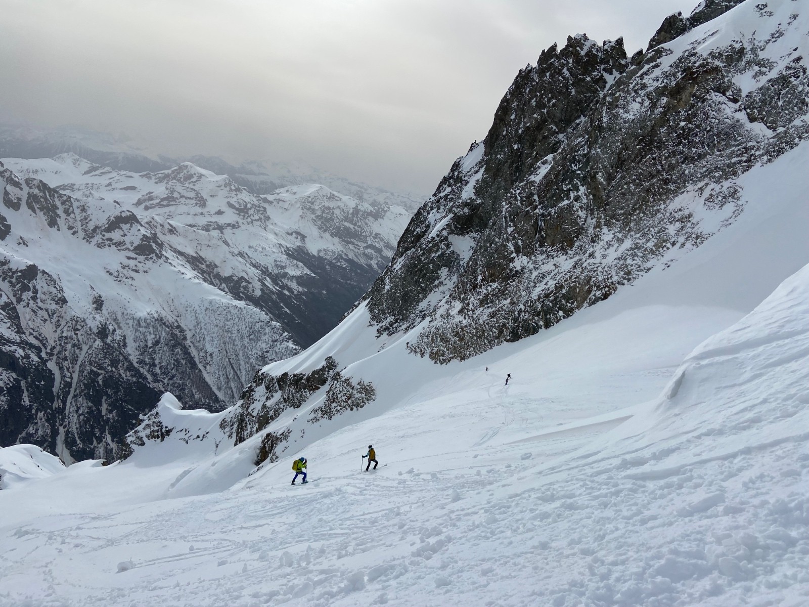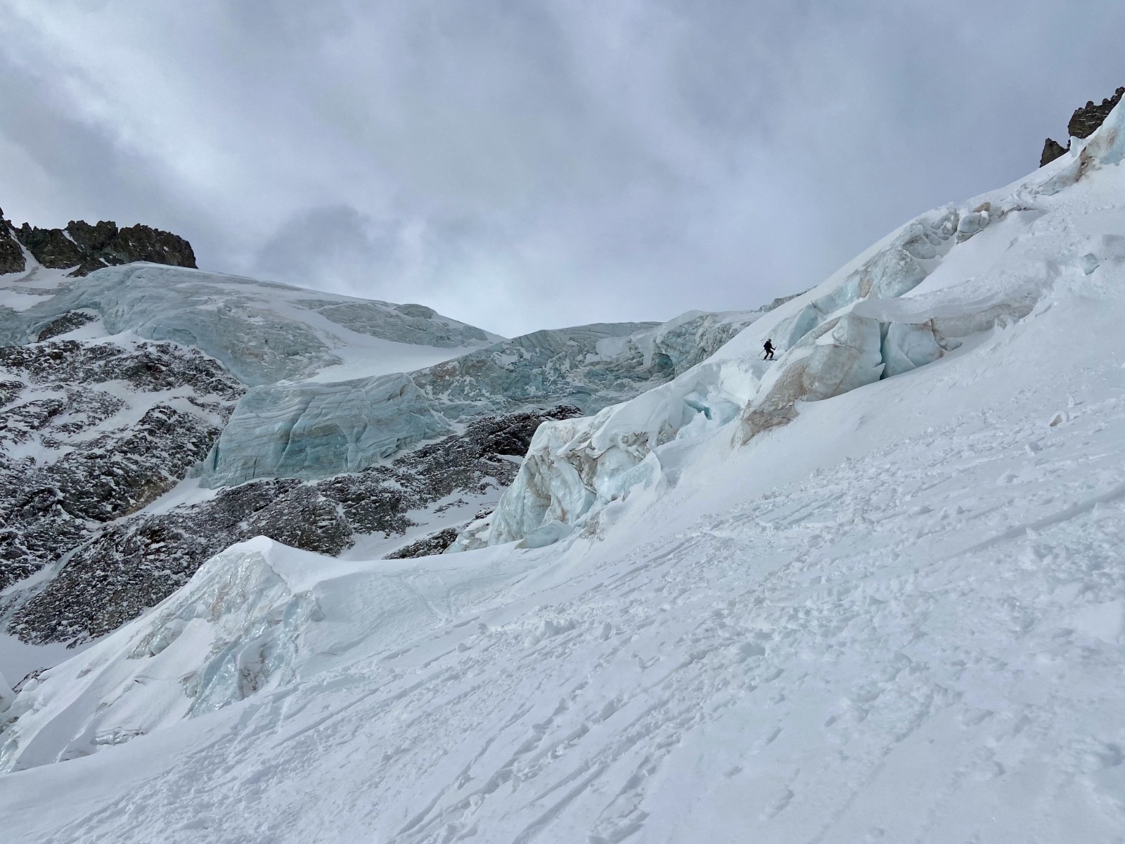 Sur le glacier des violettes, les premiers séracs sont contournés rive gauche, puis vers 3300m, nous ne sommes pas descendu comme sur le topo en rive gauche contre les rochers (Max est descendu puis remonté, car une chute de sérac + avalanche a rendu cet itinéraire inskiable, nous sommes descendus en plein milieu des séracs jusqu’au replat intermédiaire, que l’on a traversée, puis descente rive droite le long des rochers jusqu’au plat 3100m, petite descente de 100m et on plonge dans la Combe de Serre du Riou.
