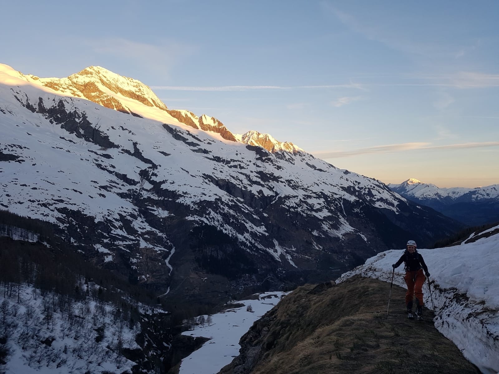 Marche à pied jusqu'à NantCruet, passage des gorges, moitié sur la neige, moitié skis dans l'herbe et c'est parti pour la très très longue remontée du glacier (aussi interminable que le vélo de la veille). Heureusement, les randonneurs des jours précédents ont fait de magnifiques godilles sur notre droite dans le raide. Ça me rappelle pourquoi je suis là, merci à eux. On a le temps d'apercevoir 2 skieurs au sommet, puis leur descente à ski depuis le sommet et nous sommes toujours pas au pied de l'arête NE (enfin si Arnaud attend que j'arrive.. ).