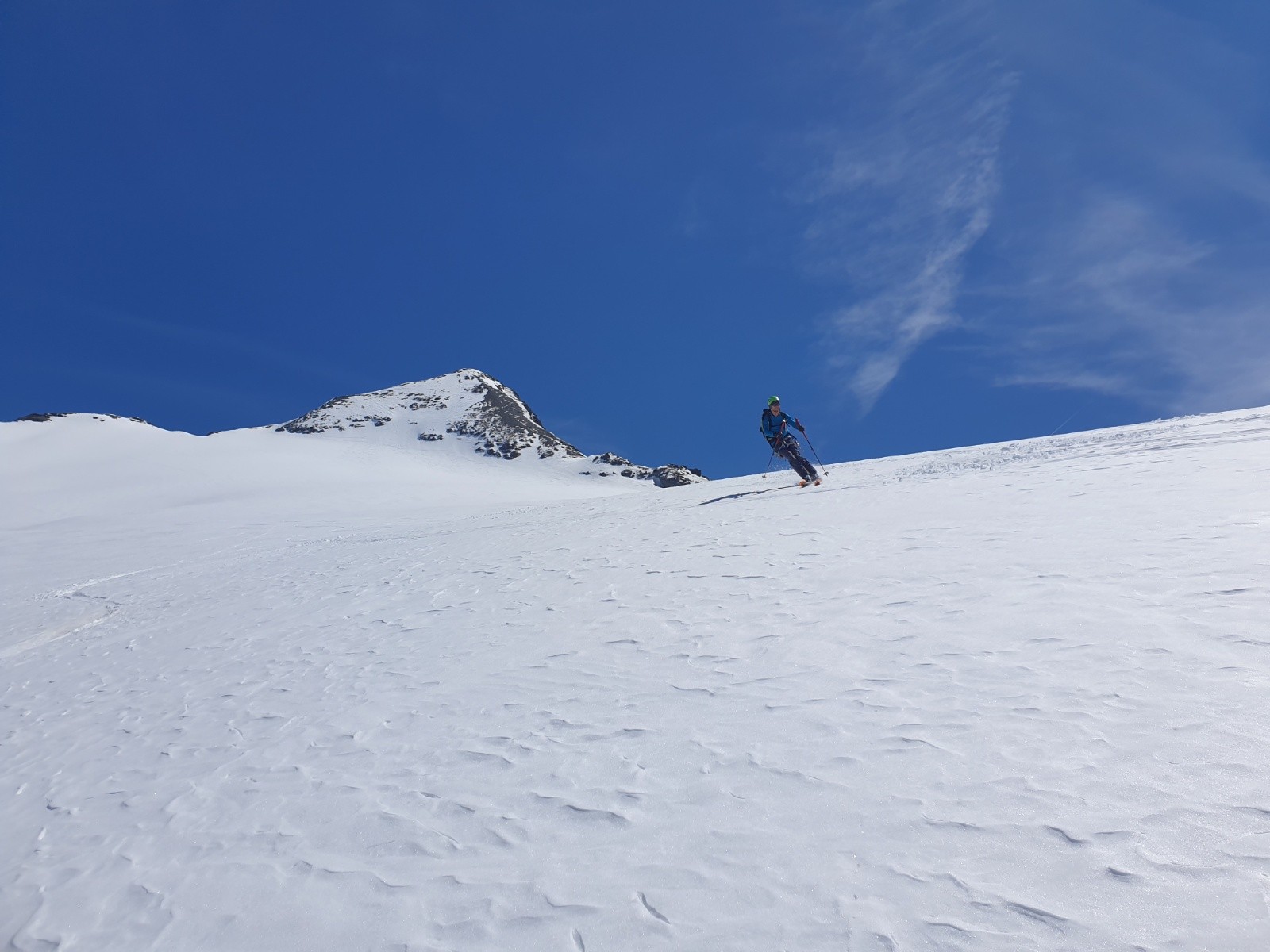 Un peu de neige soufflé sur la première partie de la descente, puis très bonne moquette, encore un peu de poudre sur les pentes raides plein Nord sur la fin du glacier.