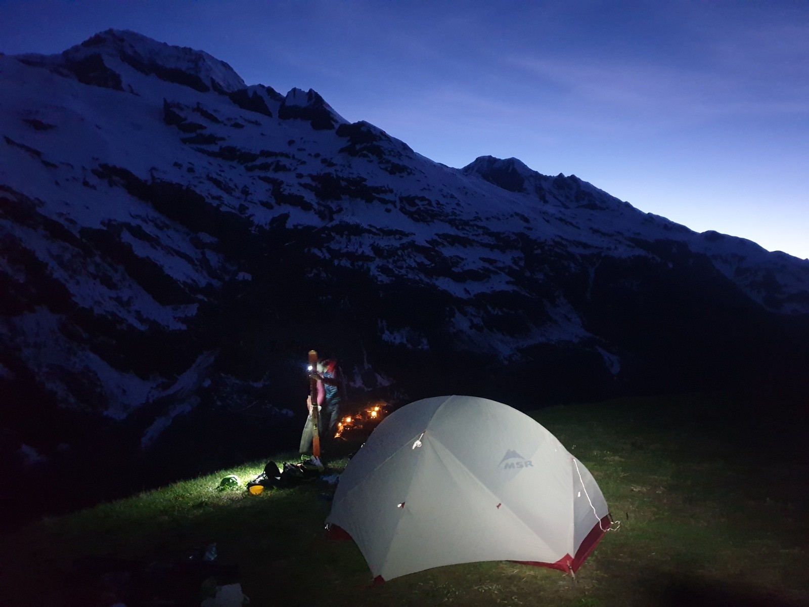 3h plus tard, nous arrivons à Chenal, lentement mais sûrement. On pose la tente, dîner à la frontale et vite au dodo pour être en forme pour le lendemain. Nous sommes déjà bien K.O de ces 18km...
