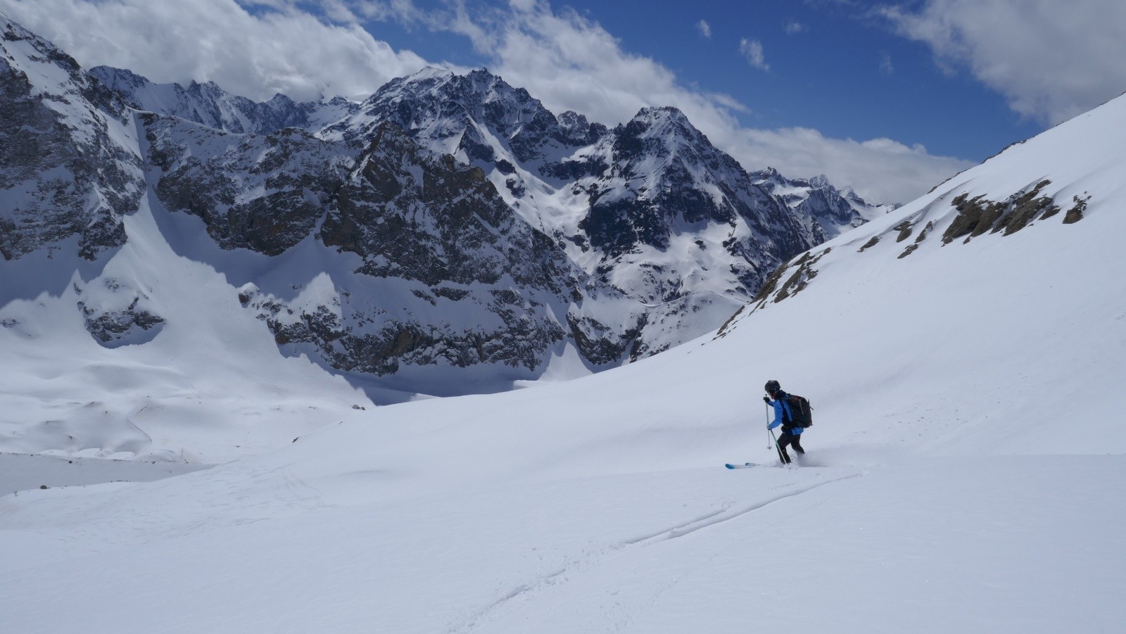 Quelques nuages et le vent frais arrive, on ne traîne pas. La neige est bonne et pas si lourde à skier. Ouf ! Là oui, c'est efficace. Nous sommes très rapidement (moyenant quelques pauses) à notre point de portage ! Descente pas bien agréable à pied ensuite jusqu'à la Berarde.