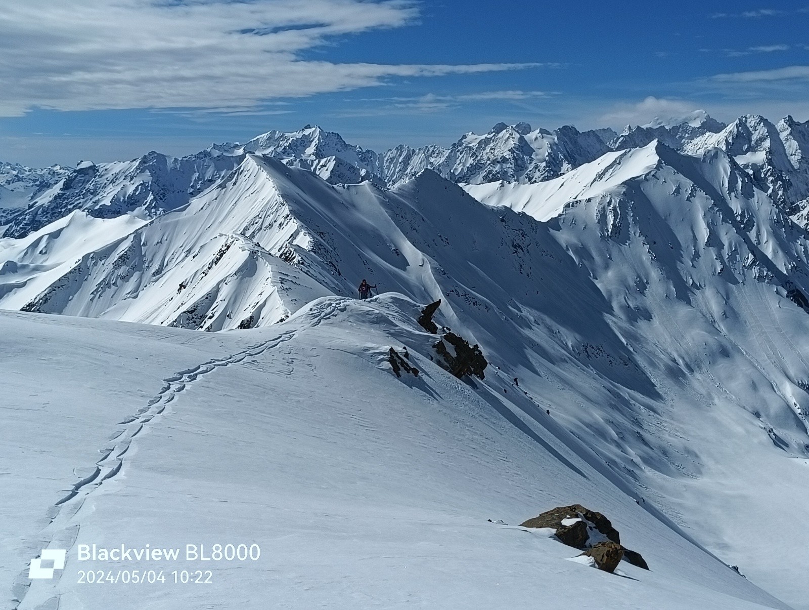 Le vent souffle sur la crête et le sommet n'est pas bien agréable. On ne traine pas pour s'équiper pour la descente, Emeric m'attend à l'entrée du couloir qui est protégé. Une large plaque de surface est partie dans le couloir depuis le haut alors que le vent y ramène la neige. Plutôt rassurant sur la stabilité D'en haut le couloir n'est pas très impressionnant car bien large et on ne voit pas l'expo. Ceci étant l'entrée assez pentue me donne un peu de fil à retordre pour me décider à enclencher le premier virage. Neige bien tassée en haut, poudre compacte ensuite, un bon cru dans l'ensemble, même si on reste concentré avec le sluff. Le bas de la coulée est parti dans la voie sans issue, plus qu'à la traversée pour rejoindre la sortie Le bas, s'il est transformé est décaillé, on ne saurait espérer de meilleures conditions! De ce côté encore pas grand monde outre 3 skieurs qui rejoindre le refuge des Aiguilles d'Arves On s'octroie une petite remontée en N sous les barres profiter du soleil, des marmottes et de la bonne neige. Puis on descend chercher les affaires.