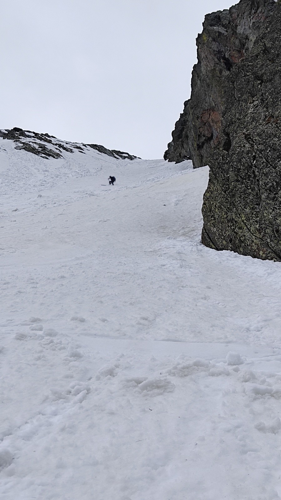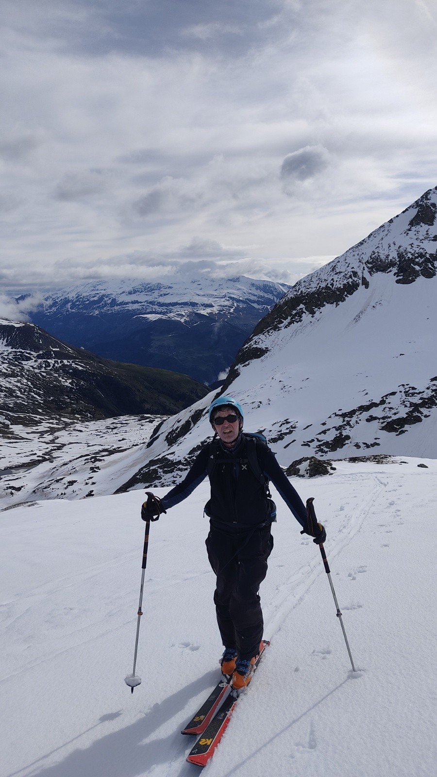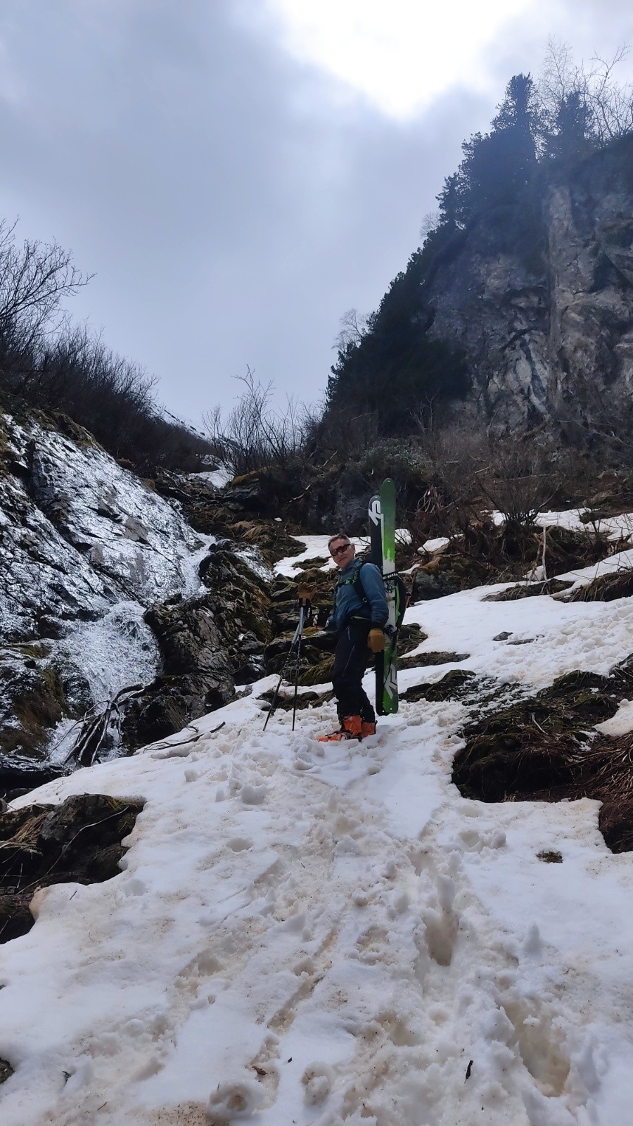 Dans la descente on loupe la traversée que l'on avait repéré d'en bas et qui nous aurait permis de descendre sur une langue de neige plus bas...pas grave on déchausse et descend prudemment à pied car ça glisse.