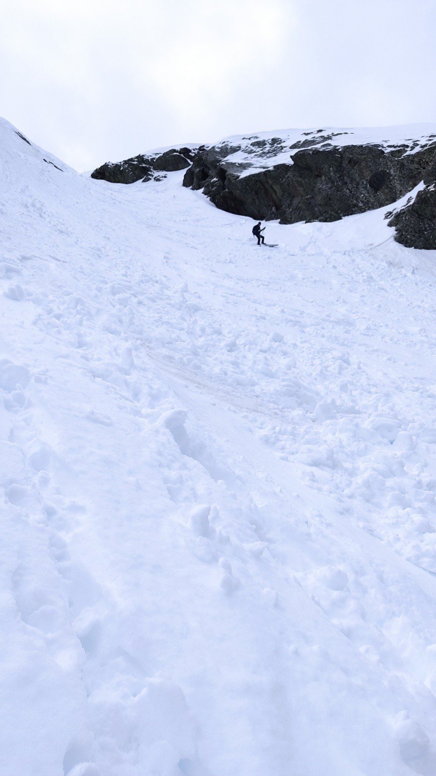 Conditions nivo et activité avalancheuse : tout à déjà coulé dans le couloir, que quelques boules de surface restantes que l'on fera descendre mais vraiment trois fois rien