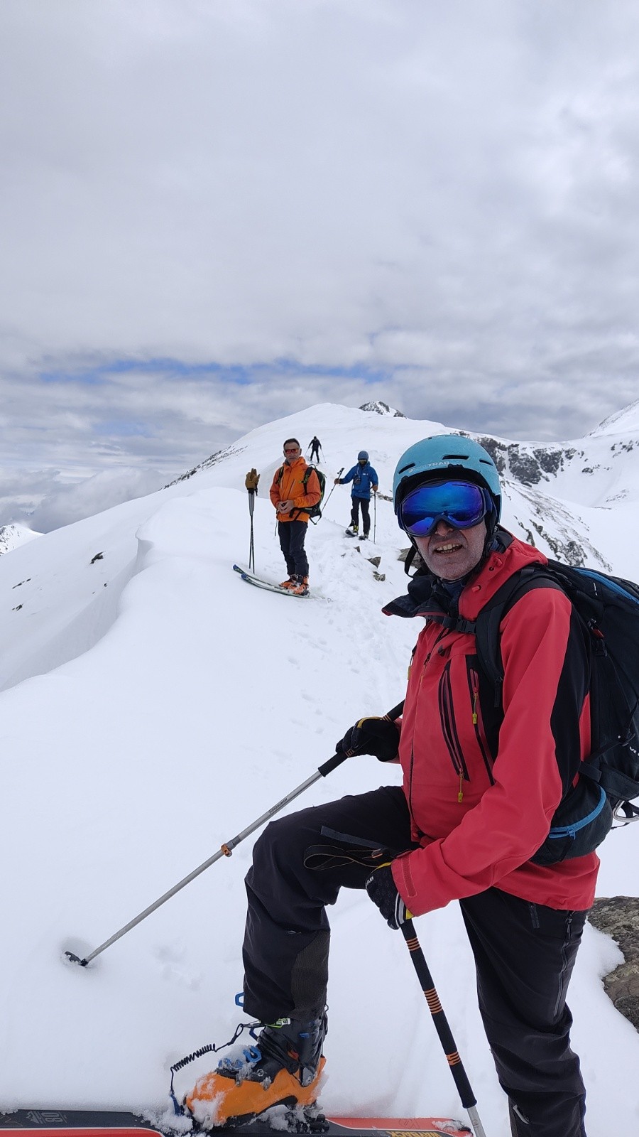 Rapide casse-croûte pour certains en attendant tout le monde et descente pour la 1ère fois pour tous par le couloir Pinelli, hormis pour Dominique... Le couloir est bien rempli cette année et la neige molle nous permet une descente facile et tranquille car tout à déjà coulé les jours précédents !!