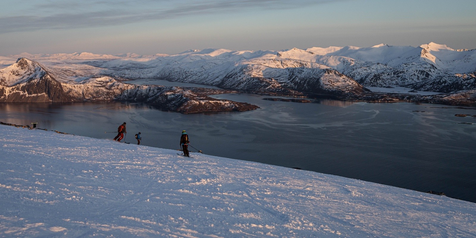 J1 : cf topo - Deux Skardelvfjellet au lieu d'un Keipen - L'objectif initial était le Keipen, mais au vu du monde, des traces, du vent en place, ça valait le coup de faire ce tricotage autour, avec ces belles pentes en frisette, moquette et légère poudre.. Mention spéciale pour la dernière pente au dessus de Huselva avec 5 à 10cm de poudre légère dans ces forêts de bouleaux aux troncs très espacés, idéal pour le ski ! Idéal pour prendre ses repères sur Senja, avec déjà des belles vues sur les fjords ou autres massifs au loin..