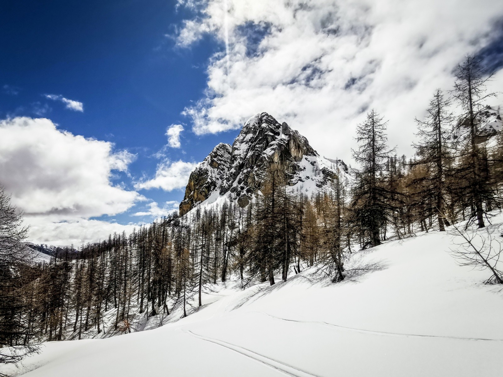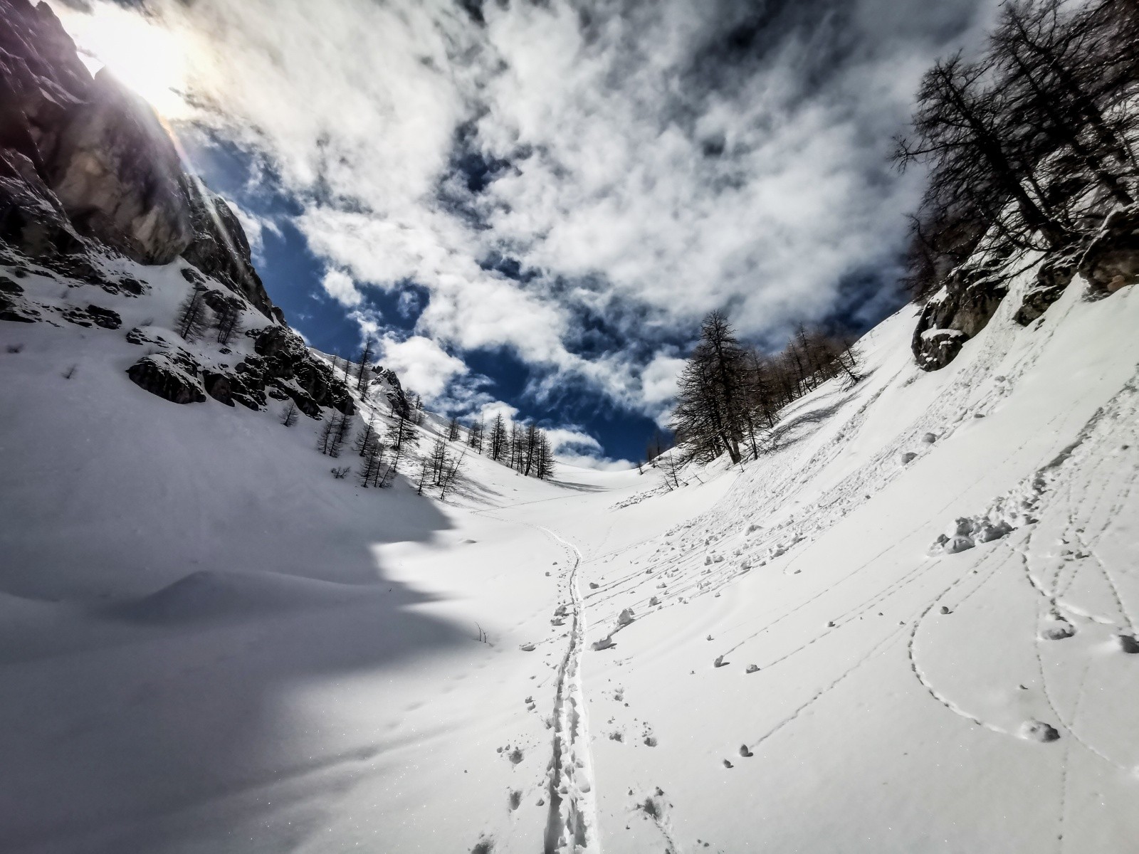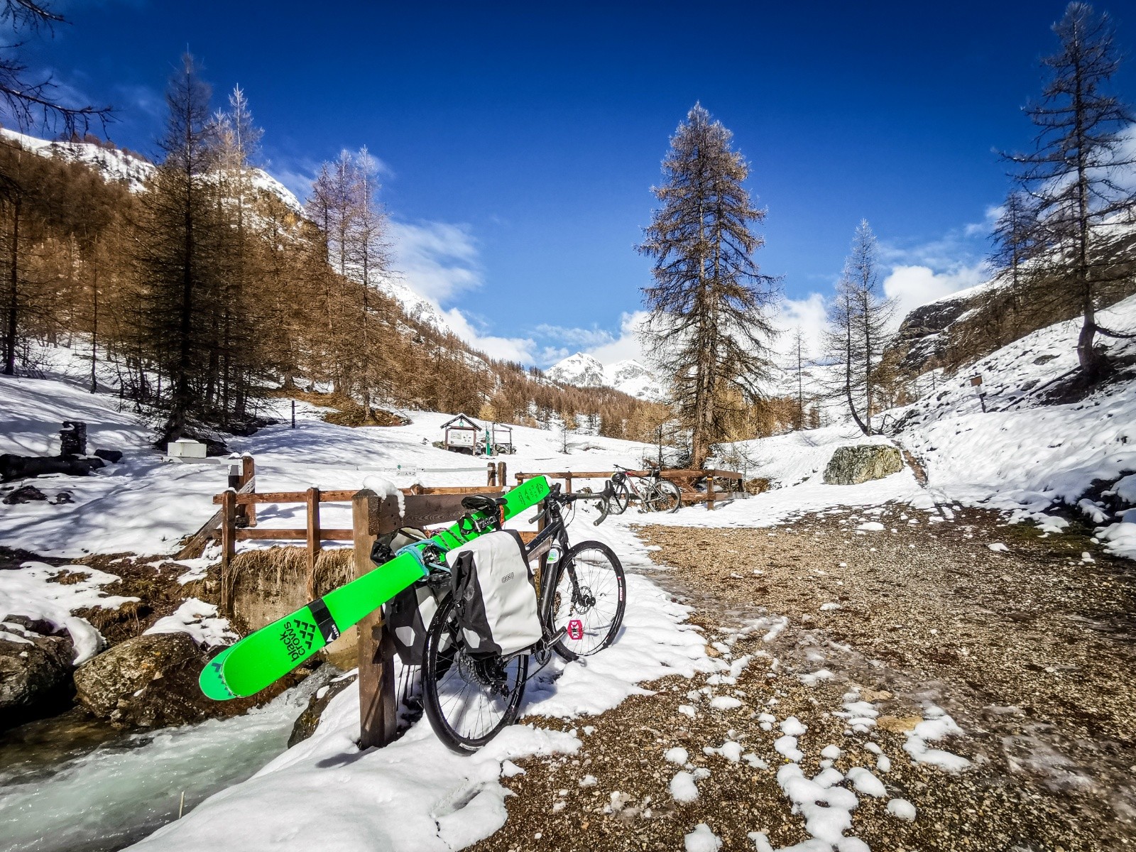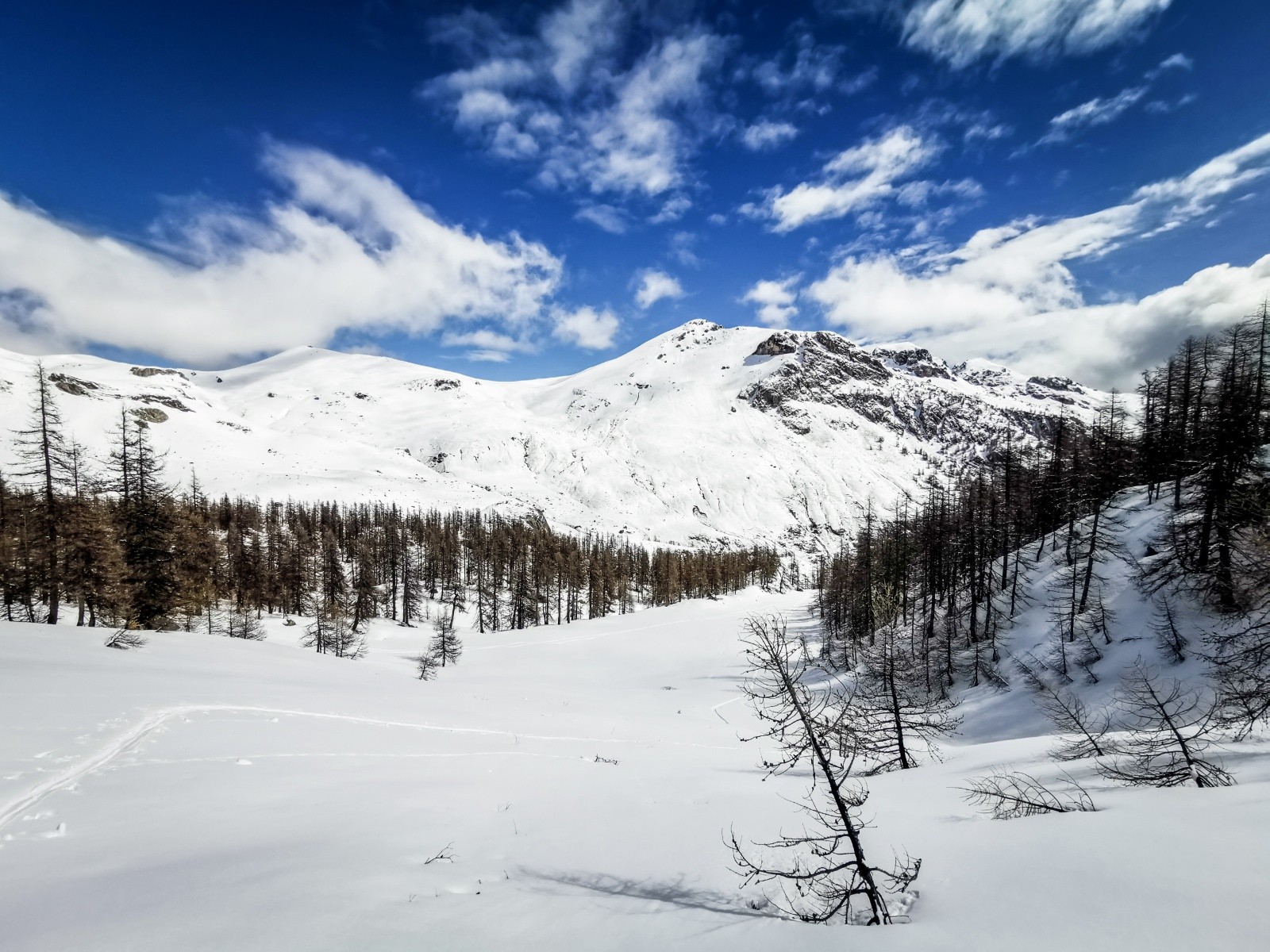 Parti à vélo depuis les environs de Briançon, je chausse les skis depuis le bout de la piste des Combes à 1906m. Après un premier run poudreux dans la crête de la Bressière en boucle par la Trancoulette, où deux skieurs m'ont précédé, je repeaute pour une deuxième Trancoulette, direction la Croix d'Aquila et la descente du ravin du Jeu de Paume.
