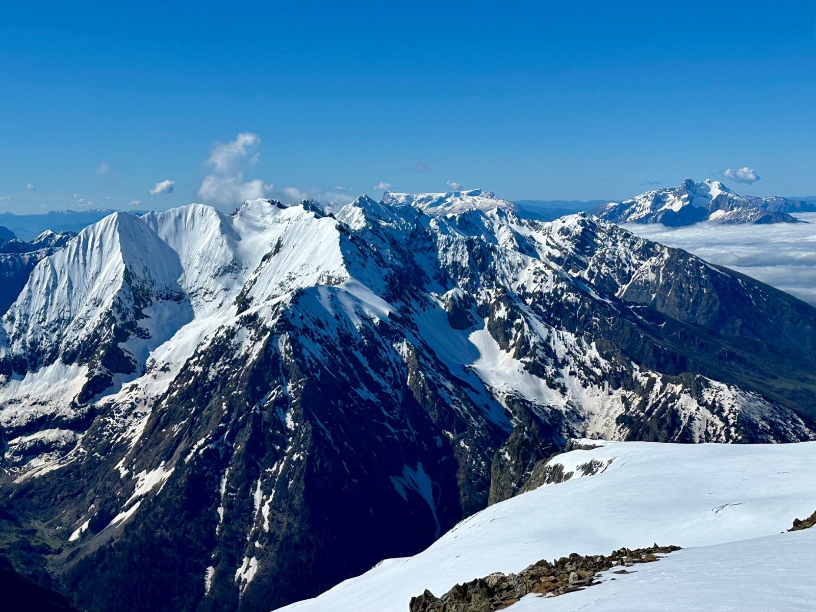 C'est bien nuageux ce matin sur Grenoble, mais après avoir hésité pour la dernière de la saison entre Taillefer et Combeynot, je reste sur mon idée du Taillefer. Le ciel se dégage arrivé au lac de Poursollet, bonne pioche. Montée à pieds jusque vers 2060, puis à skis ensuite sans soucis particuliers : merci au traceur. 2 iront vers la Pyramide et nous arriverons à 4 au sommet du Taillefer après une pente W bien béton. Panorama toujours magnifique, les contrastes de printemps sont splendides. Je ne traîne guère pour avoir une descente correcte. Elle le sera, après une neige encore dure sur la pente W, le haut de la combe sera bien agréable, la suite avec un fond mou un peu moins mais correcte tout de même (laisser les allumettes à la maison..). Petit pensum pour rentrer à pieds au lac de Poursollet en croisant de nombreuses familles à pieds (en shorts et tennis), les échanges de fin de saison (cela skie encore ??) sont toujours bien sympas.