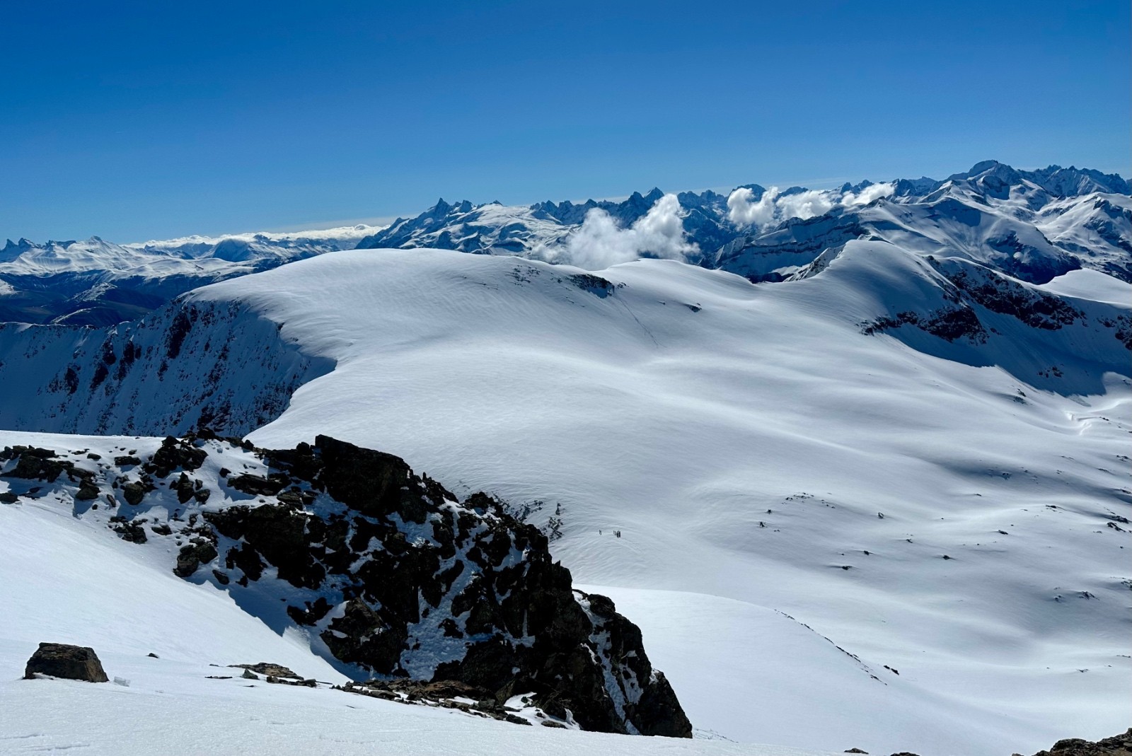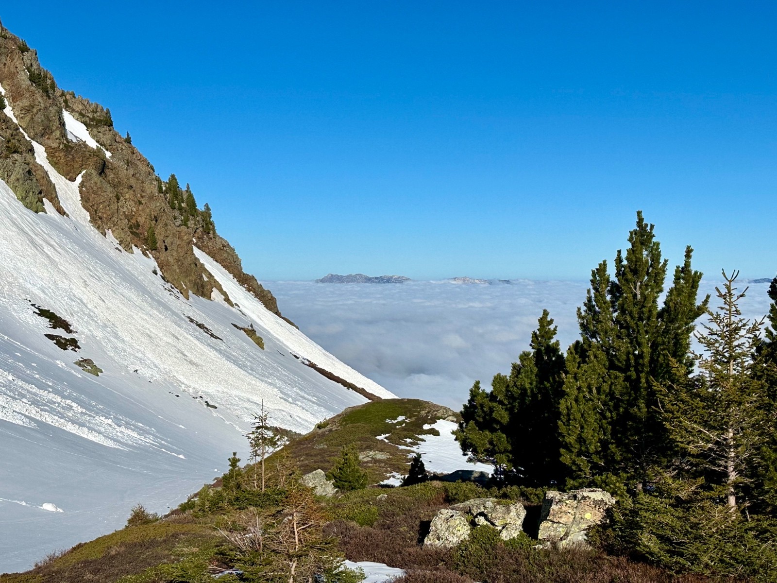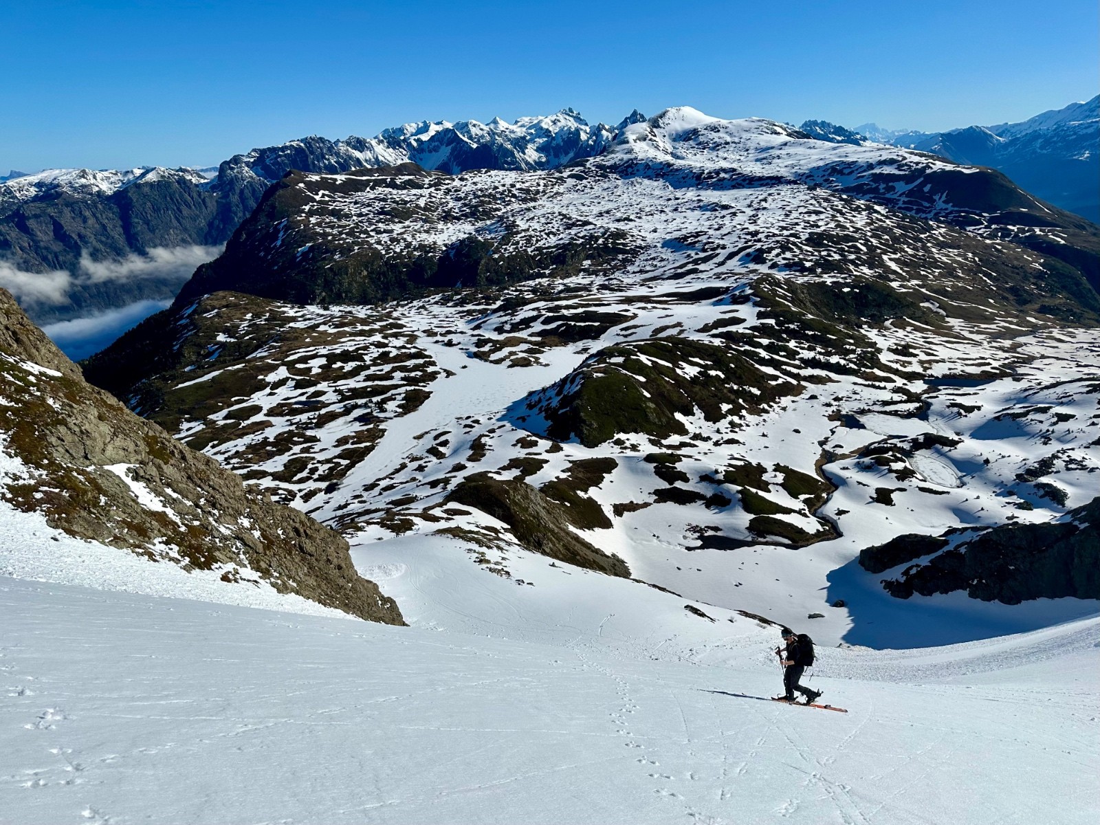 Conditions pour le ski : Regel sensible au départ. Dès qu'il est au soleil, la manteau se réchauffe vite : le bas de la combe est déjà un peu mou à la montée, la deuxième partie est bien. La pente W finale est béton.