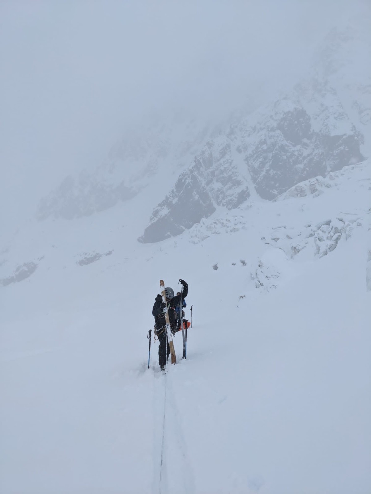 On marche dans 40-50cm de neige fraîche, on souffle et on fini par arriver à la jonction. Là on tombe sur des piquets plantés par les gardiens du refuge qui nous indiquent où passer et on repart dans leurs traces soulagés.