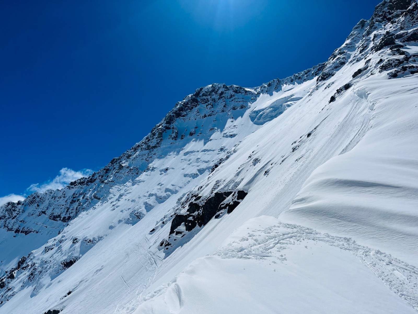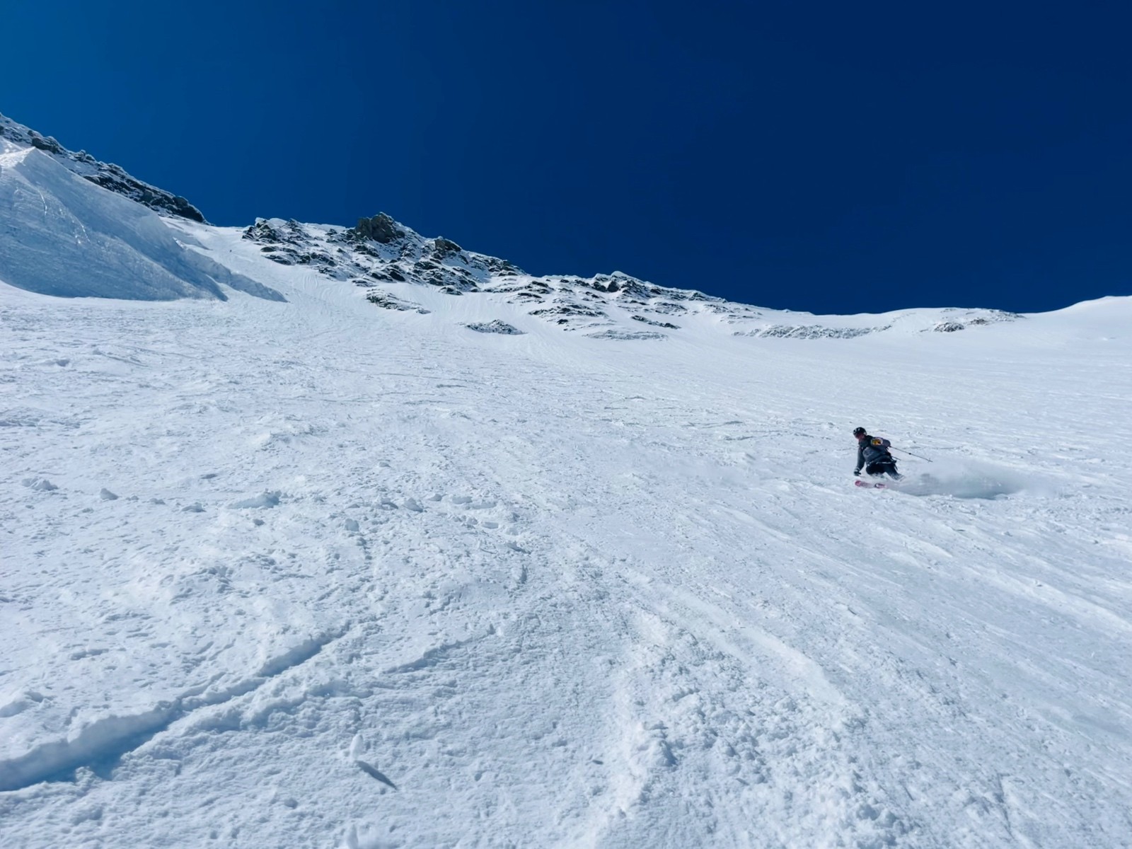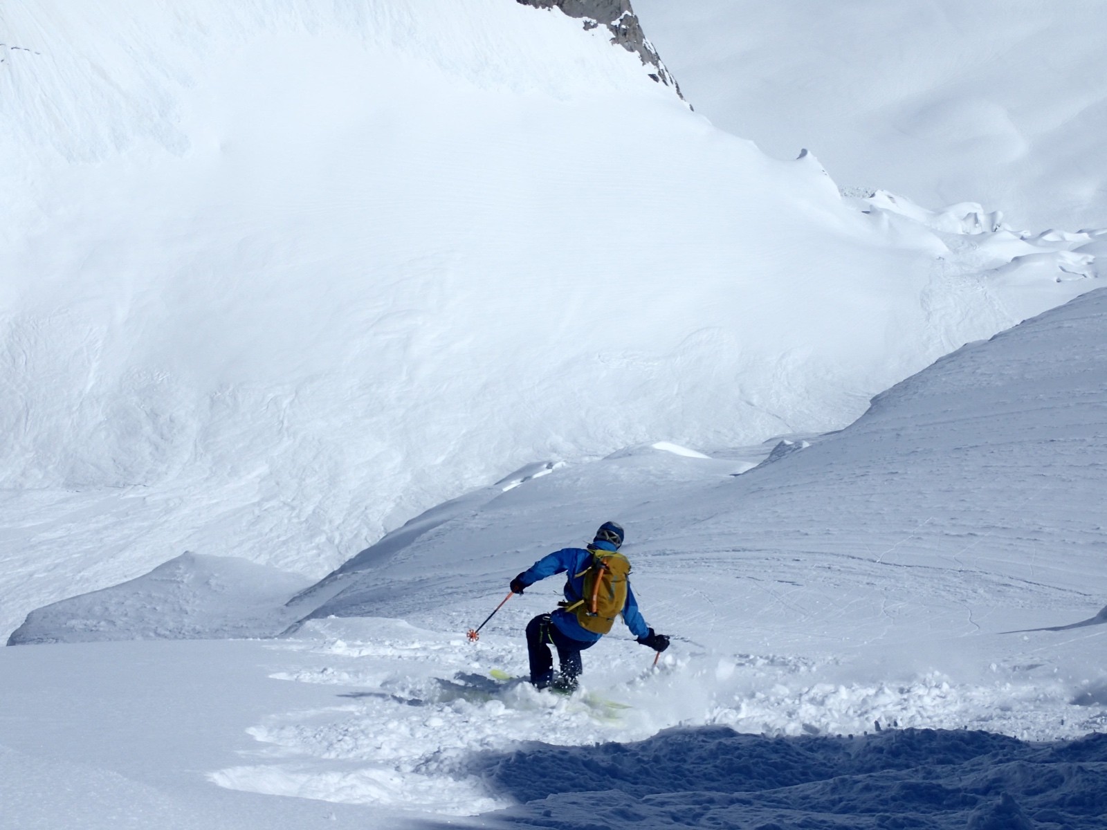 Conditions pour le ski : 40-60 de poudre dans la face un peu tassée. Pas de glace visible (on la trouve dans le haut sous 40 de poudre).