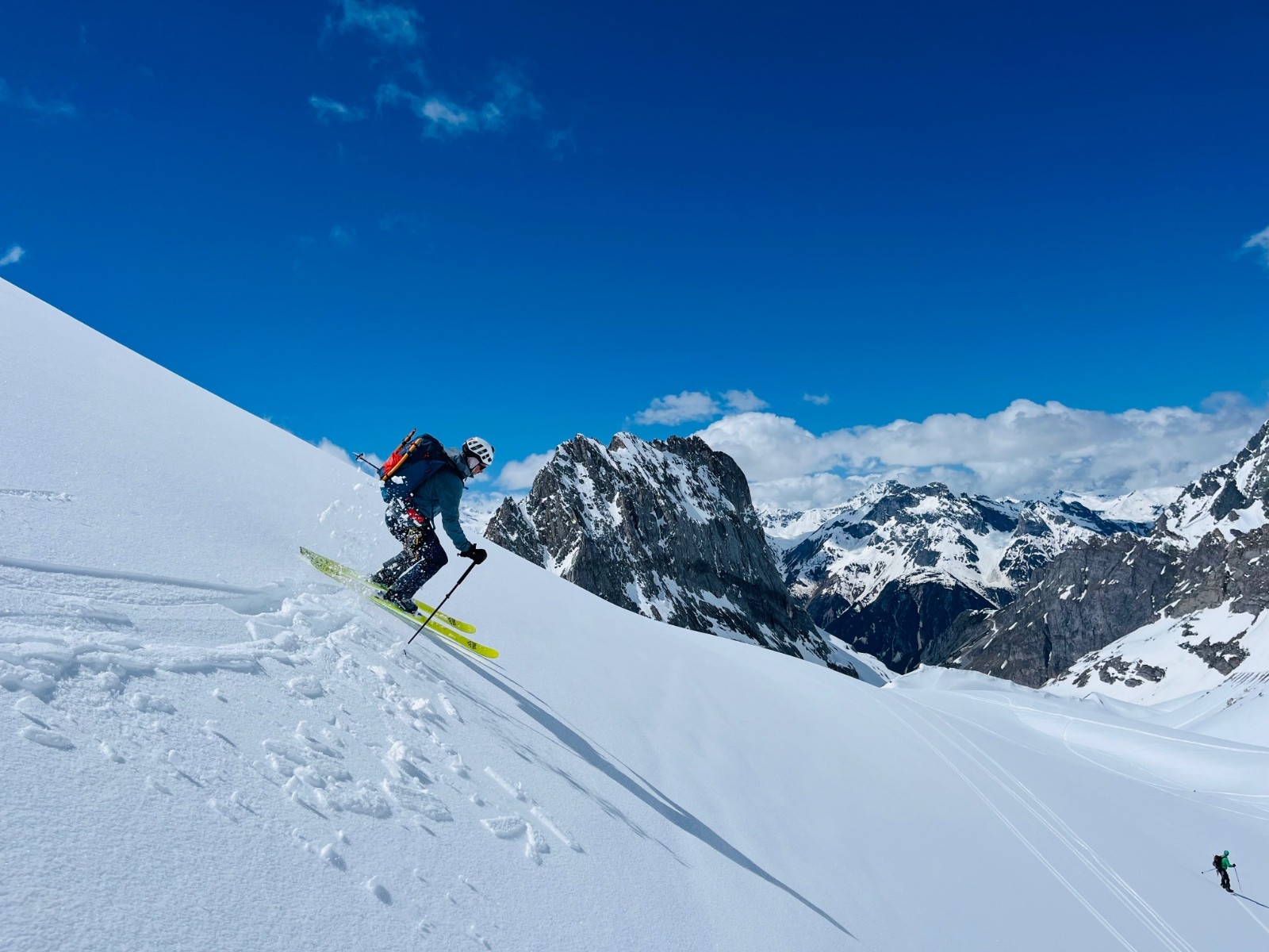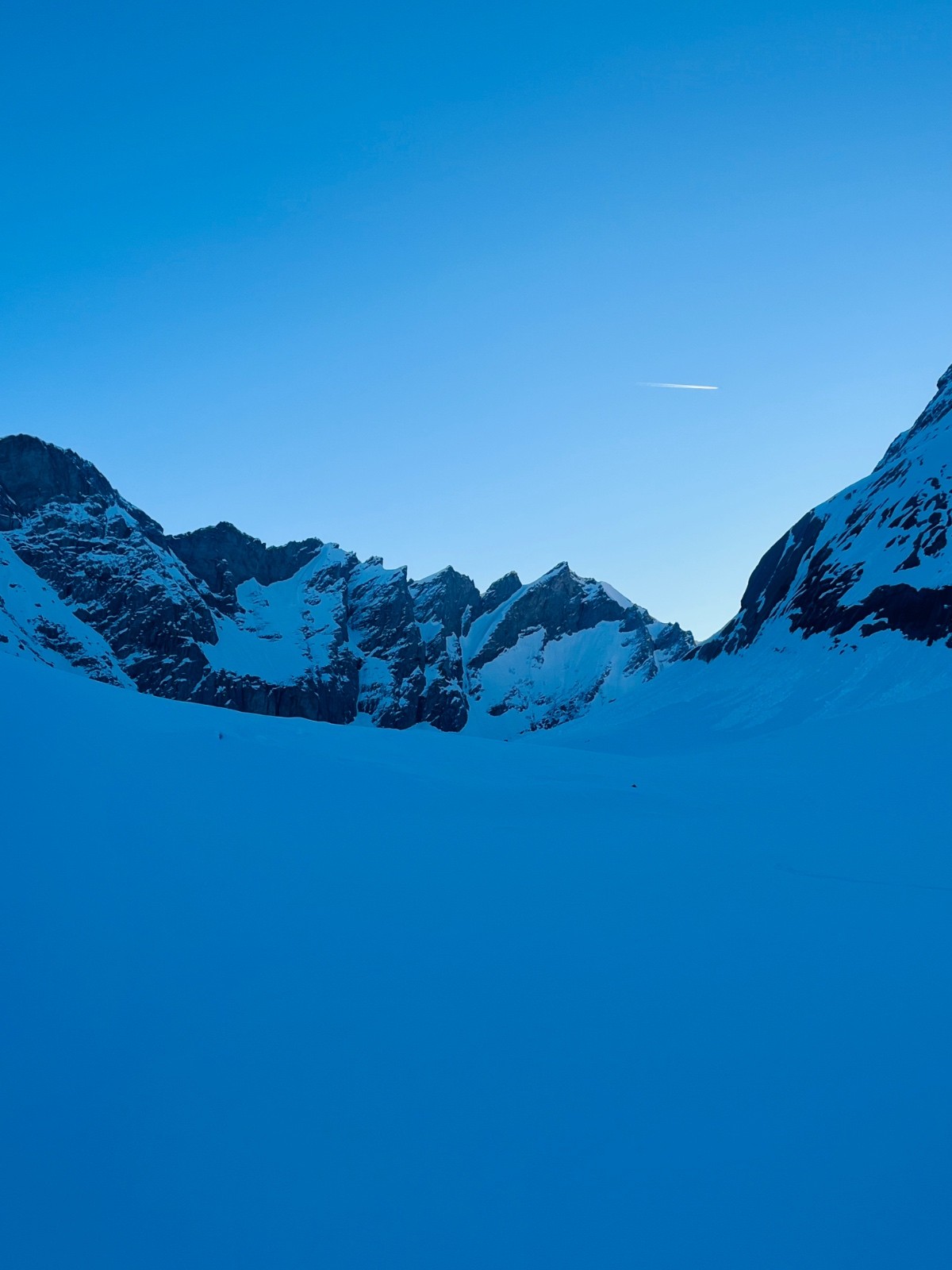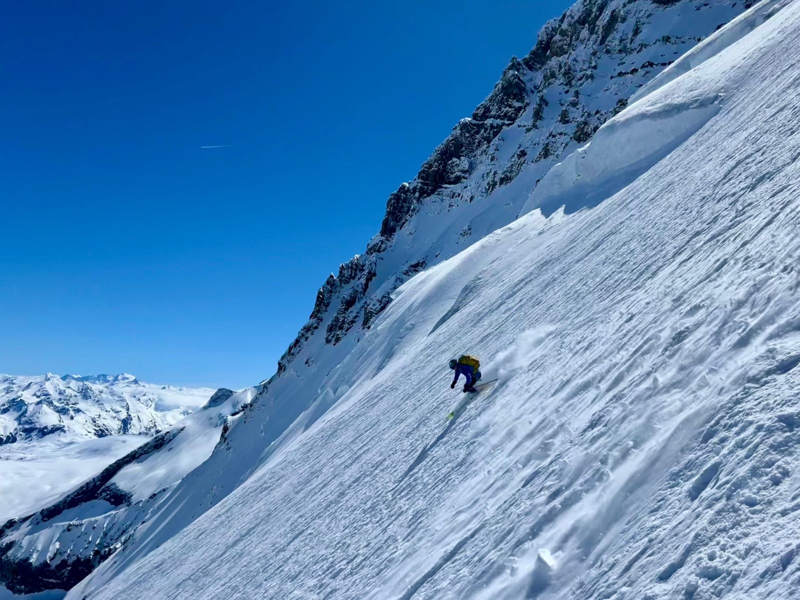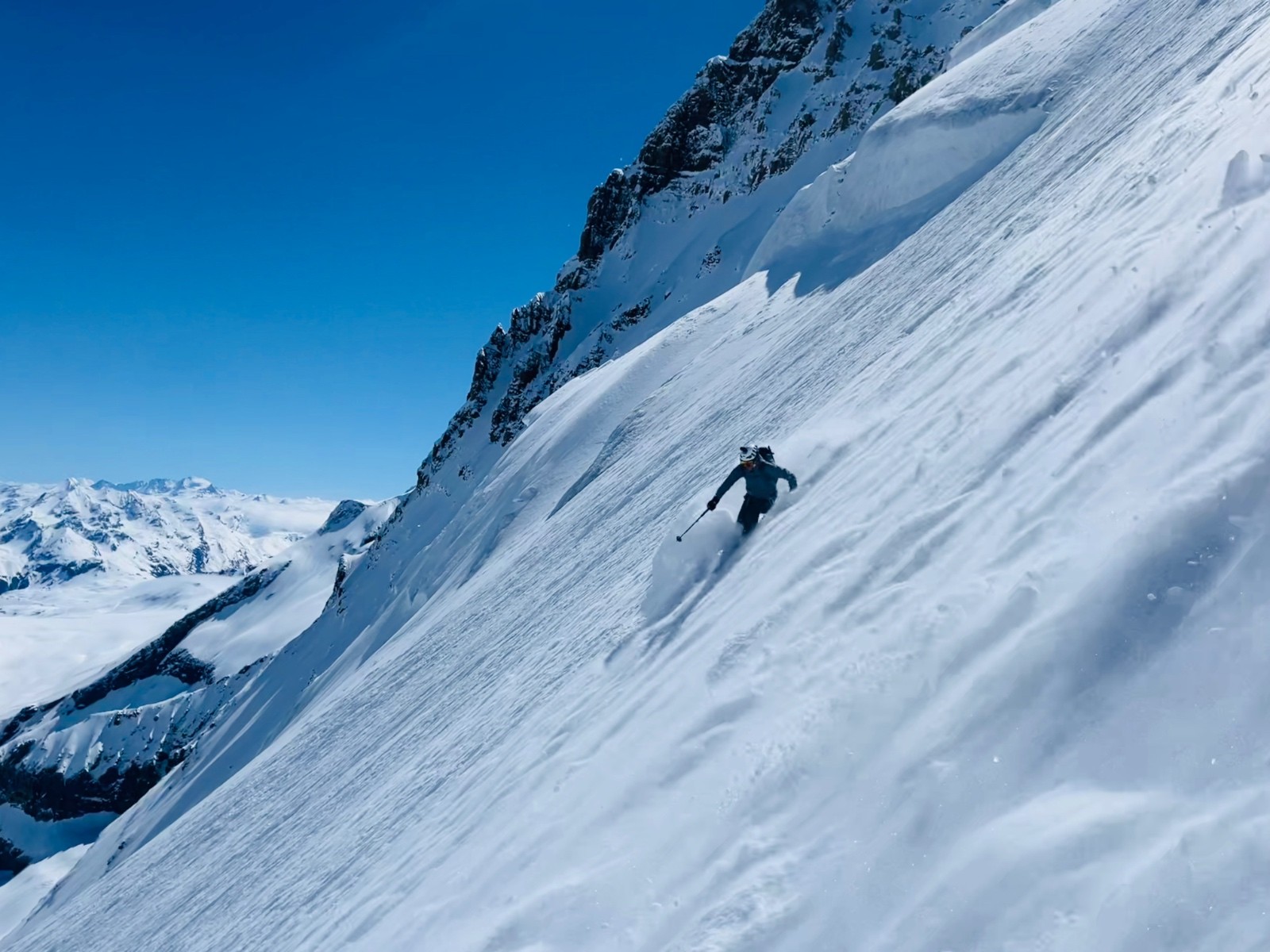 Conditions pour le ski : 40-60 de poudre dans la face un peu tassée. Pas de glace visible (on la trouve dans le haut sous 40 de poudre).