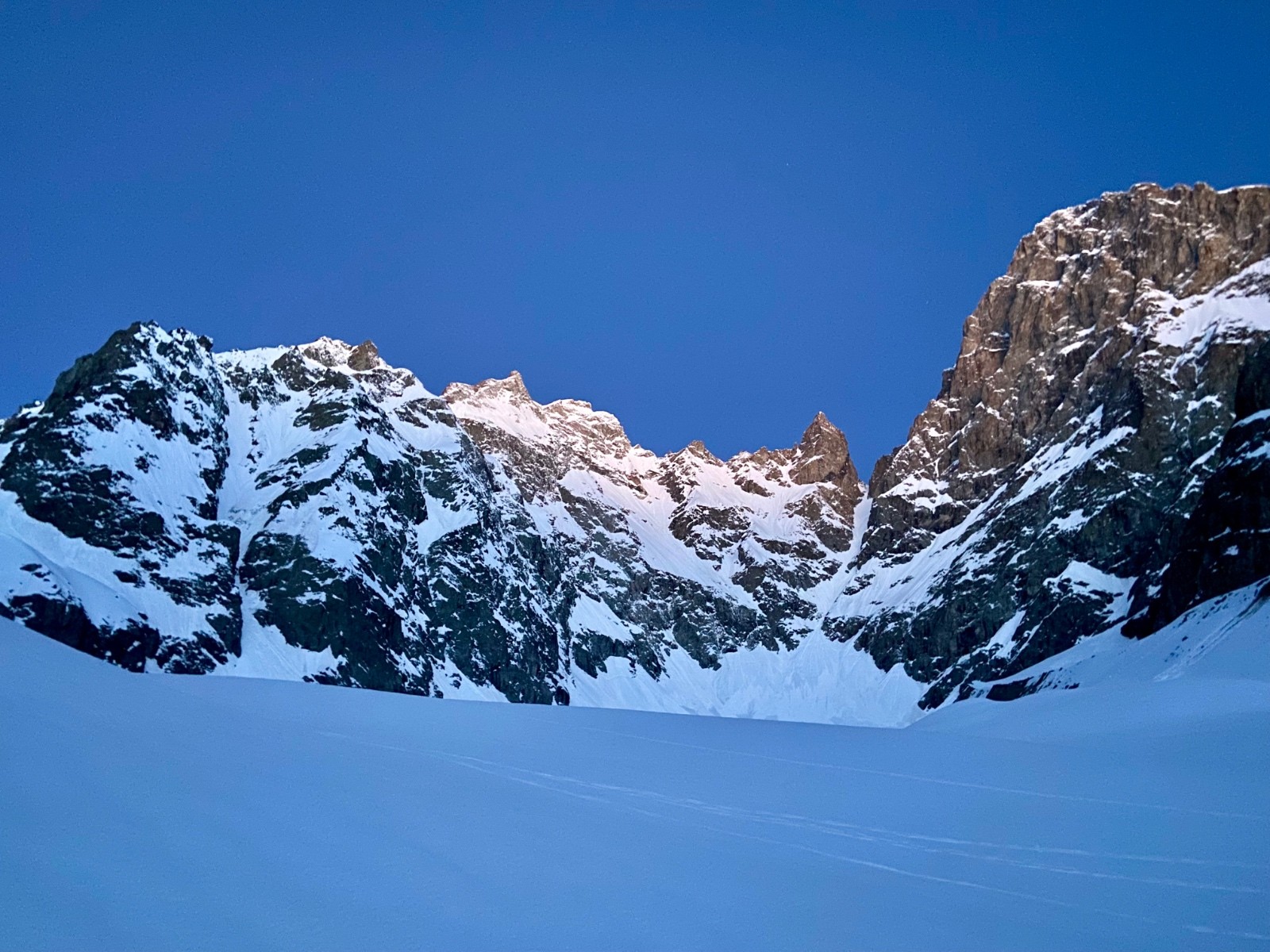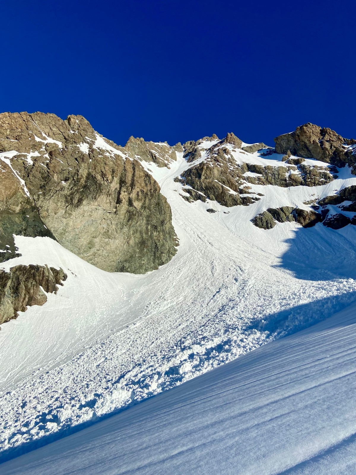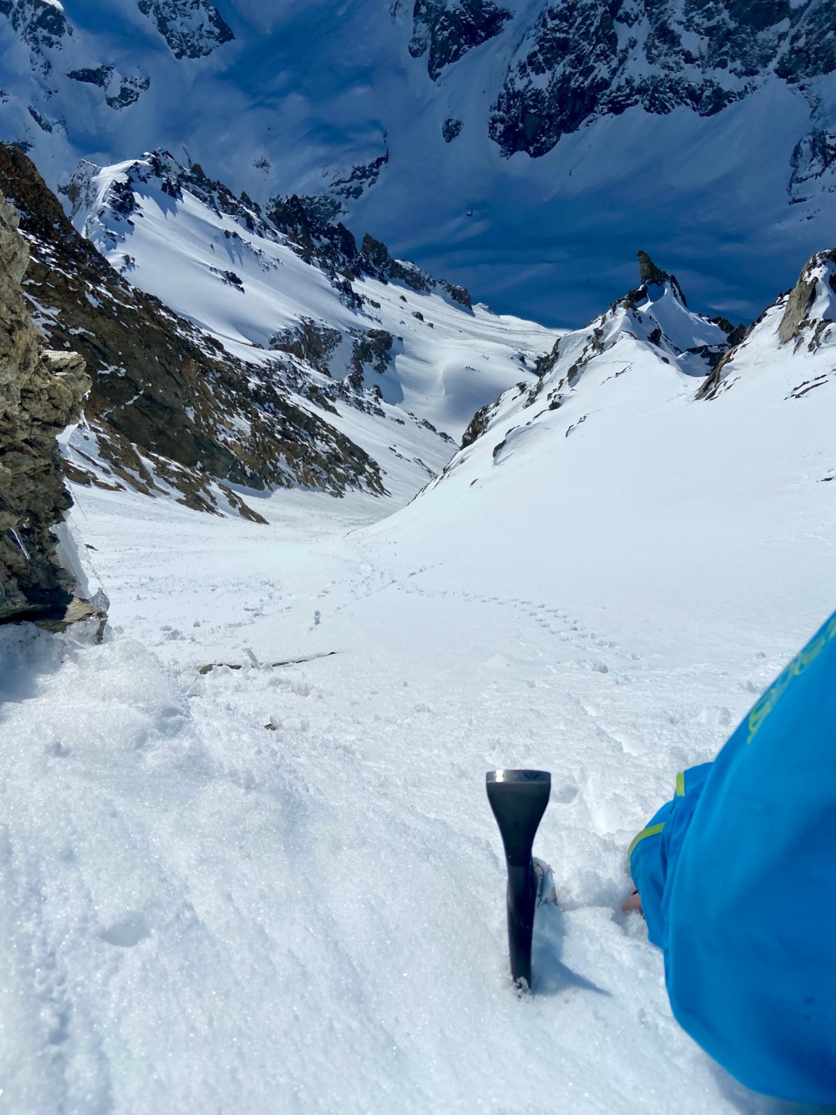 Parti assez confiant sur la possibilité de skier le col des Avalanches, j’ai rapidement vu que le ressaut du bas n’étais pas lisse (glace et rochers de visu) et précédé de 300m façon piscine à boules (de bowling). J’ai abdiqué sous la rimaye, lucide sur mes piètres capacités de grimpeur, et mon envie de me faire secouer dans un couloir peu lisse en neige dure (pas envie de prendre les résidus de la Barre sur le coin de la gueule). Demi-tour donc, non sans avoir essayé avec succès de me taillader la main en tentant de planter un ski dans la neige béton.