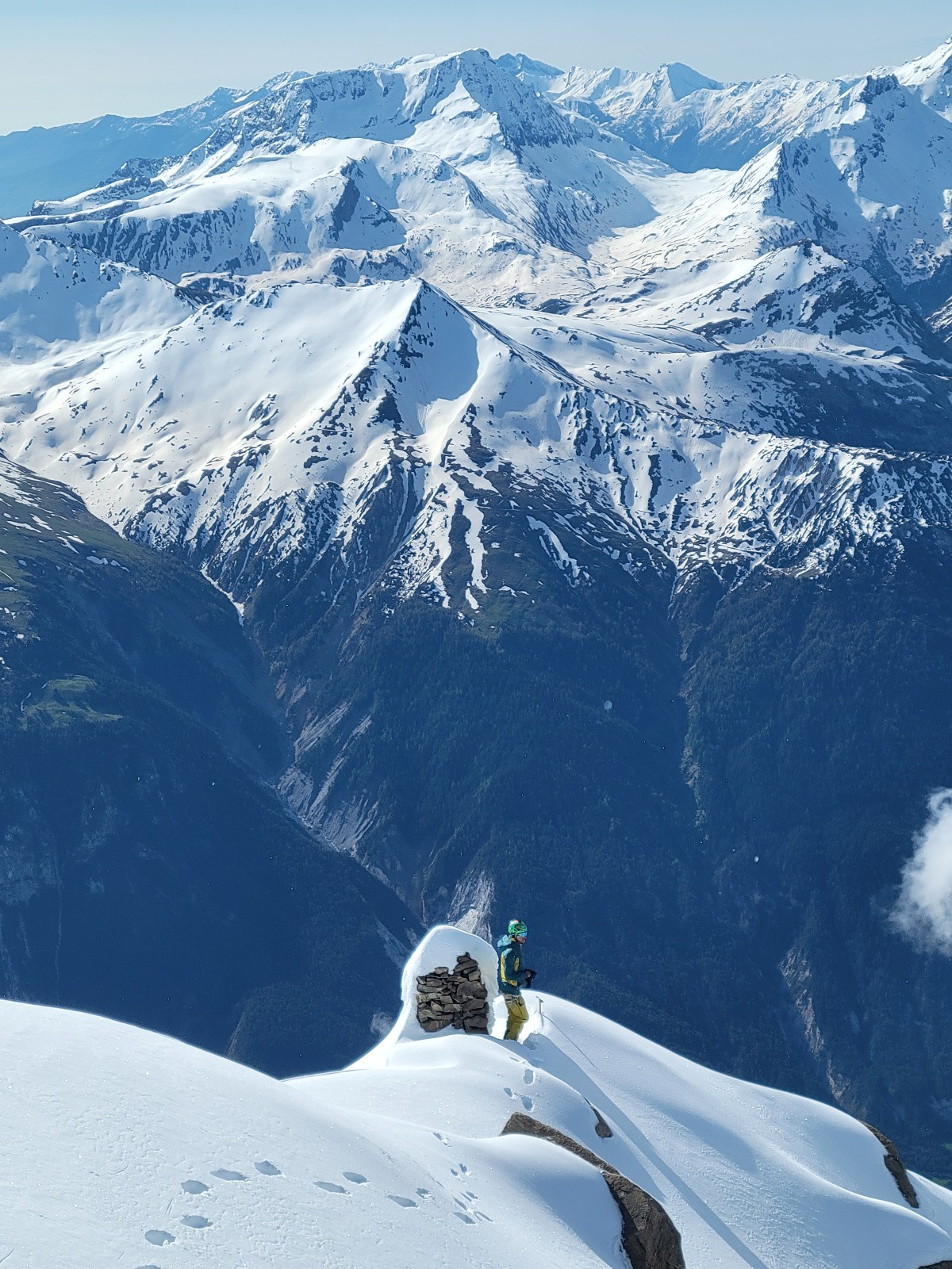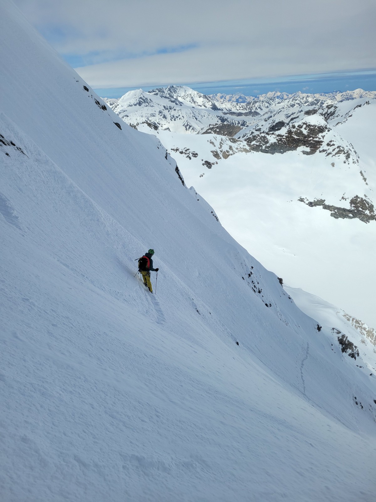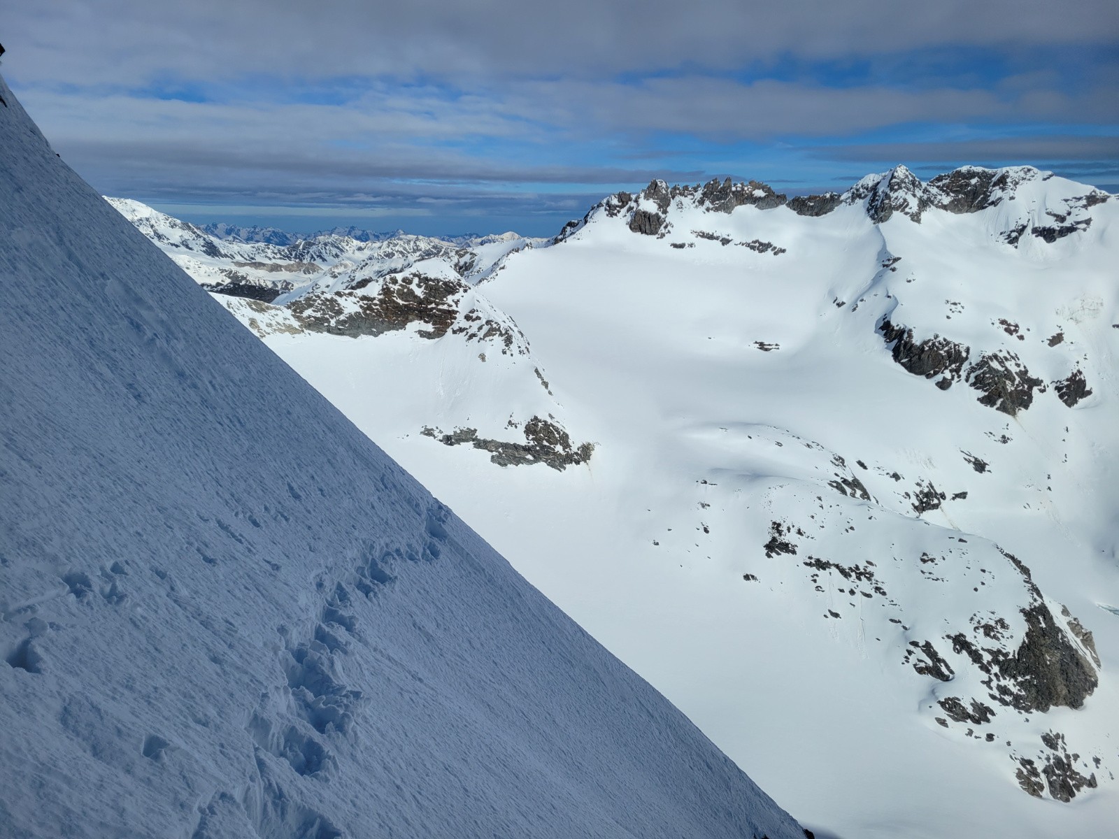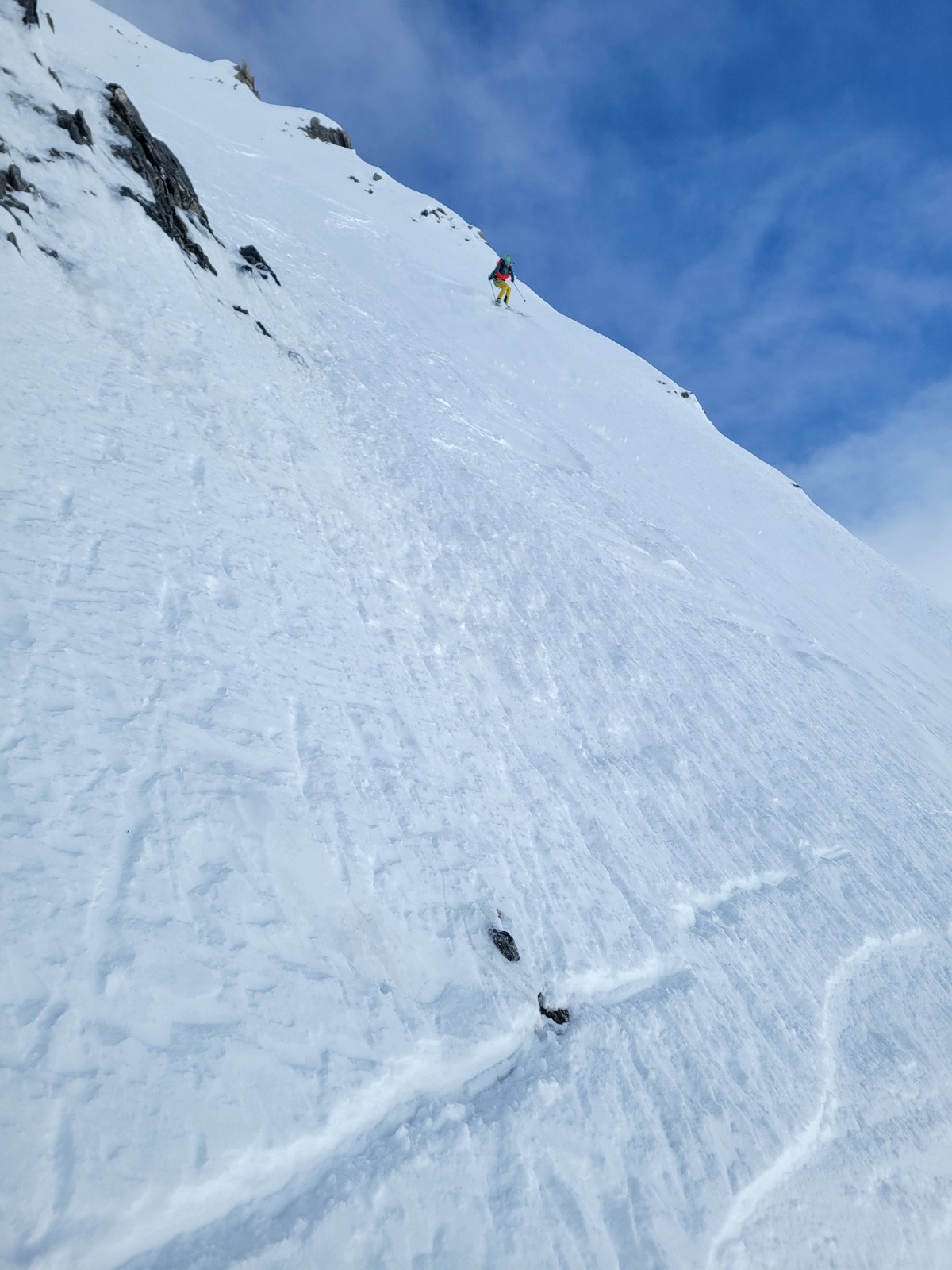 Conditions pour le ski : poudreuse pour l'essentiel dans la face, légère croûte de regel sur la partie basse mais insensible à la descente. Printemps ailleurs, névé sur les 100 derniers mètres avant Fournache.