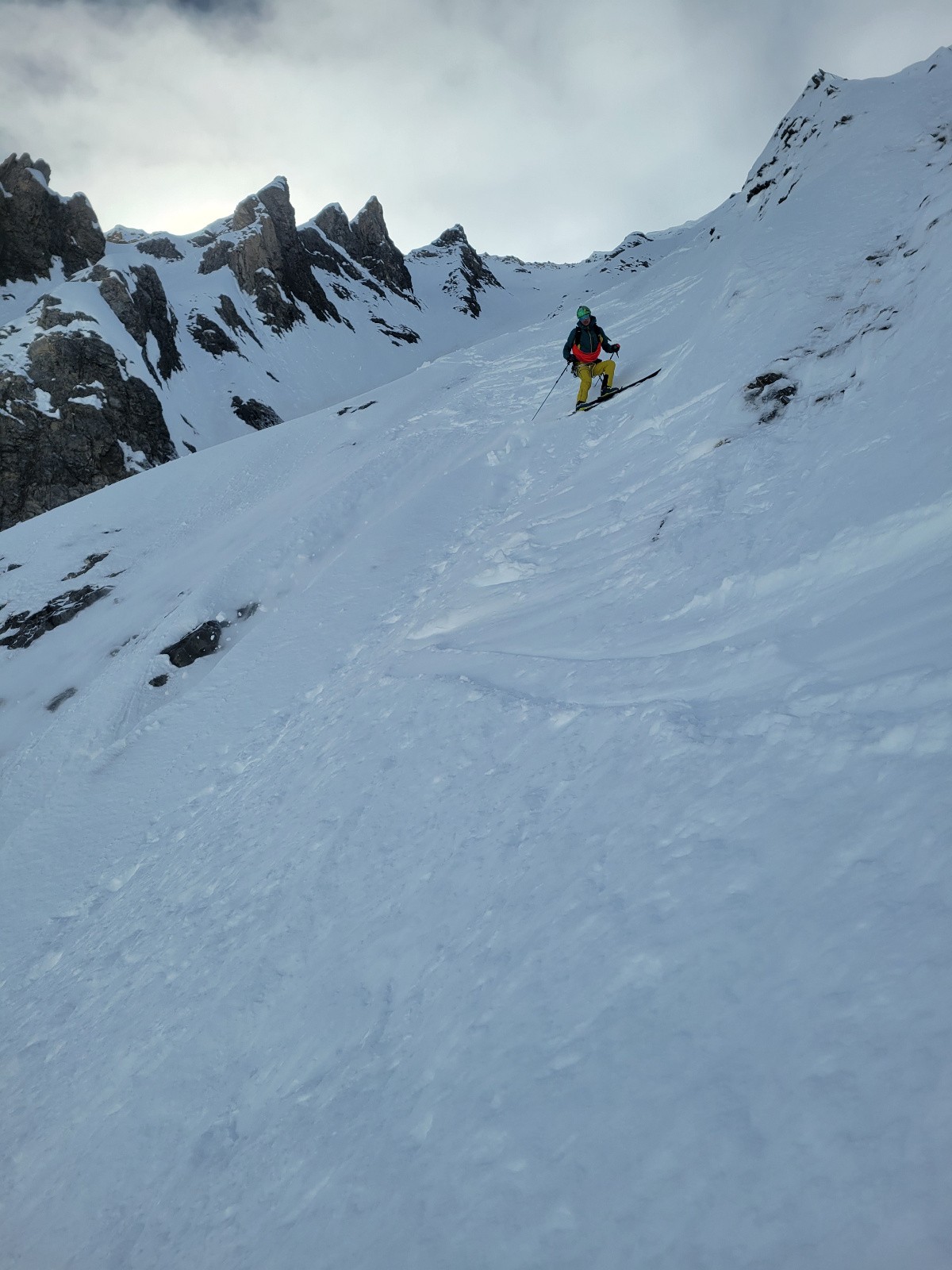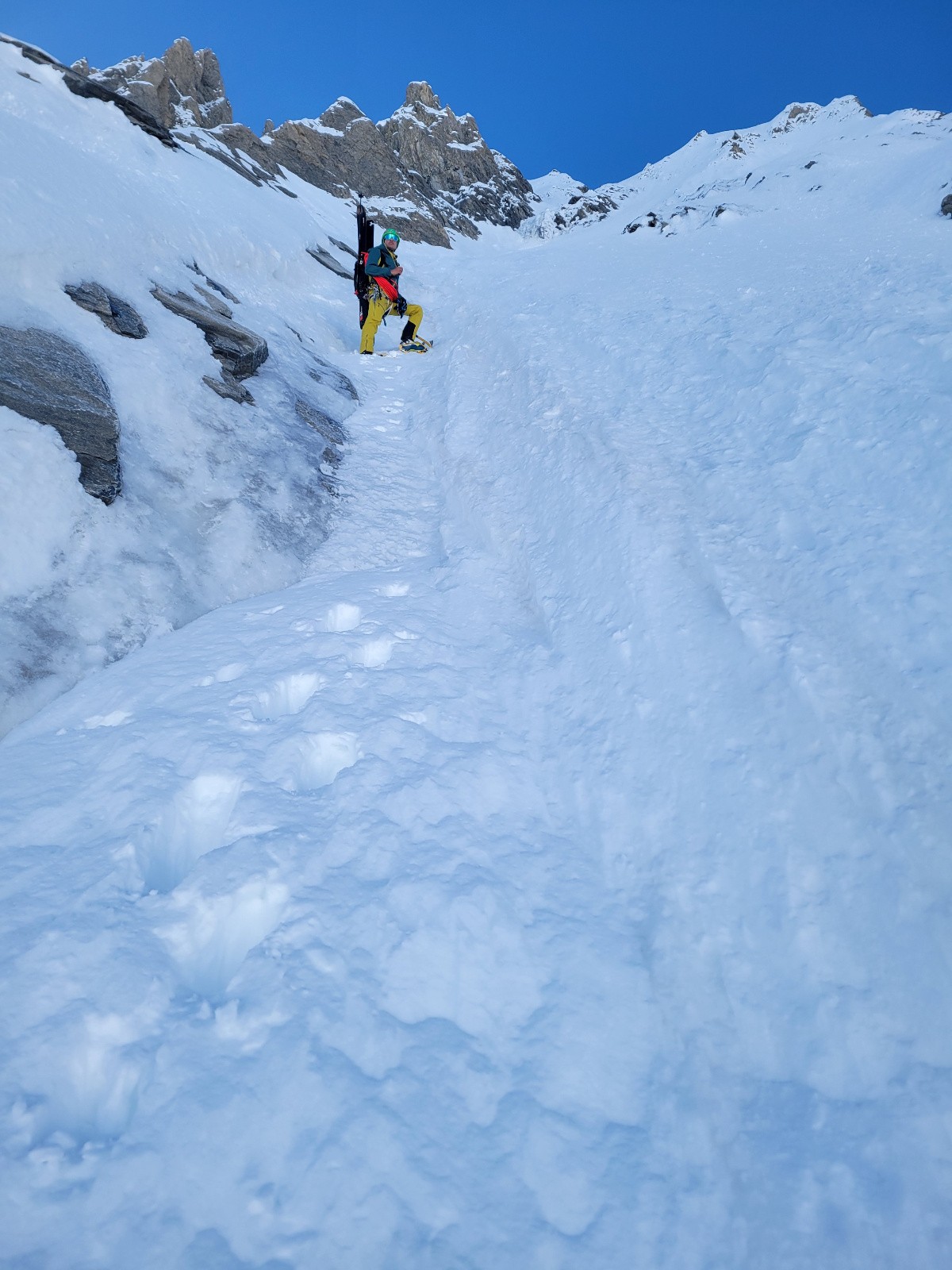 Itinéraire suivi : Partis du refuge de Fournache, on a chaussé devant le départ du TS de Fournache direction le col de Labbye en gardant la neige bien à droite du refuge de la Parraché. Descente par le glacier de la Mahure jusqu'au pied de la face. Une quinzaine de mètres en glace au passage de la barre de pied de face. Trace relativement facile à faire ensuite dans une neige froide assez compacte. Descente en bonne condition, très bon enneigement, pas touché un rocher. On a tenté d'échapper au rappel dans le bas en faisant une diagonale rive gauche mais une dernière petite goulotte nous a obligés à sortir la corde et faire un petit rappel de 10 m skis aux pieds. Ce passage nous a pris un peu de temps, le rappel de 40 m sur le bon relais en place aurait été aussi bien. Remontée au col de Labbye et retour comme à l'aller avec 2 cours déchaussages.
