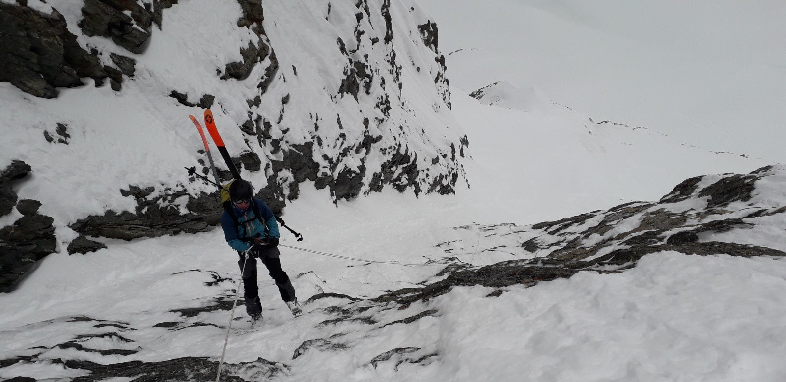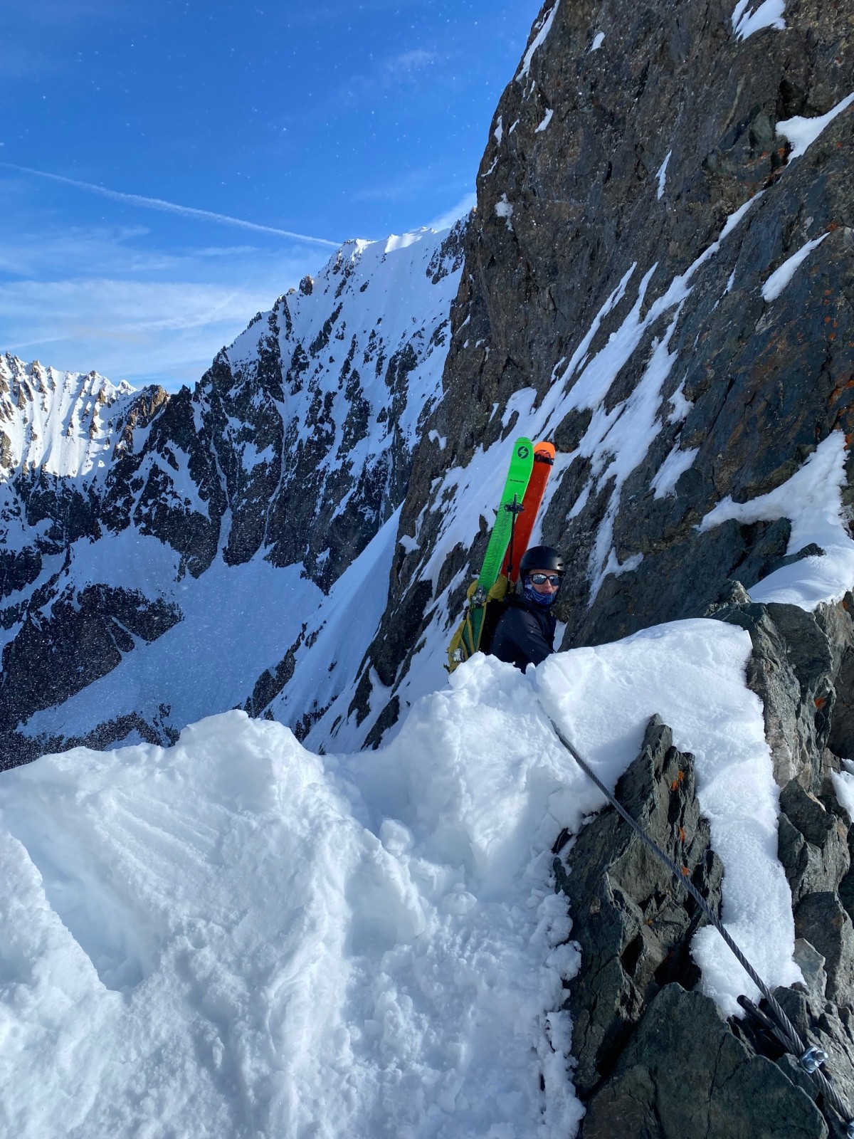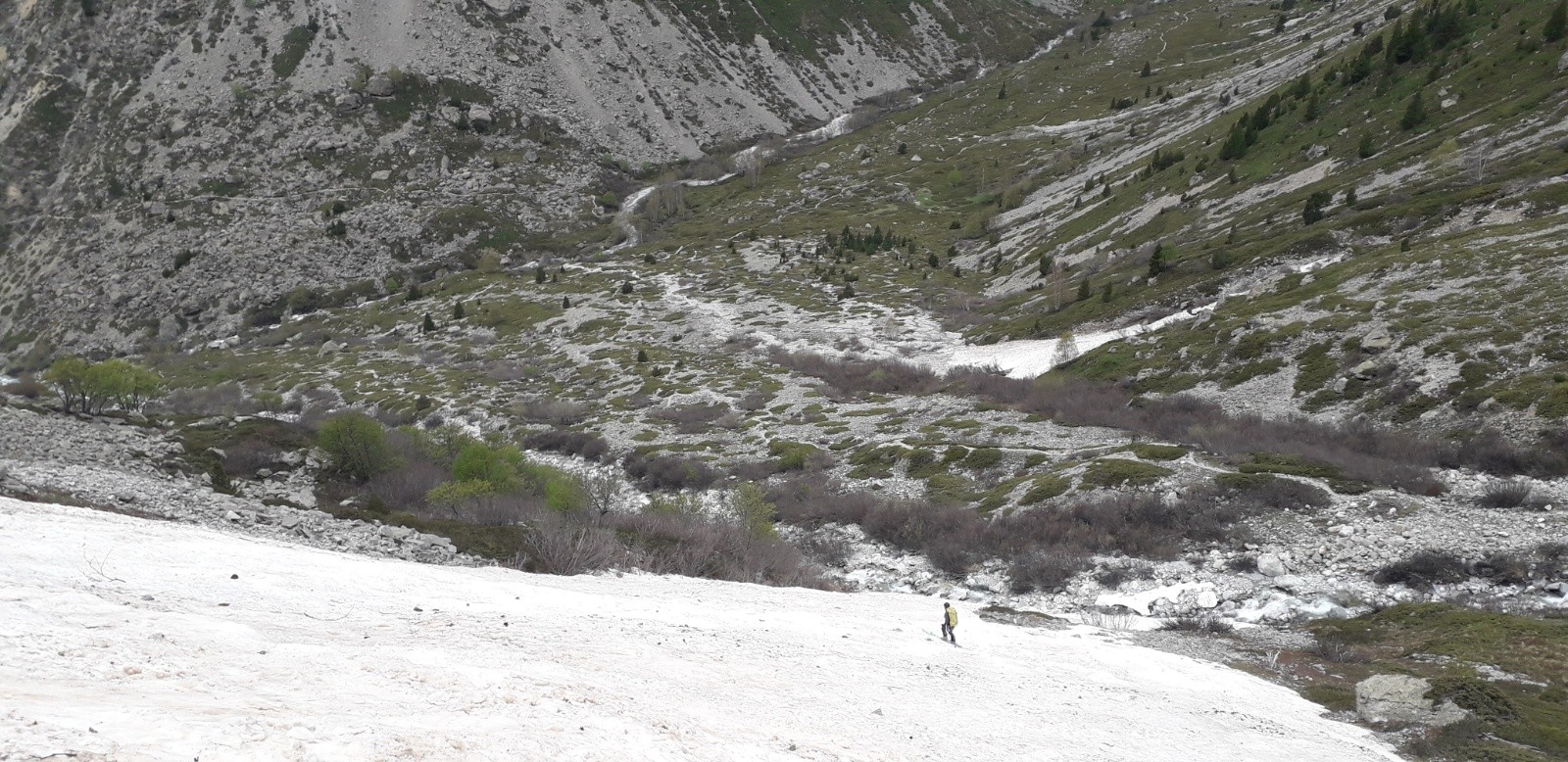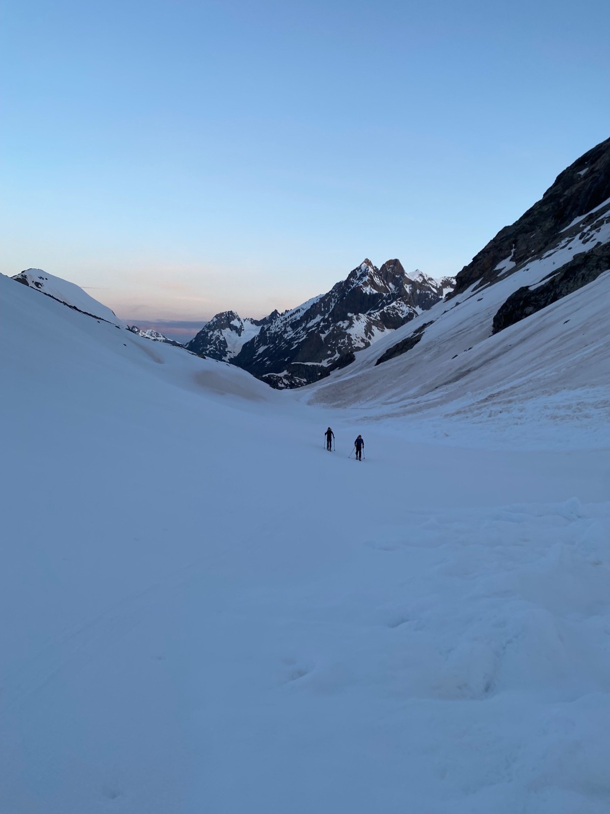 Altitude de chaussage/déchaussage : A la montée nous avons remonté le vallon à pied jusqu’à 2500 et à la descente on a emprunté un névé en nord qui nous a permis de déchausser vers 2000