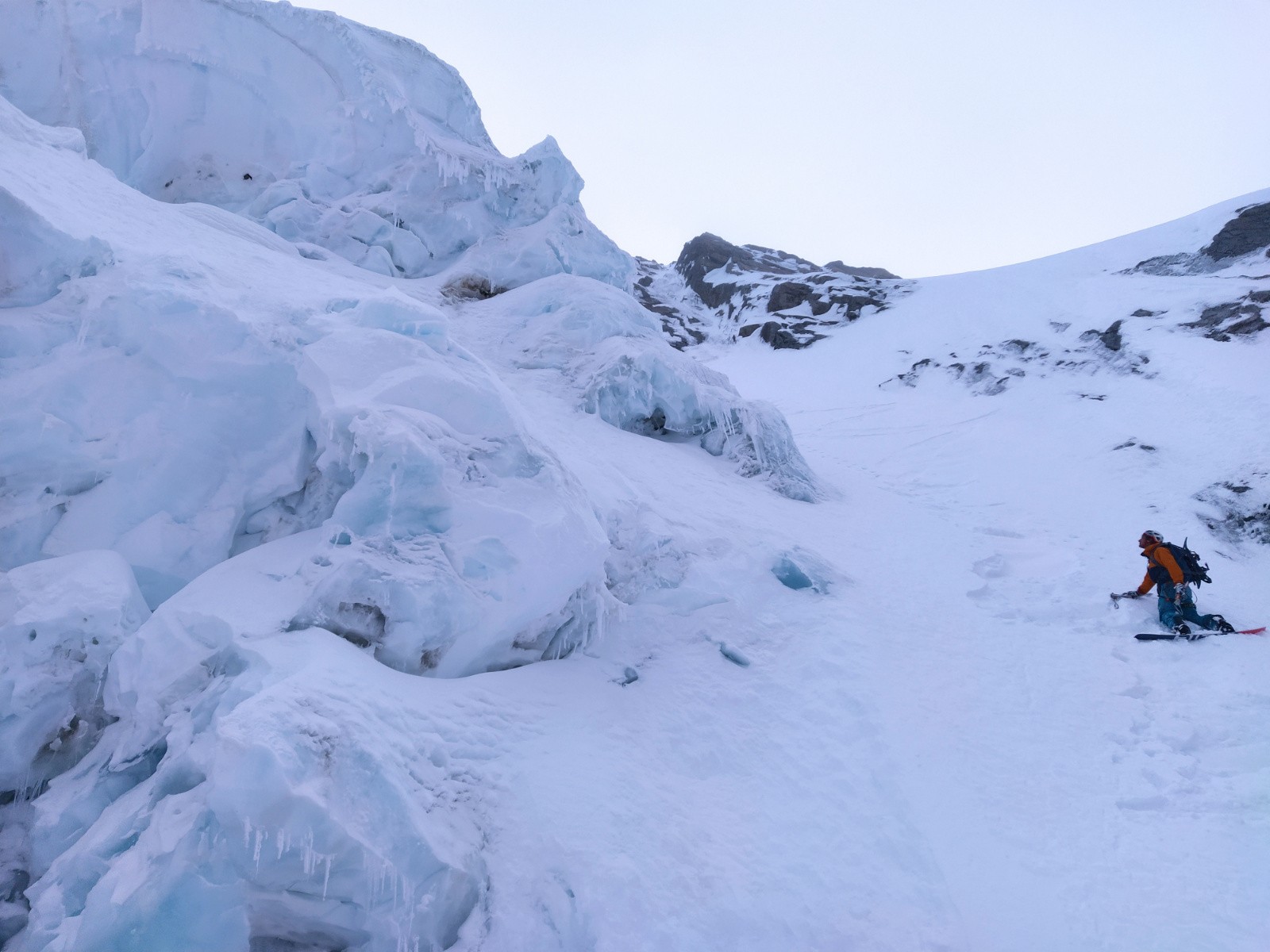 Conditions pour le ski : Dur/croutée dans le couloir du haut, bof. Neige revenue, poudre humide dans toute la partie médiane, agréable à skier