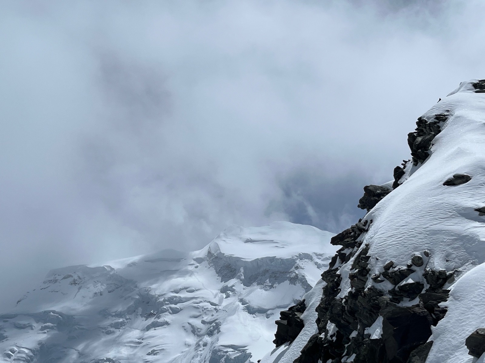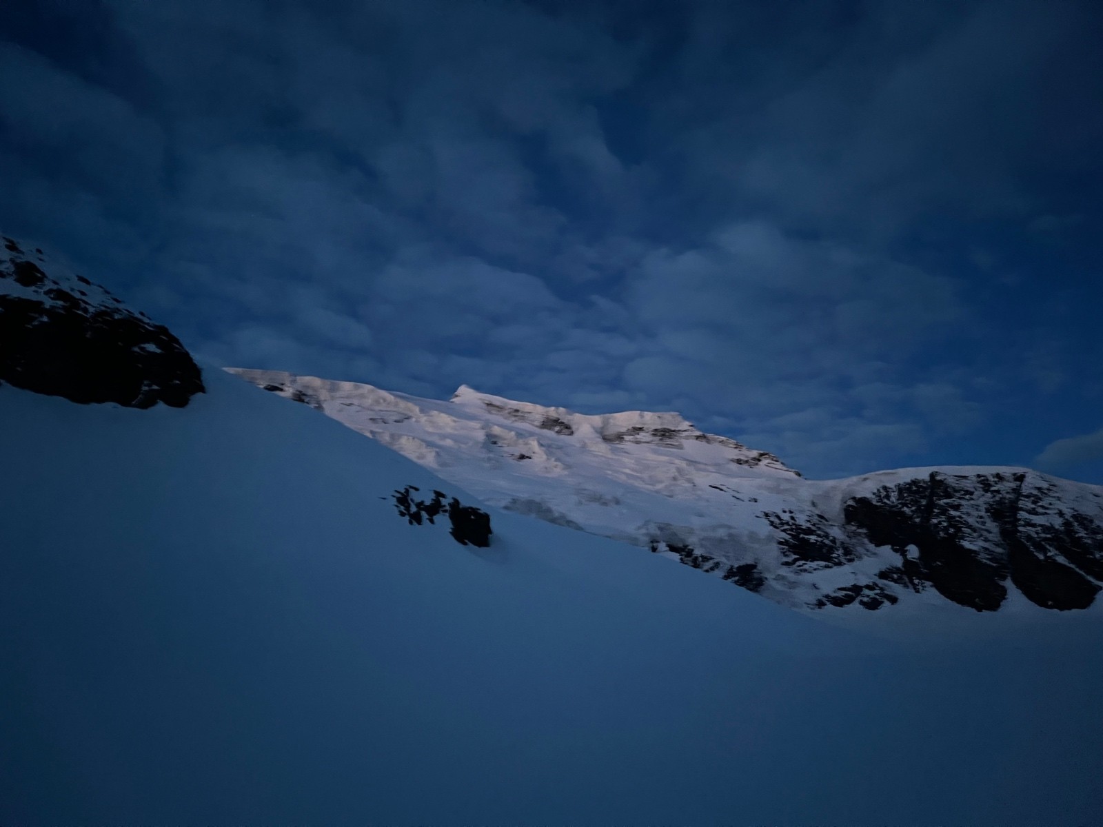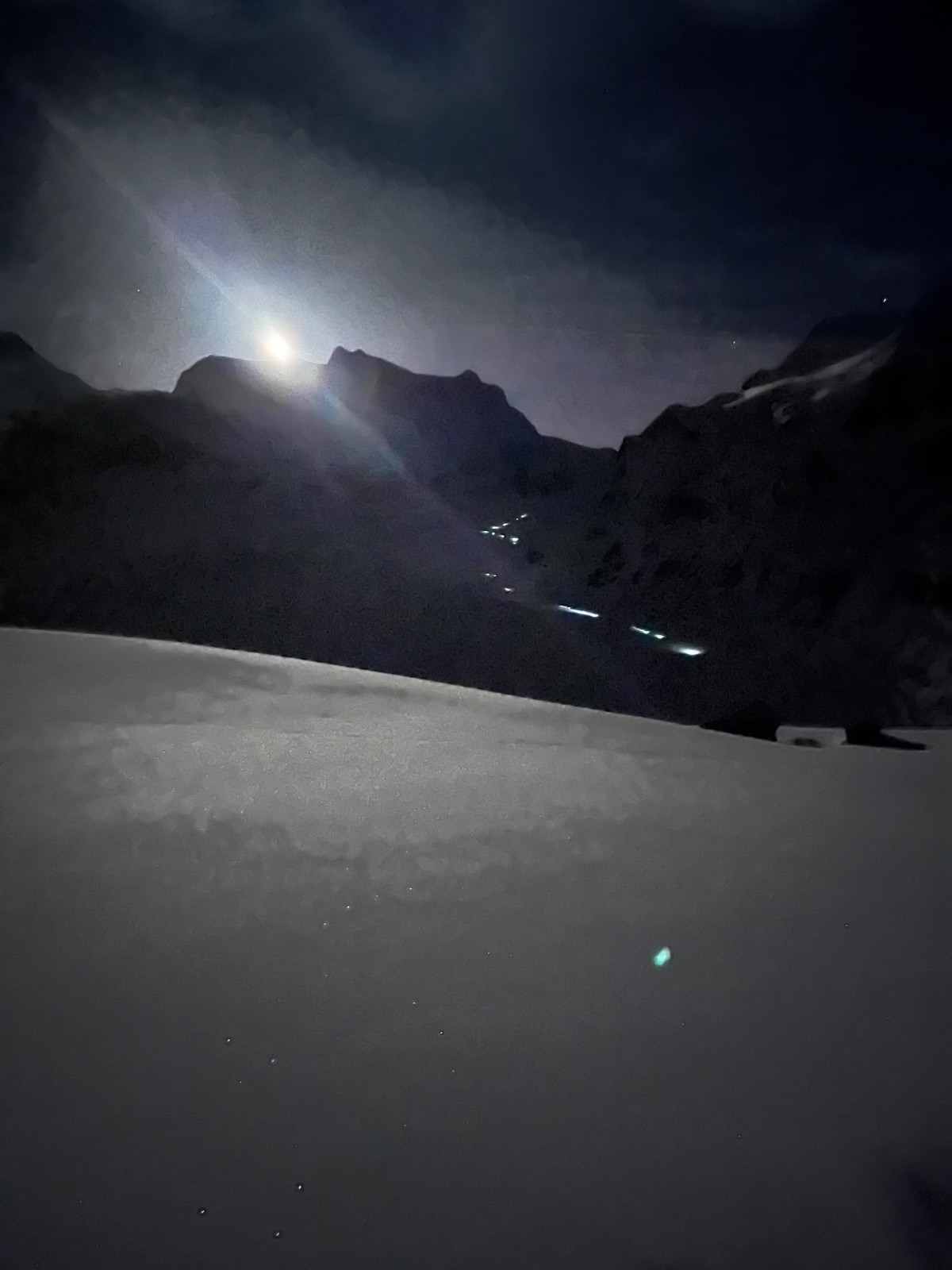 Jour2: 3h15/14h remonté la moraine jusqu’au pied du mur où nous avons chaussé les crampons à 3100 jusqu’à 3600 remis les skis pour atteindre la dernière pente remontée en piolet crampons sur 100m