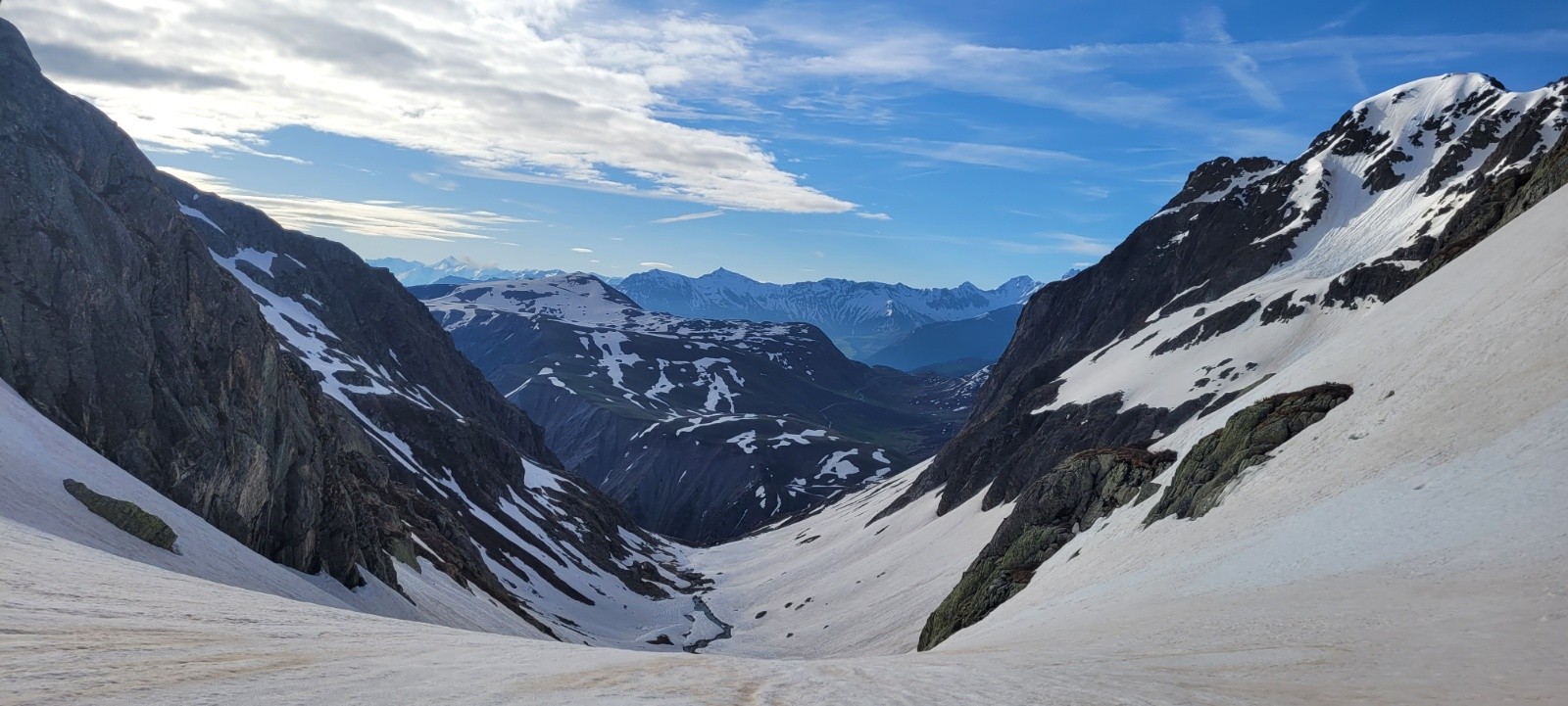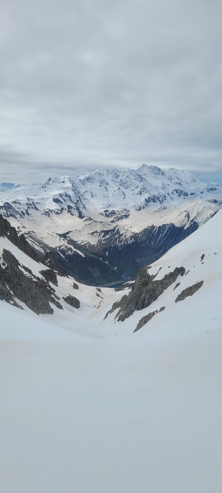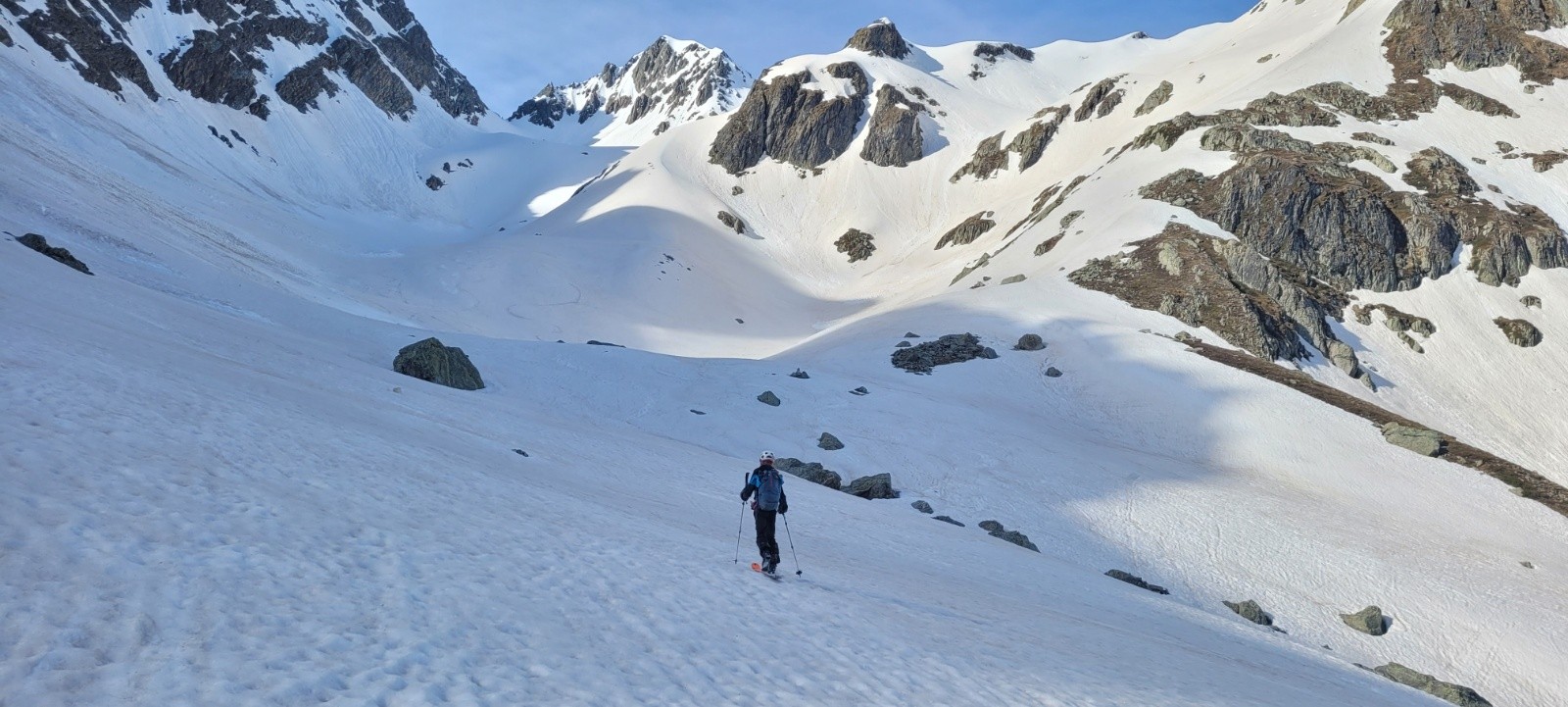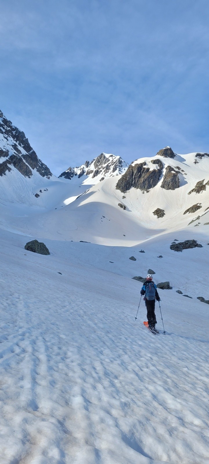 On entame alors la meilleure descente de la journée en sud sous le Col de la Combe madame en moquette 4*.