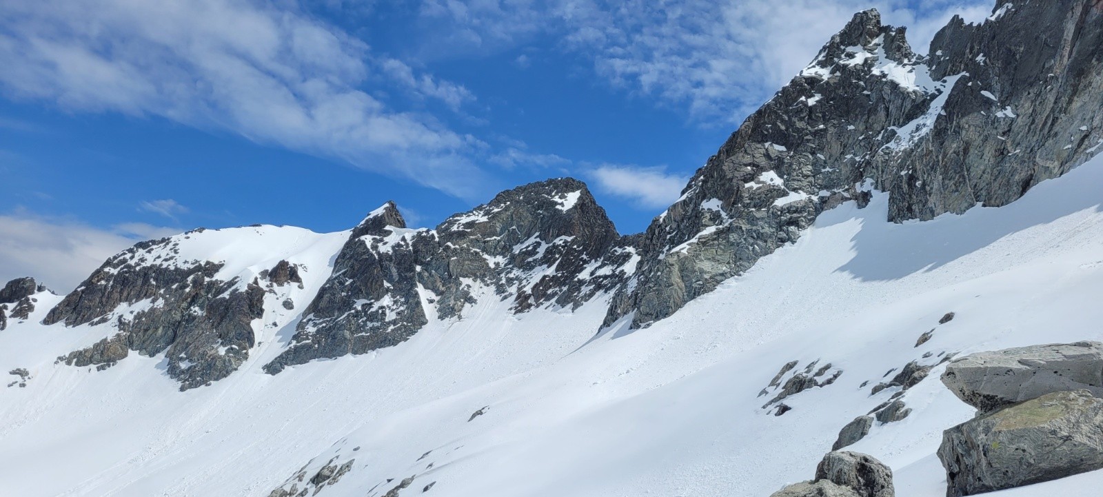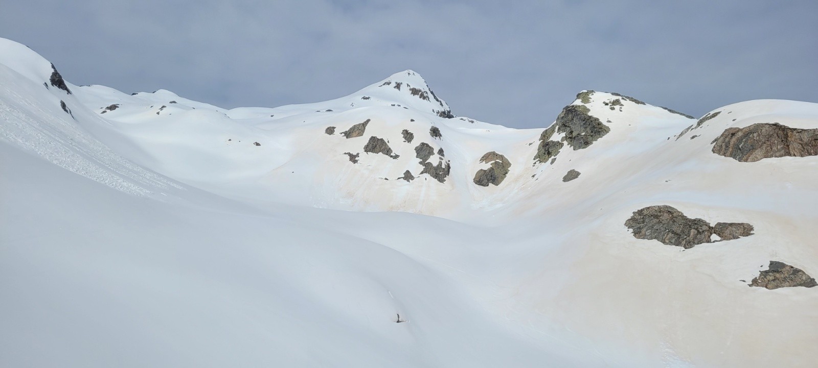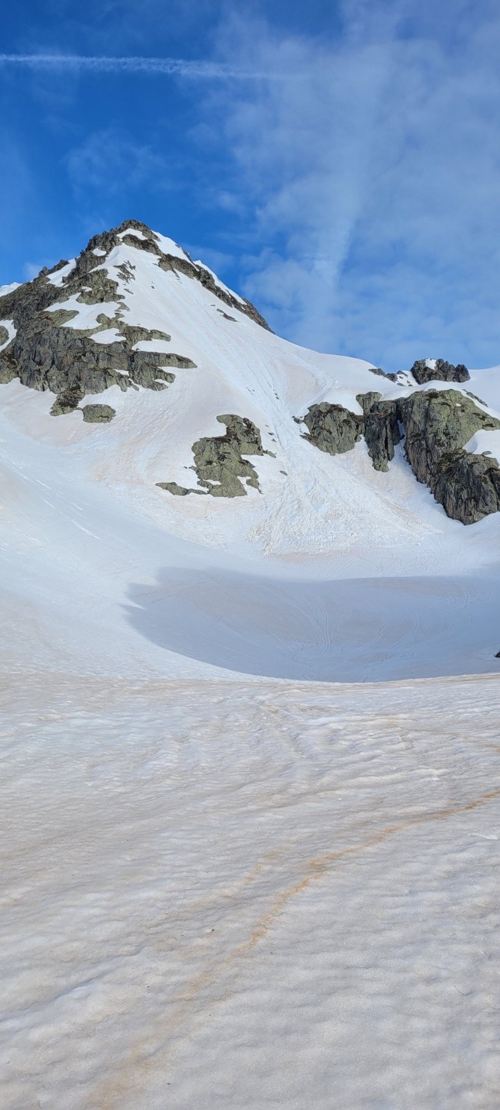 S'ensuit une remontée exténuante vers le Col de Buyant. J'avance comme une limace dans cette neige lourde qui s'effondre, le tout avec une chaleur exténuante... Compte tenu de mon état et de l'horaire, on zappe le sommet du Rocher Blanc. S'ensuit une belle déception avec une neige bien lourde et bien collante déjà en NE sur la descente du Rocher Blanc. On n'a rien raté... Je me demande ce qui est le plus fatigant dans ces conditions, la montée ou la descente?