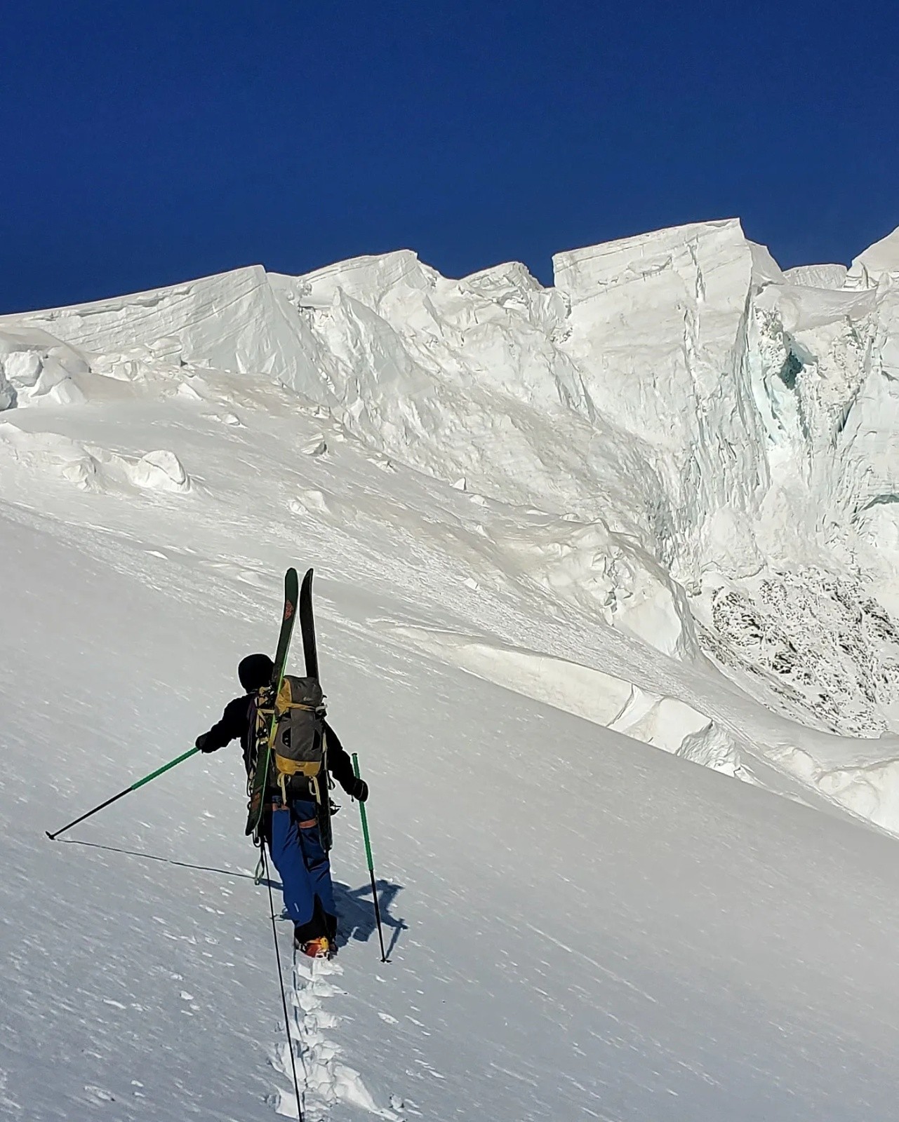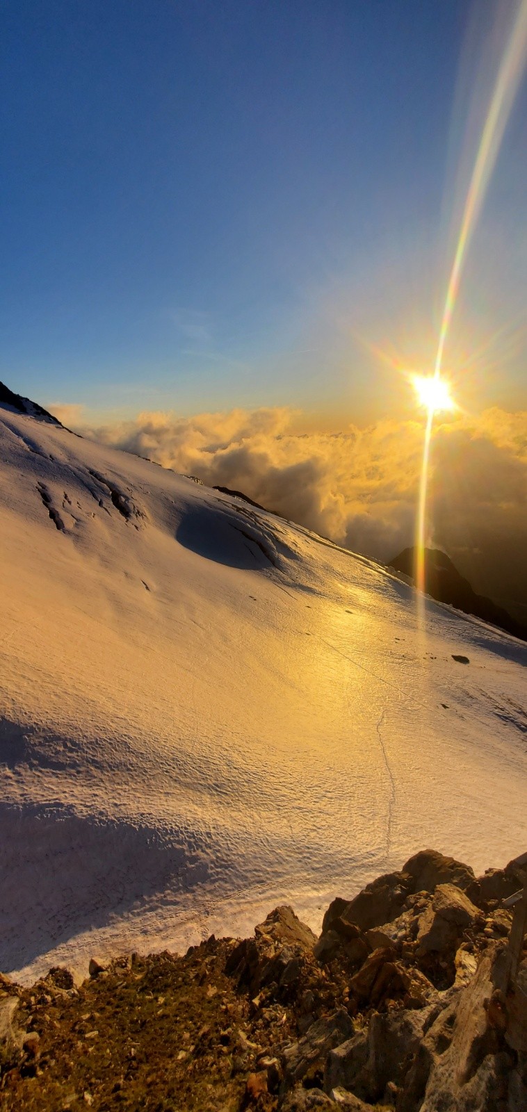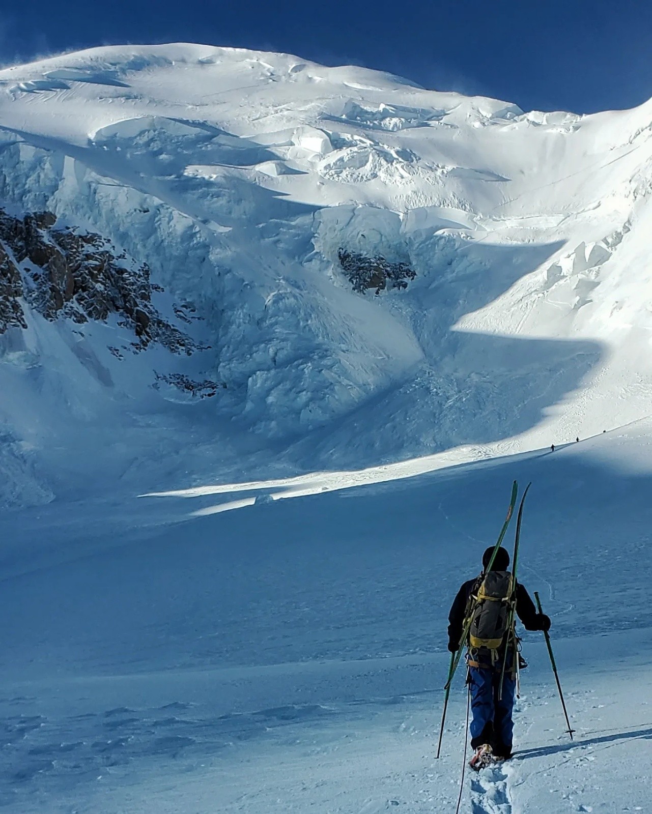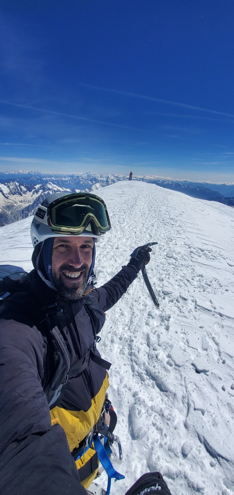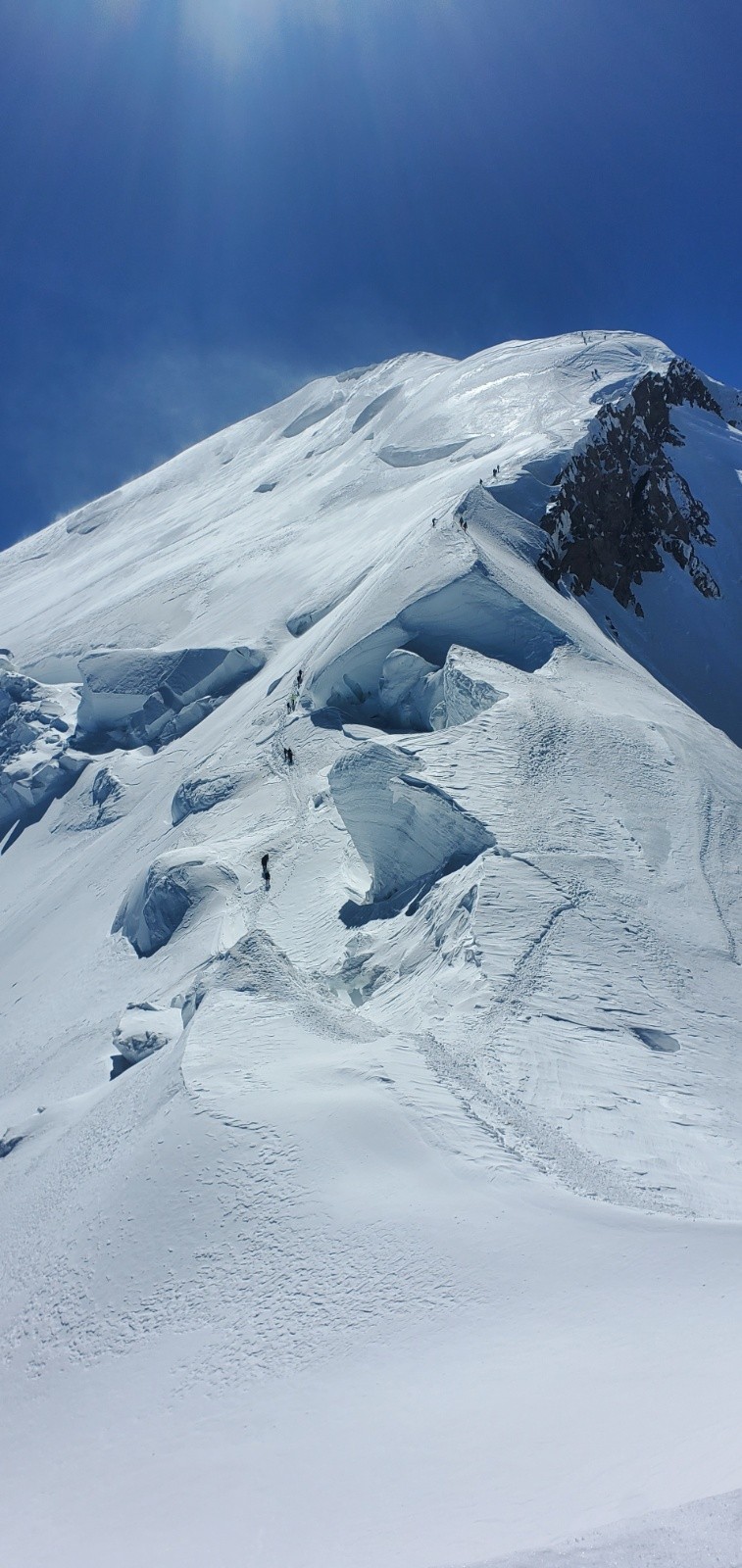 On se lève vers 3h30, on est les derniers à partir du refuge sur les 15, 20 personnes du jour. La neige est bien dure et on part en crampons, qu'on gardera jusqu'au bout plus par flemme de chausser. Pause au refuge Vallot pour reprendre des forces, se mettre un peu à l'abri du bon vent sur l'arête des bosses et laisser le split ici. J'arrive au sommet vers 11h30, petite photo et je descend rejoindre mon pote qui m'attend à Vallot.