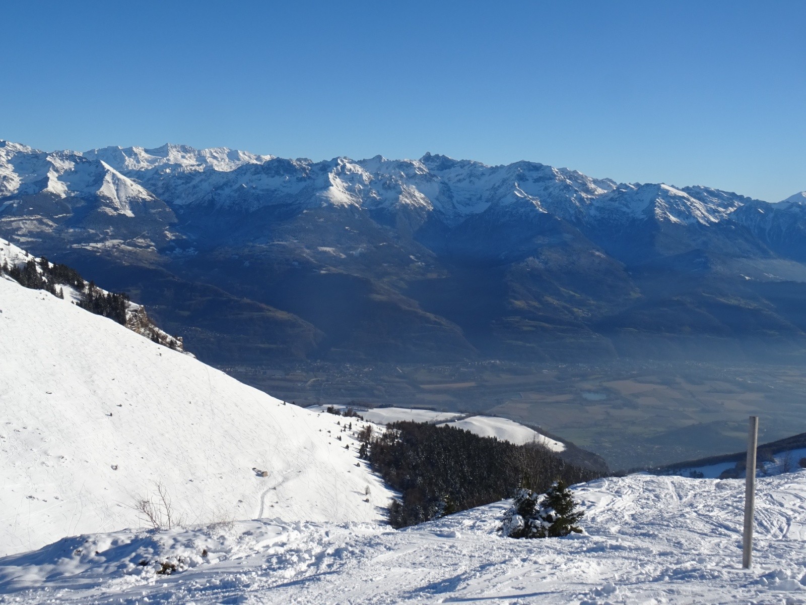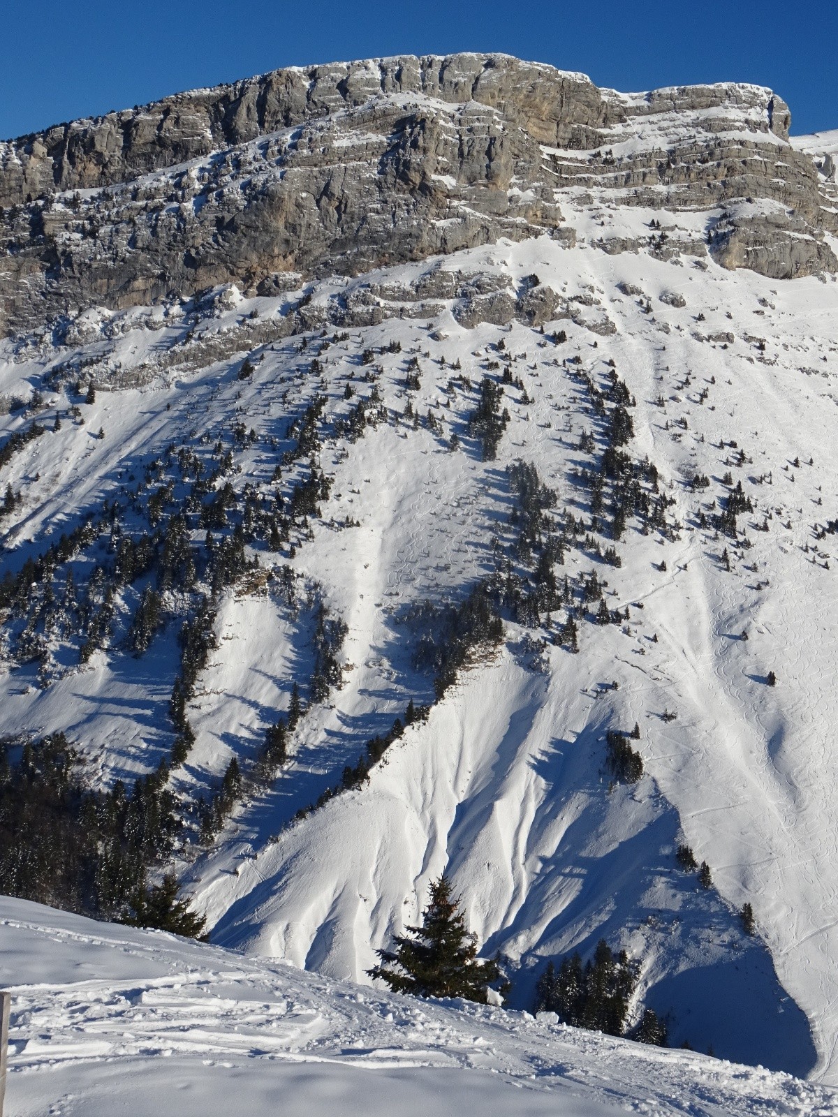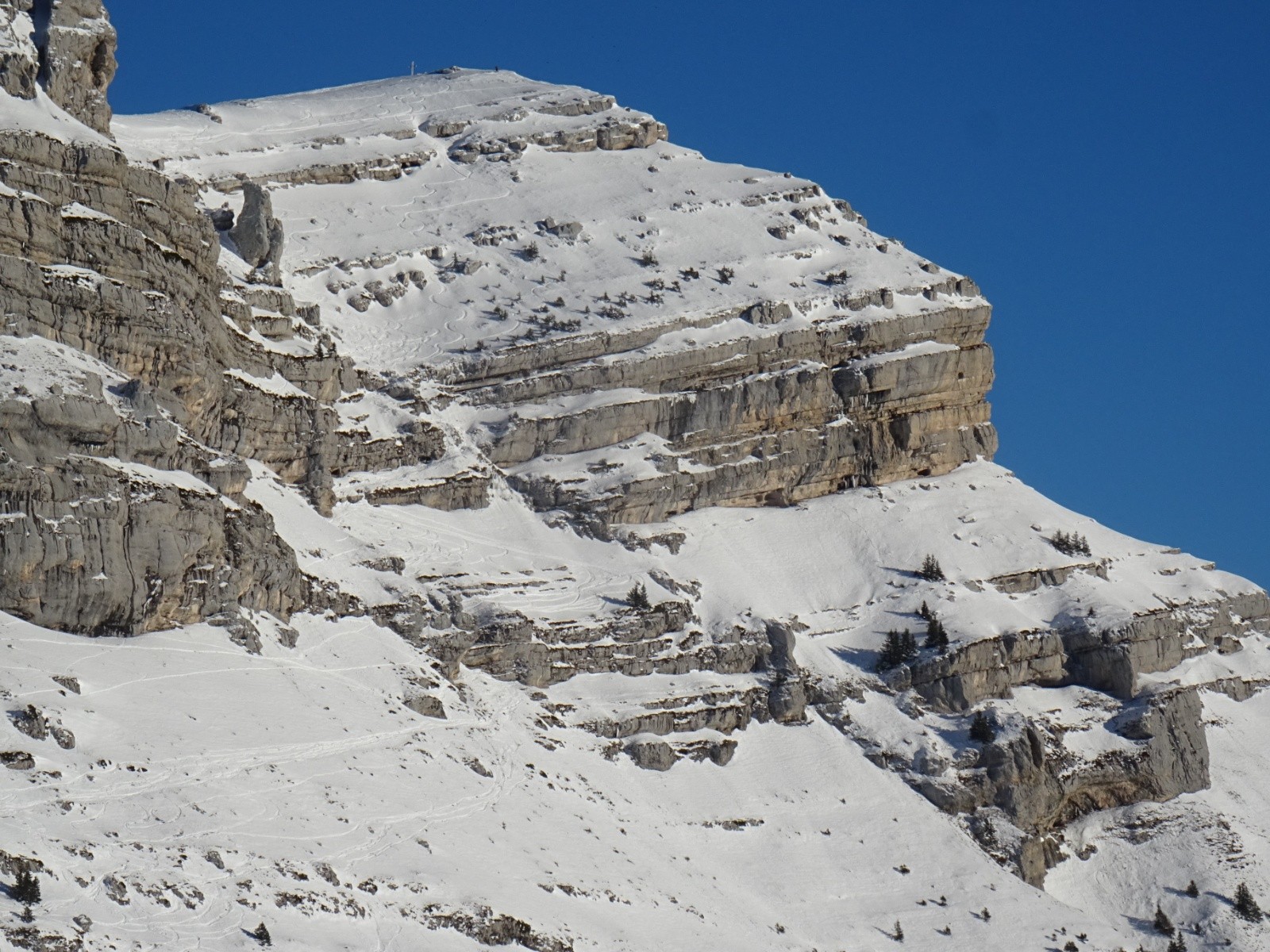 Conditions pour le ski : neige juste correcte dans l'ensemble, entre "vieille poudre", traffolée, et "petite croûte se décroûtant" ; skis 'cailloux' bien recommandés - surtout pour le haut sous les falaises, la prairie va plutôt bien mais il faut être prêt à s'alléger le cas échéant... Quelques passages restés en poudre légère ici ou là en cherchant un peu, et en restant léger.