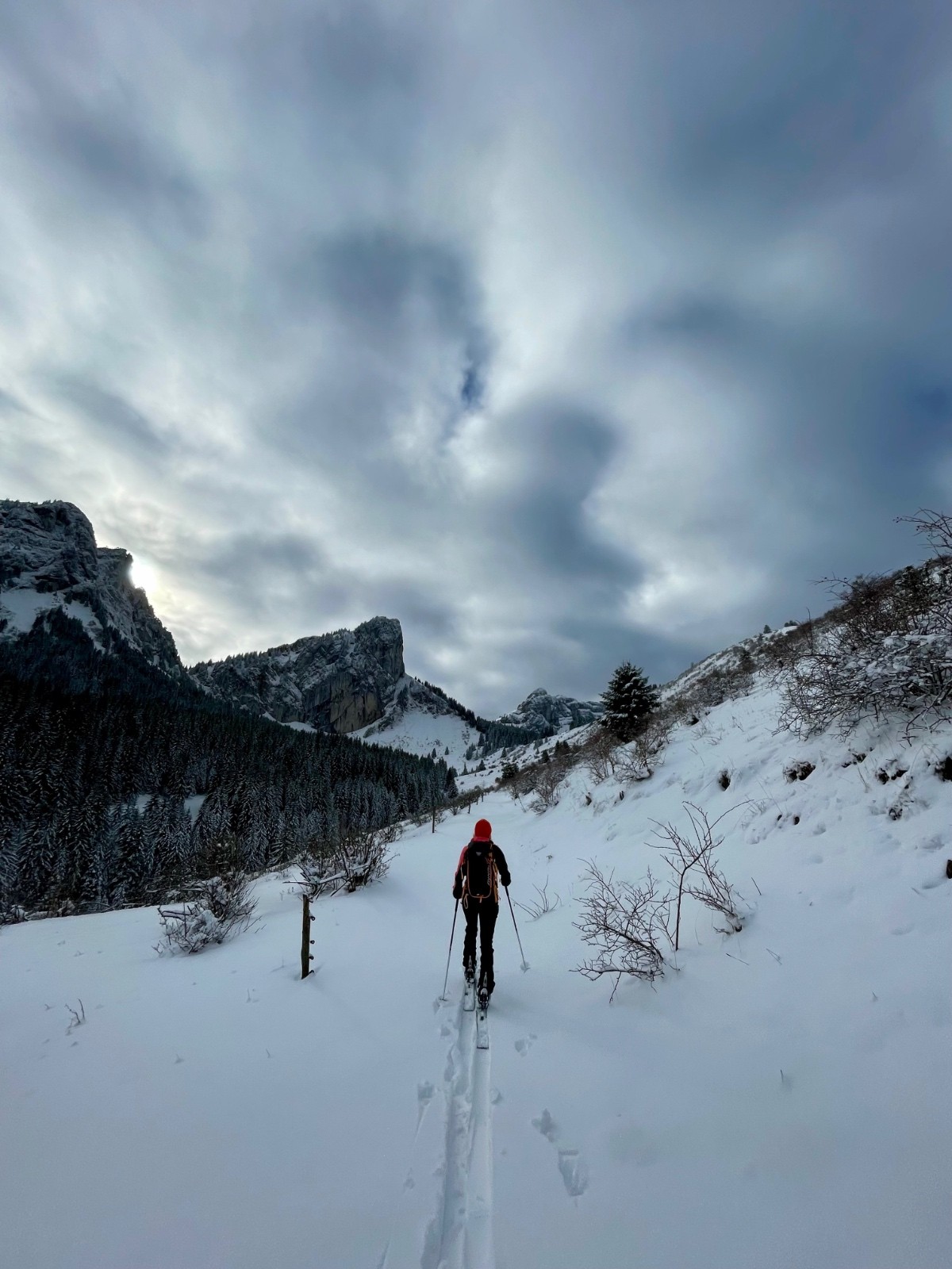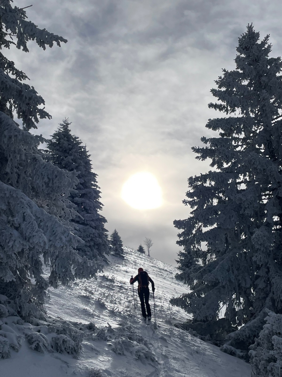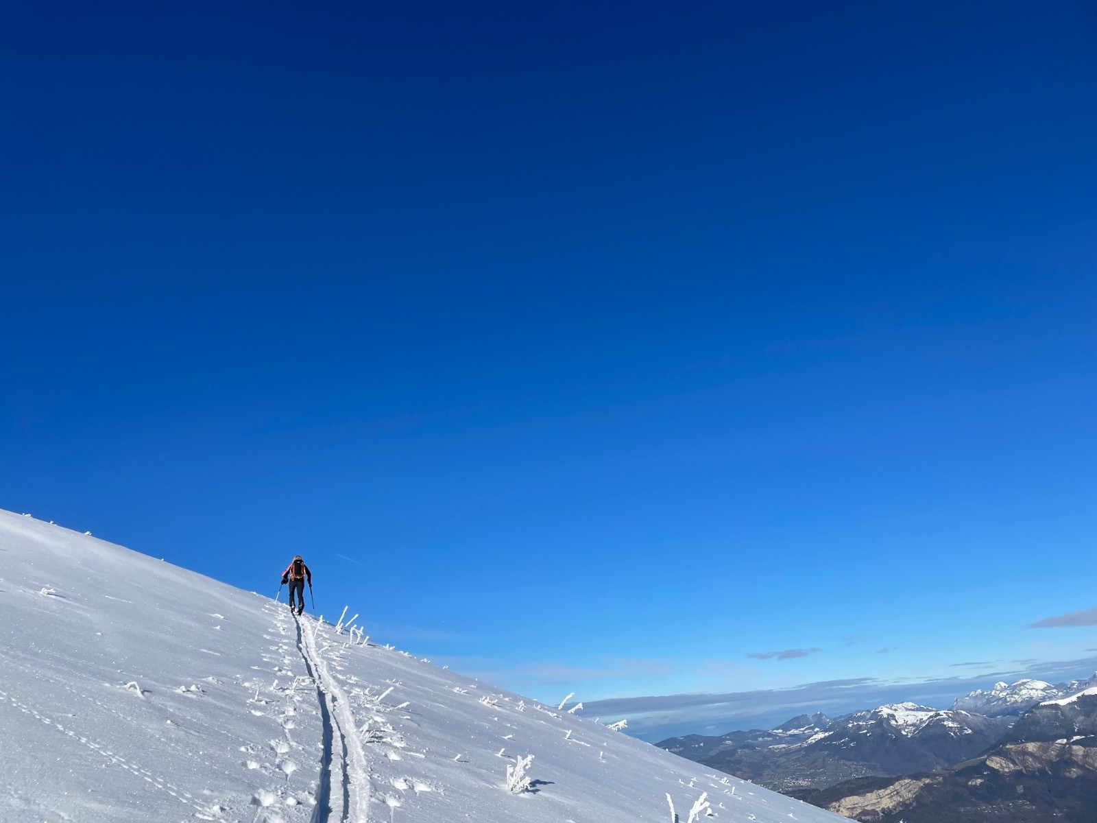 - avaler de nouveau la pente, entendre les semelles crier vers le bas, admettre qu'il faut mettre les skis sur le sac ;