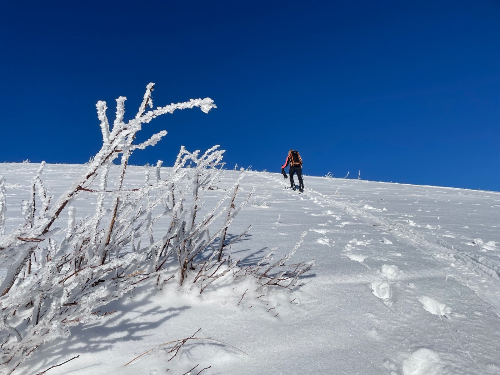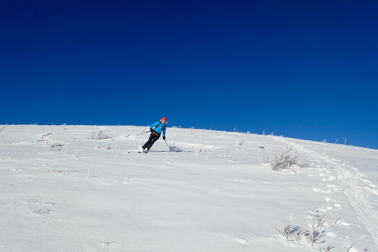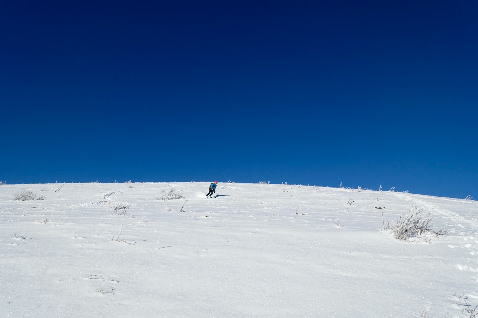 - avaler de nouveau la pente, entendre les semelles crier vers le bas, admettre qu'il faut mettre les skis sur le sac ;
