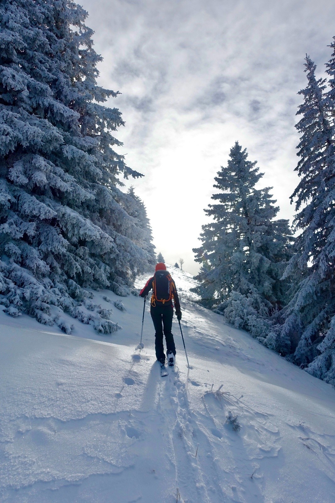 - porter longtemps sur le raide chemin de la forêt, et à chaque fois que les skis accrochent les branches des conifères chargés de neige, s'en prendre plein le col ;