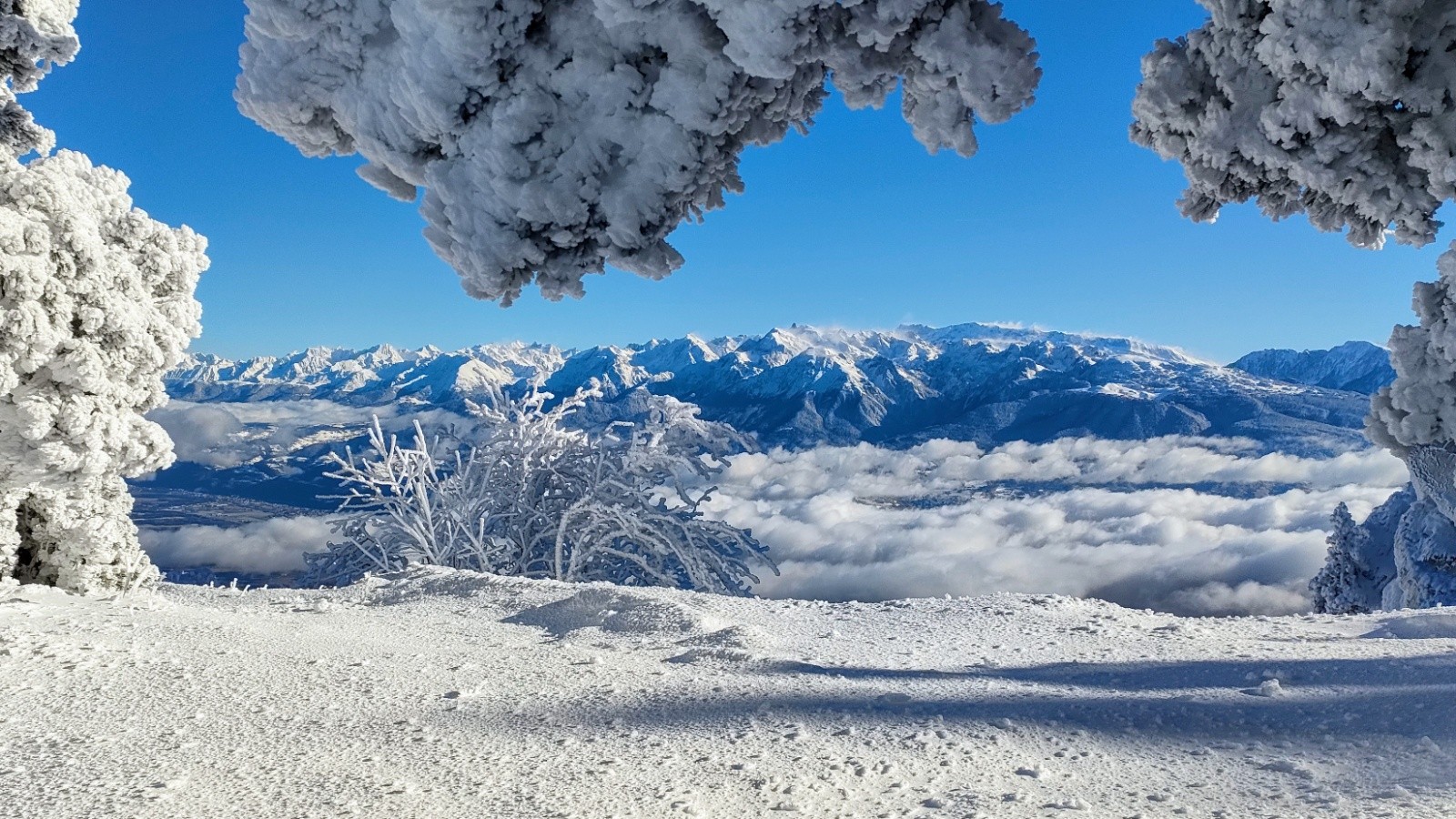 Bientôt la couche de poudre légère recouvre le moindre interstice, nous évoluons dans un environnement doux comme l'andantino du deuxième mouvement, comme si nous étions suspendus dans l'espace au cœur d'une nature silencieuse et figée dans le temps. A l'approche du sommet, la forêt s'éclaircit pour nous offrir une galerie de blanches statues pareilles à des commandeurs qu'un vent furieux a dû façonner ces derniers jours. La vue depuis la table d'orientation est singulière, alors qu'autour de nous tout est glaces et rocs, s'étend sous nos pieds une vallée verdoyante d'un contraste insolent !