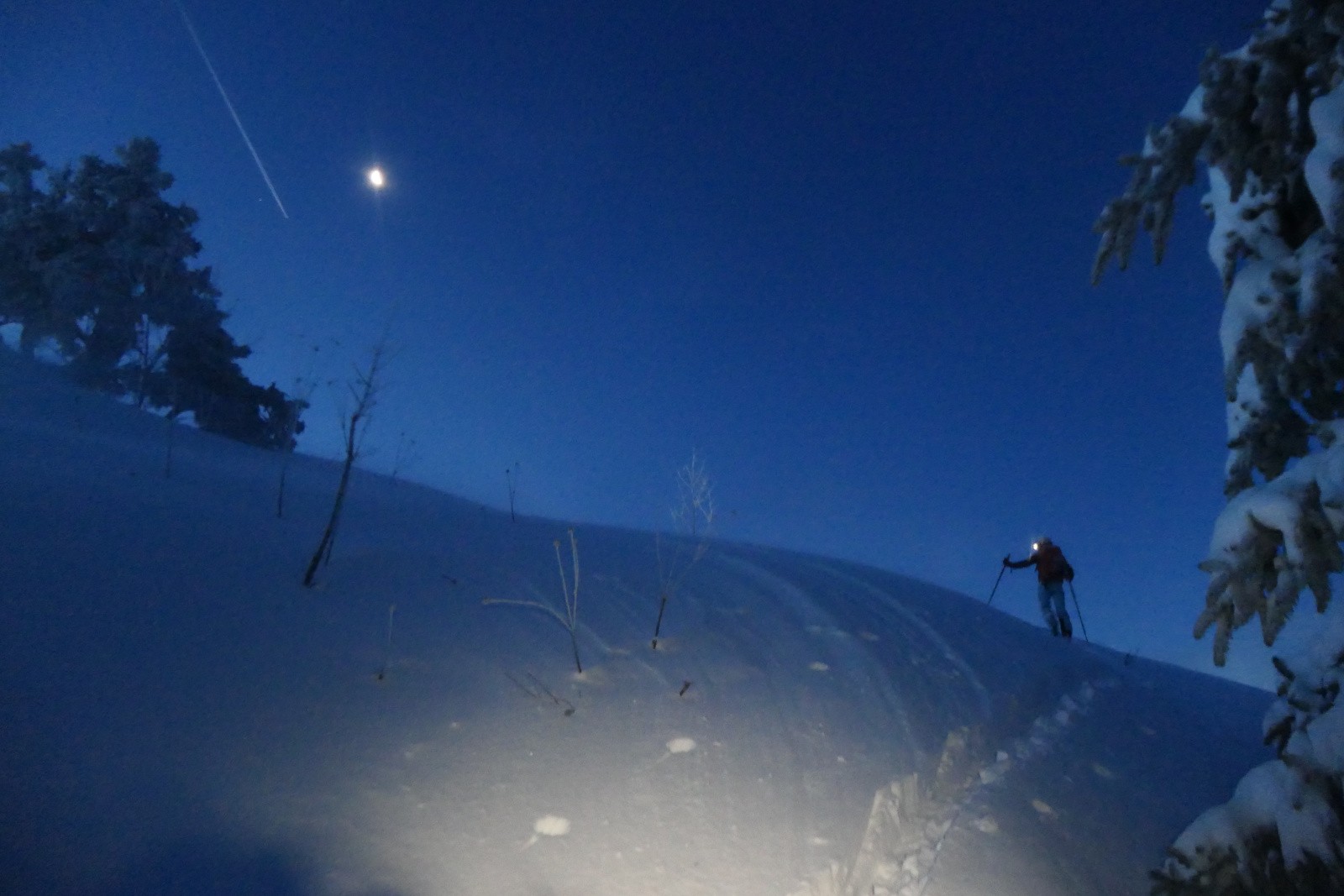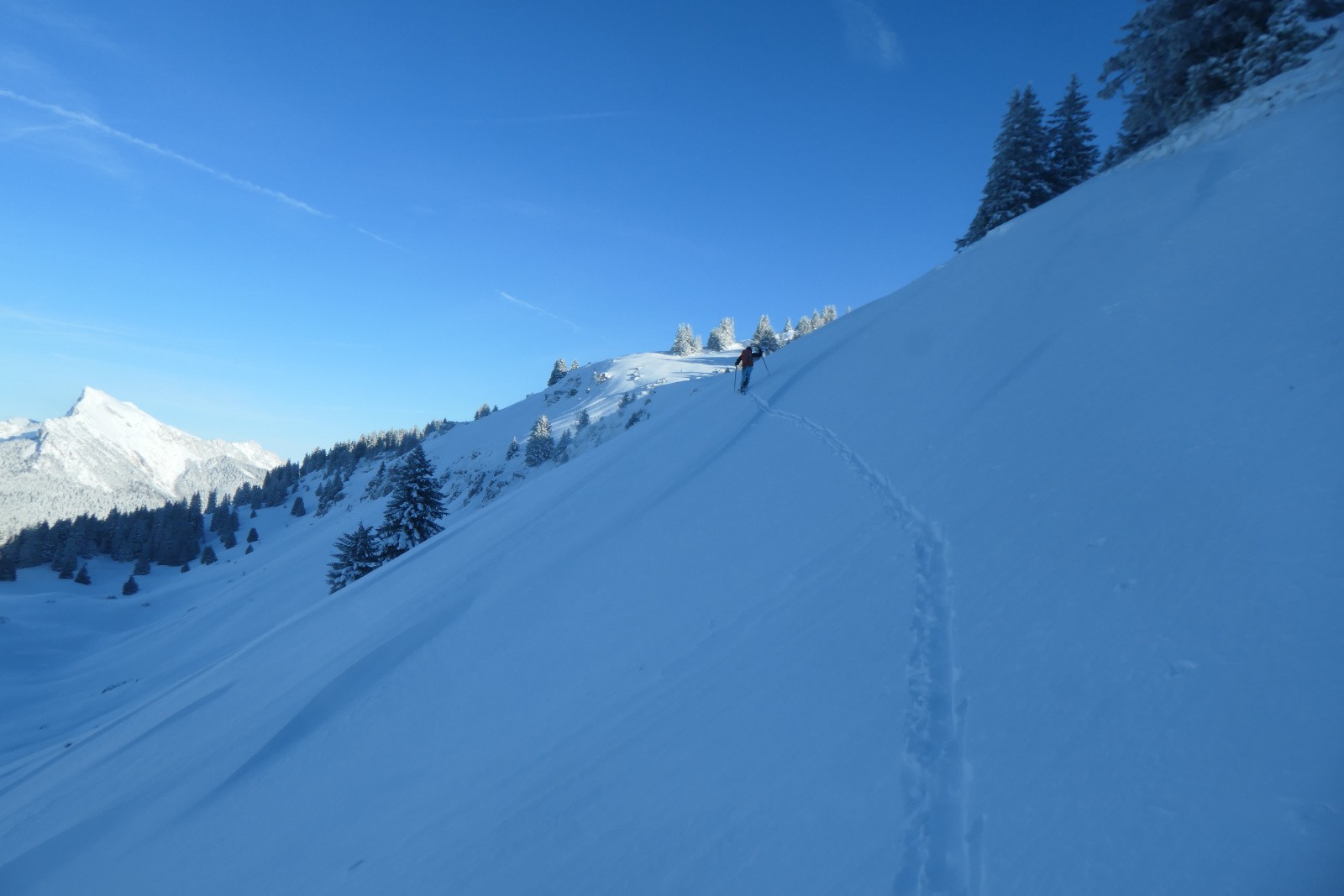 Descente magique dans la forêt tout poudre jusqu'à 1200m. On attaque la remontée sur Pravouta par le chemin. Pas la meilleure idée du jour, un passage assez escarpé et voilà les peaux qui se font la malle. On perd un peu d'énergie et pas mal de temps, on devine déjà le savon que va nous passer mère grand. On mise tout sur les attaches des peaux et on poursuit, optant pour la stratégie : celui qui perd ses peaux, laisse la trace. Une bonne façon de se relayer ! On sort enfin de la forêt, on se dit que vu l'horaire on va plutôt tirer au plus court par le col et shunter le sommet.