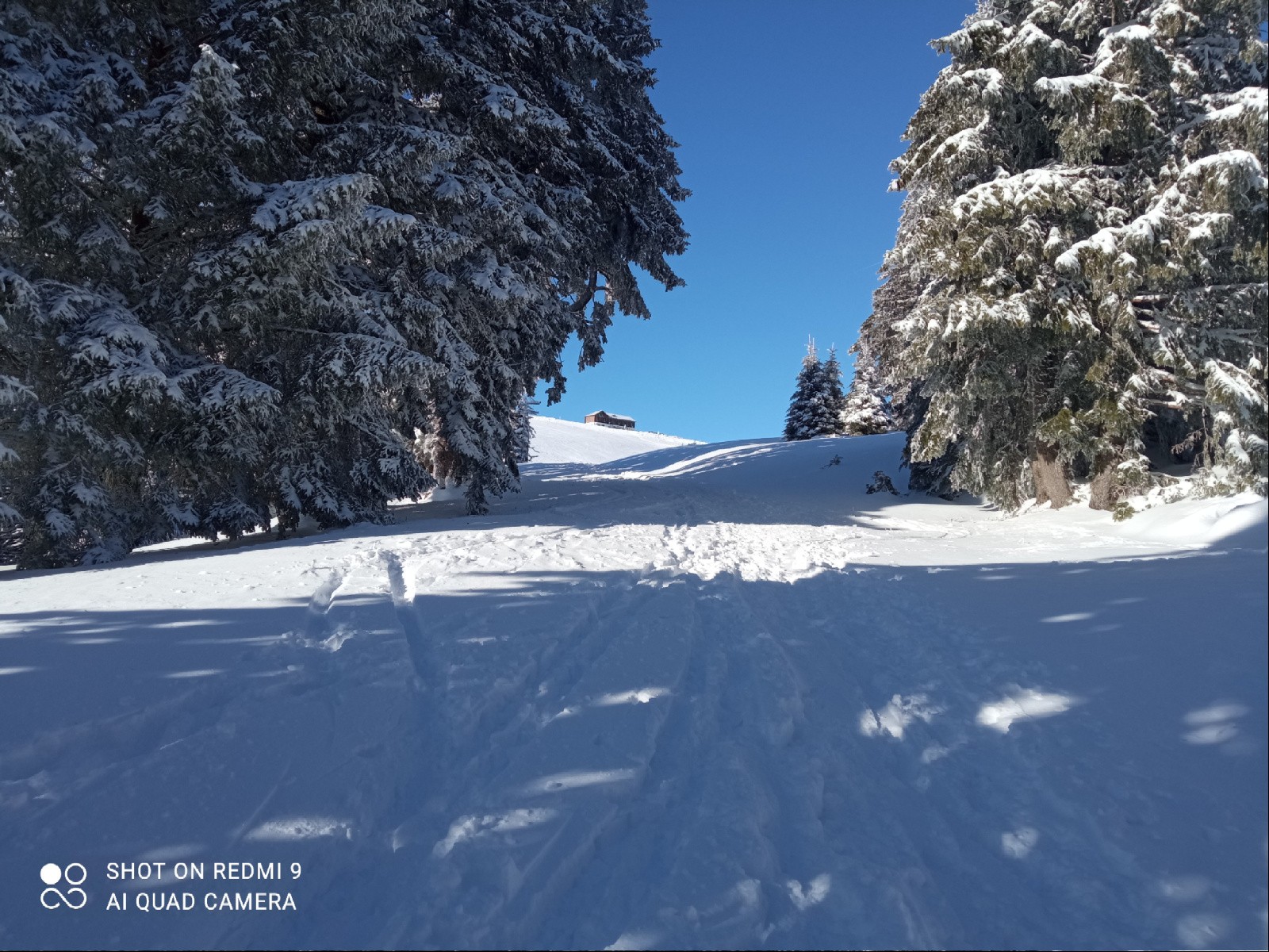 N'arrivant pas à savoir si la station va être ouverte après cet épisode neigeux, nous prenons les peaux, du coup, nous improvisons un petit circuit de visite de la station, alors que pistes ont été damées et sont tout à fait bien enneigées. Comprendra qui voudra la logique qu'il y a, à n'ouvrir que les téléskis débutants du versant Annecy.....
