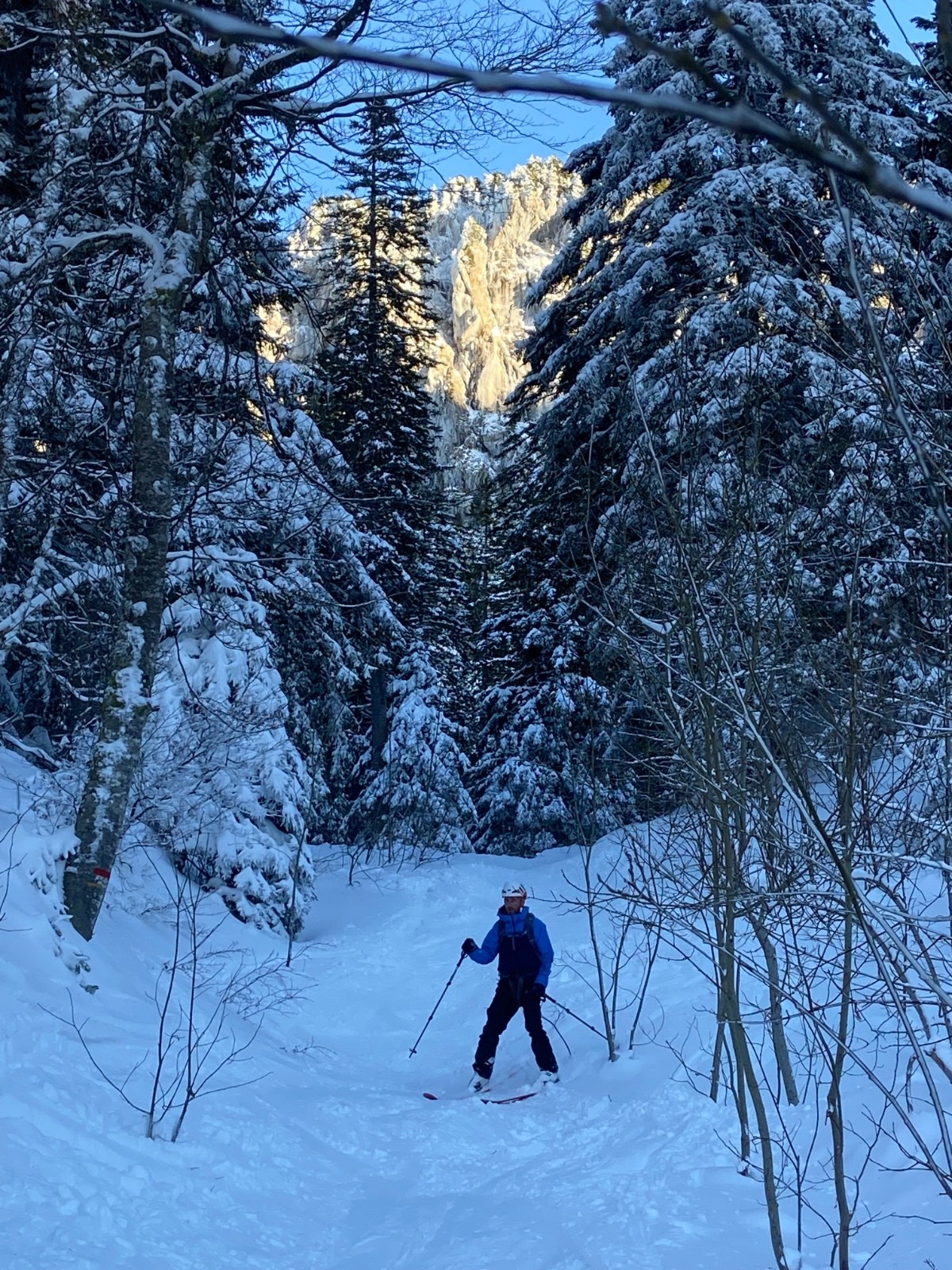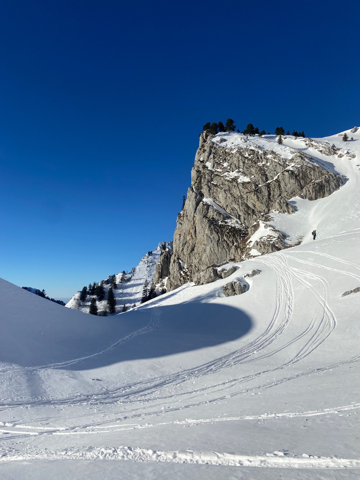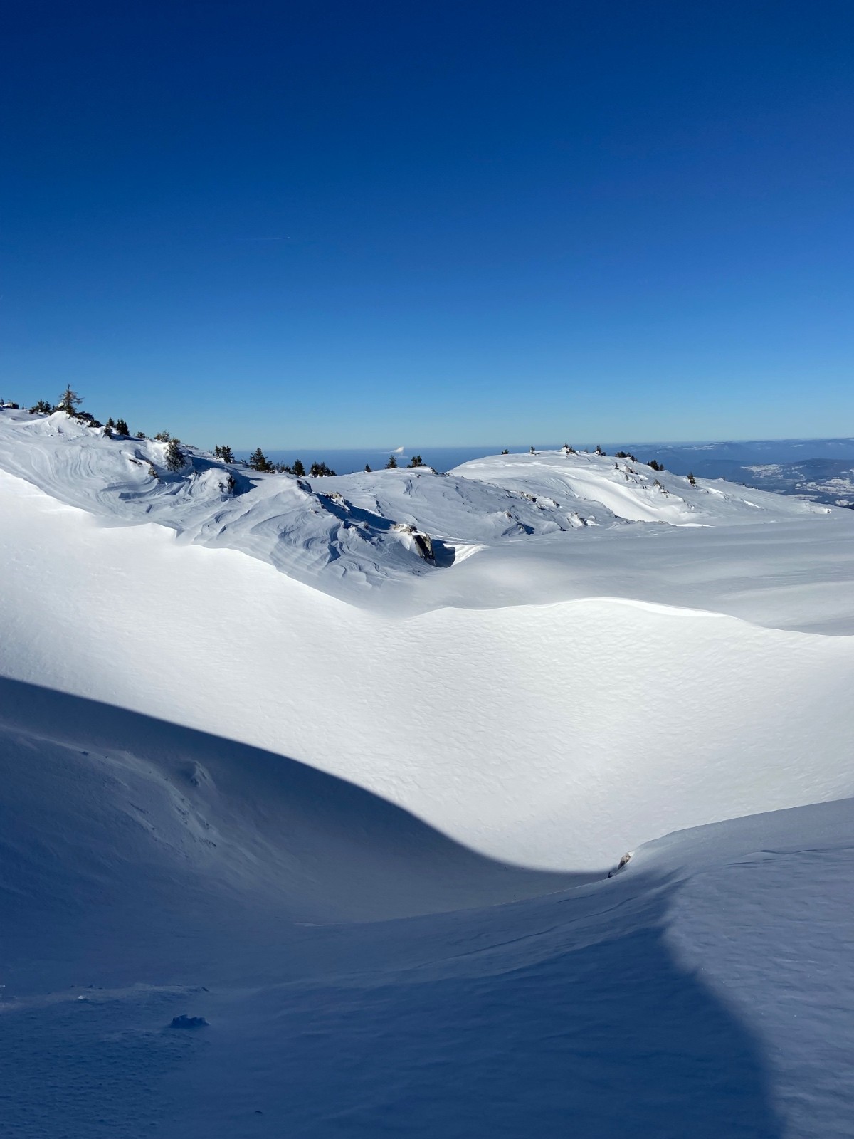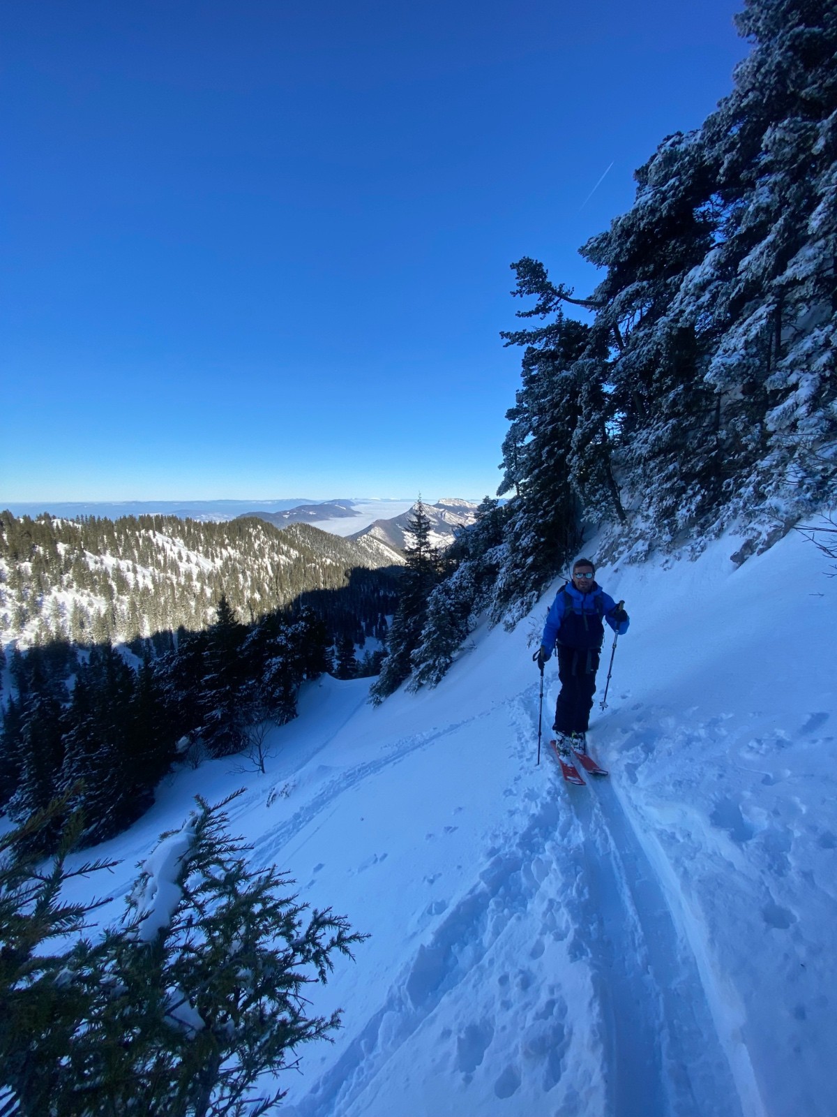 On remonte le sentier des moutons qui nous emmène tranquillement jusqu’au sommet du Grand som pour profiter de la vue et du picnic, à base de restes de Noël. On enquille la bien bonne descente en ouest sur le Habert de Bovinant avant d’enchaîner ensuite avec le Mauvernay ; en essayant de rester le long de la forêt on trouve un peu de poudre compactée, mais ce n’est pas la grosse poudreuse qu’on aurait pu attendre. Dernière remontée tranquille au Petit Som et dernière descente directement dans la combe de Lechaux. Très bonne là encore en poudre compactée assez joueuse puis vient la forêt qui a conservé la meilleure poudre. Un régal !